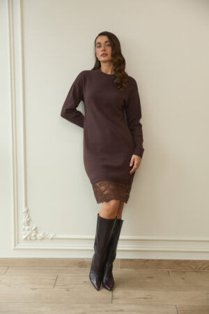 Сукня гладкої в’язки з мереживом у кольорі шоколад