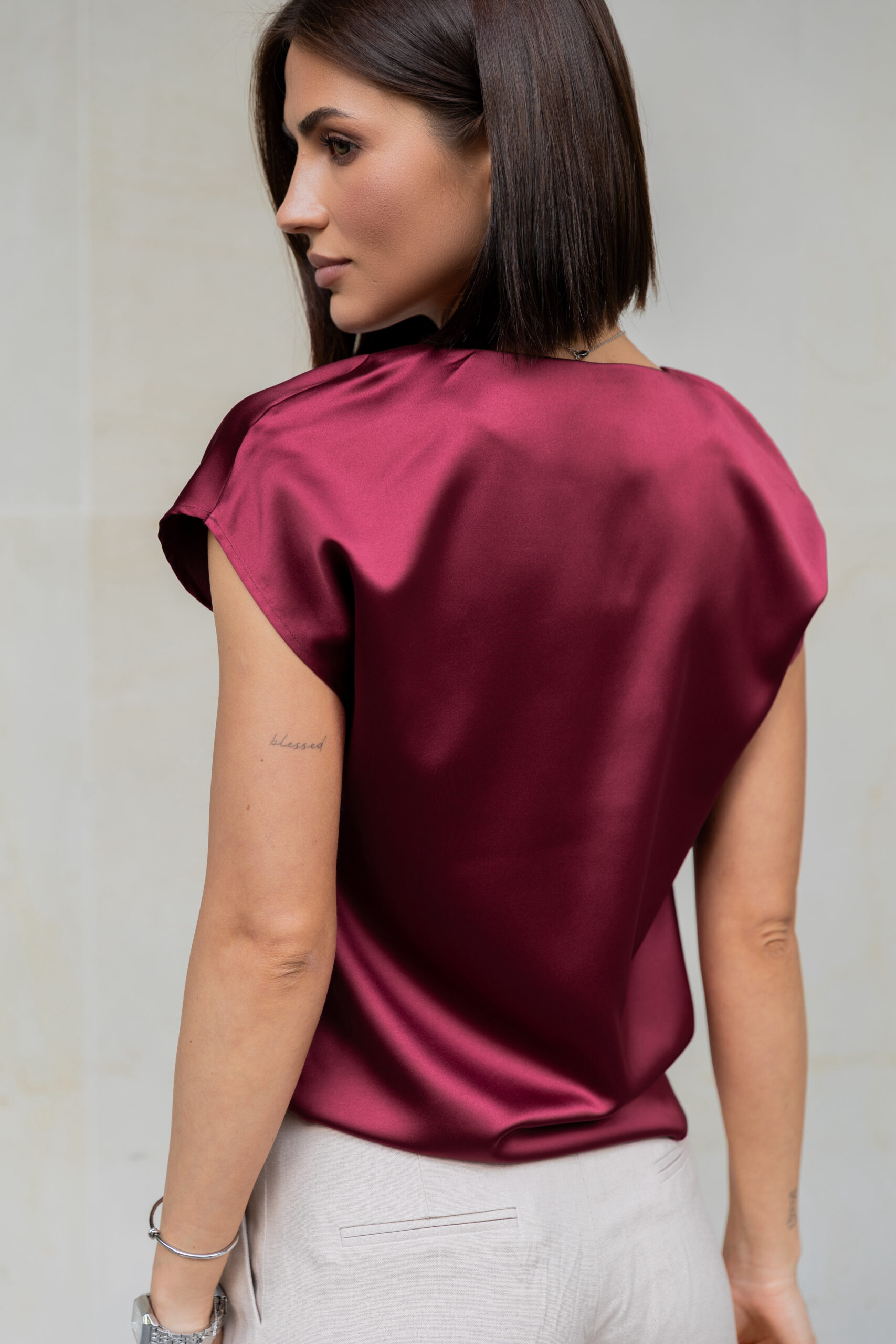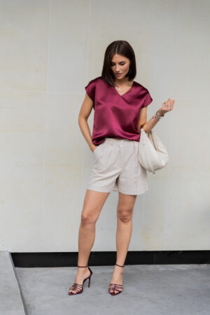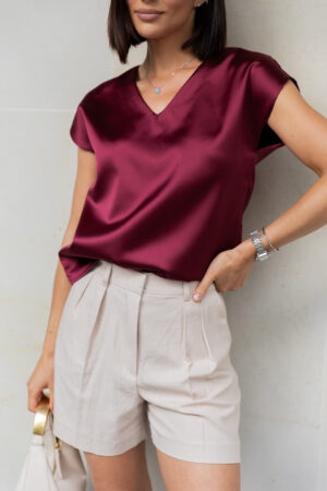 Жіноча атласна блуза кольору бургунді з коротким рукавом — це втілення сучасної елегантності. Глибокий винний відтінок, блискуча атласна фактура та прямий крій роблять цю модель універсальною: і для роботи, і для вечора, і для особливих подій.