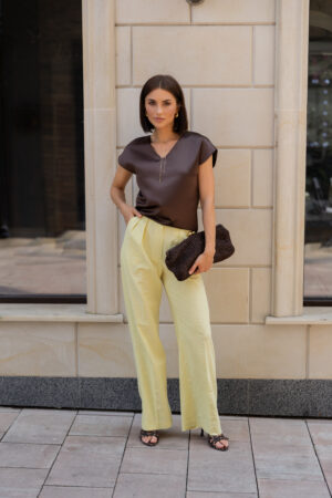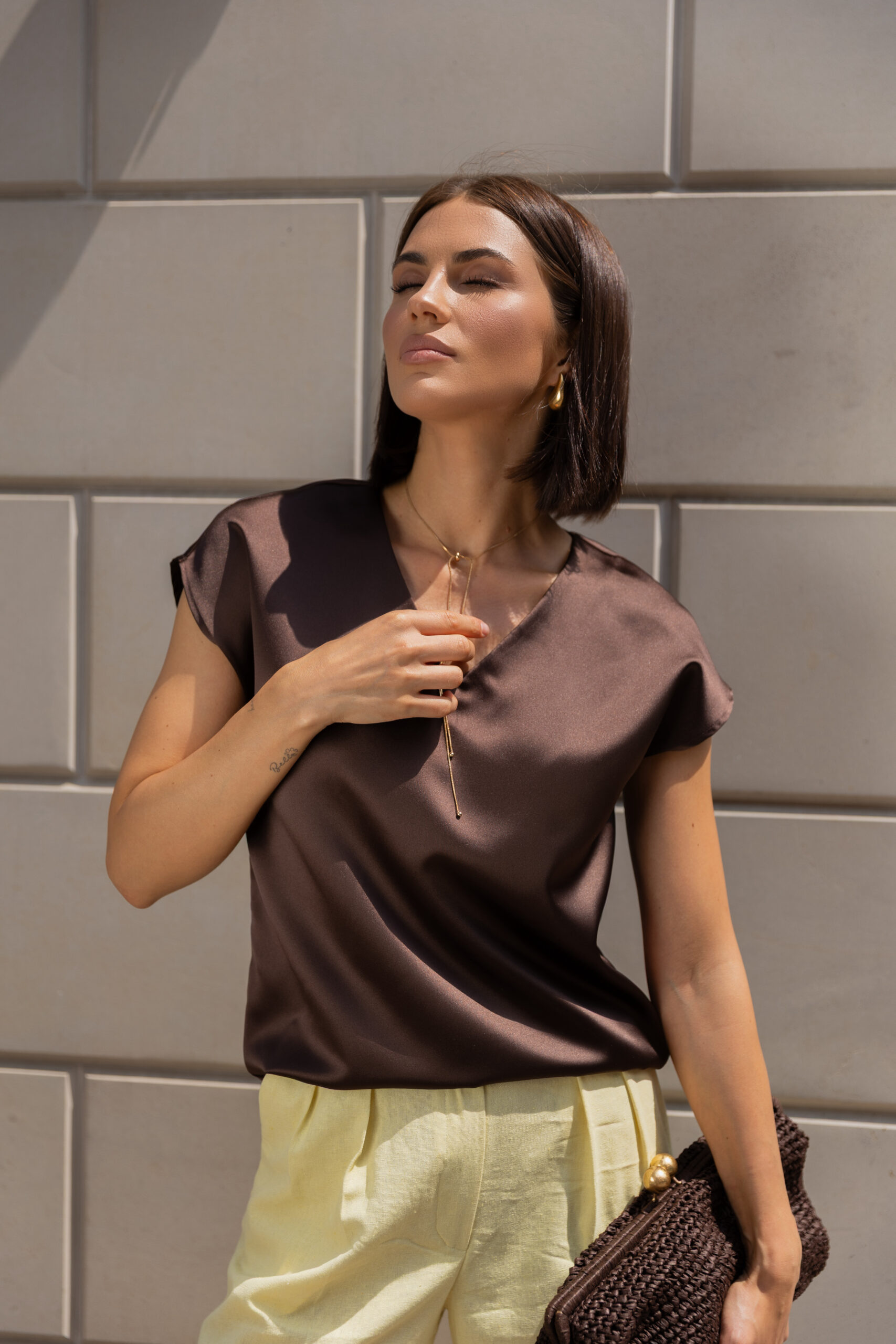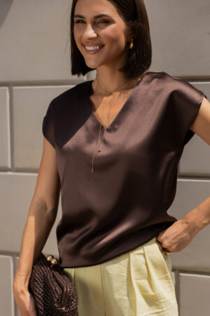 Ця жіноча атласна блуза шоколадного кольору — справжній маст-хев для капсульного гардероба. Вона легко комбінується: