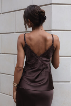 Ця атласна майка кольору шоколад — гармонія глибини, стилю та чуттєвості. Вона створена для жінок, які хочуть виглядати елегантно щодня, не втрачаючи легкості й свободи.
