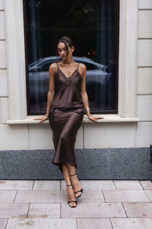 Атласна майка кольору шоколад — глибока елегантність у кожному русі