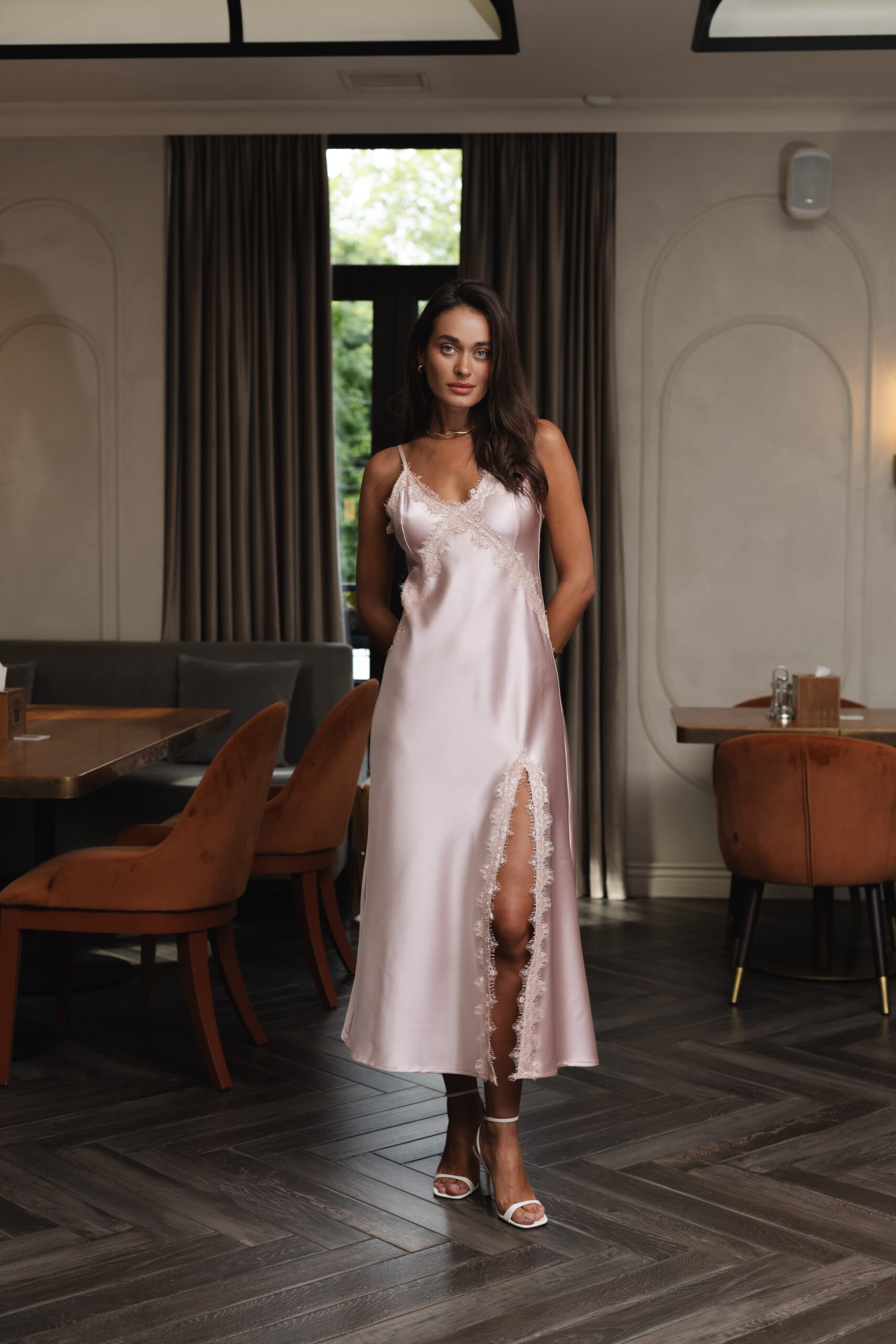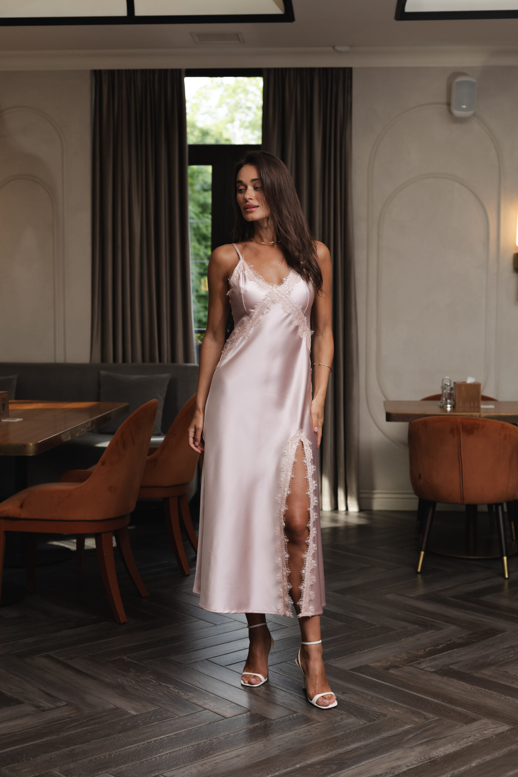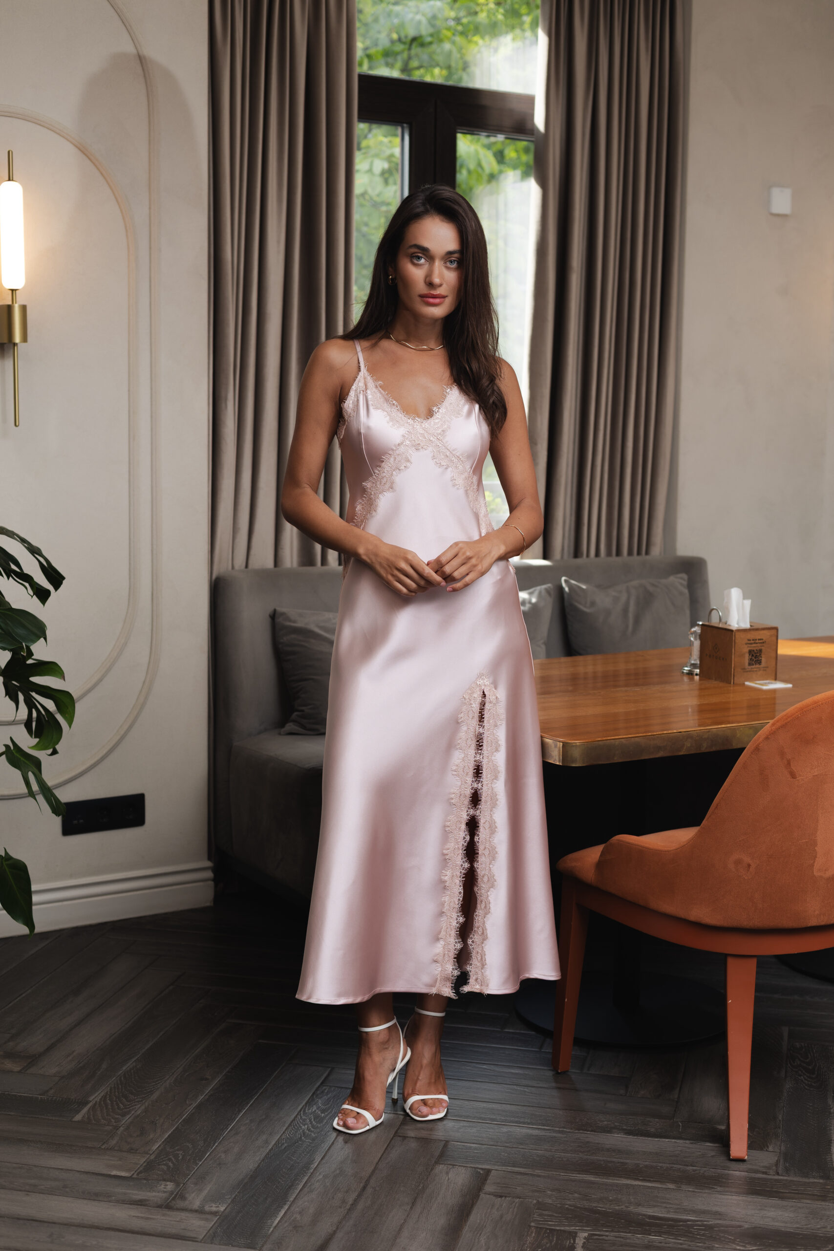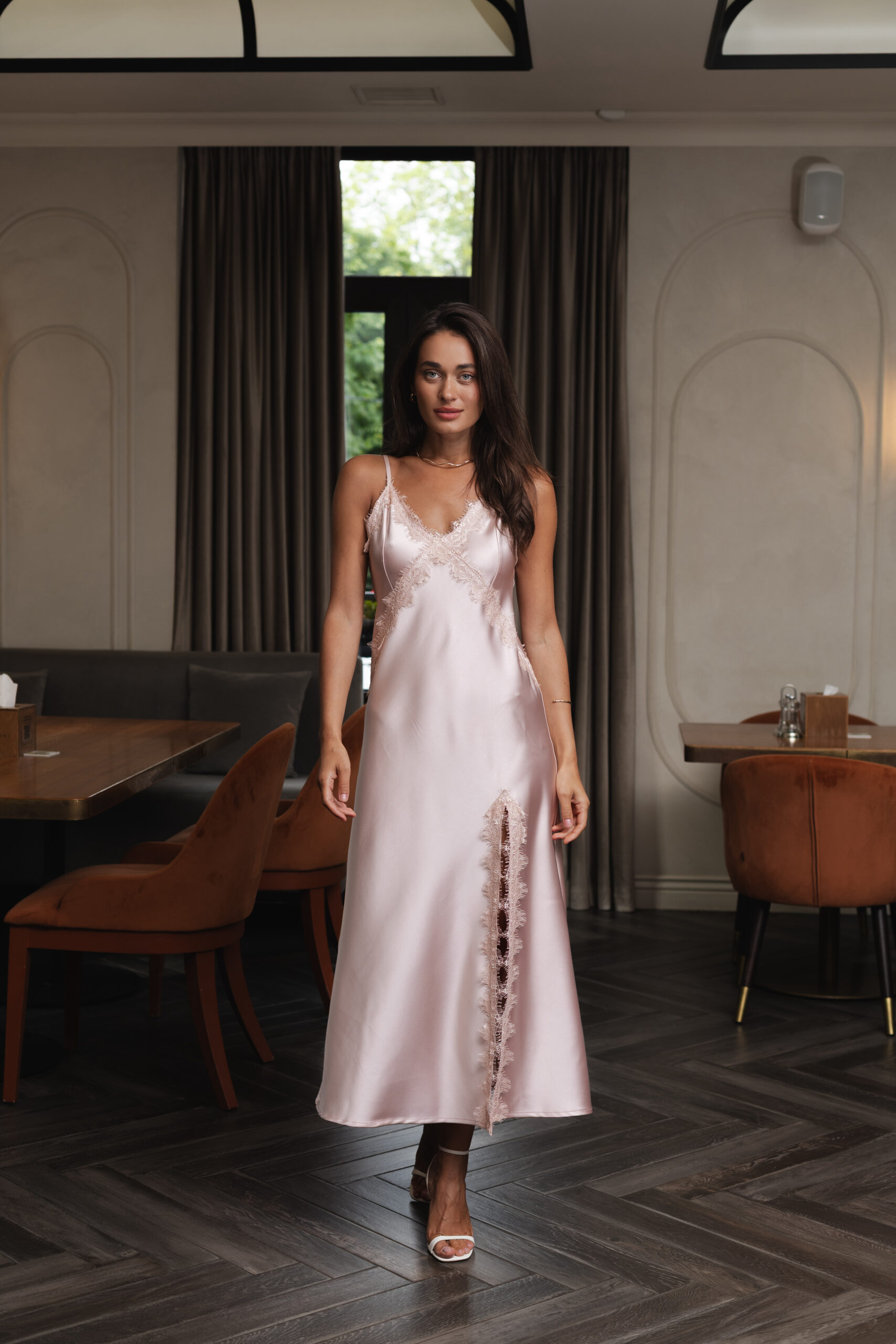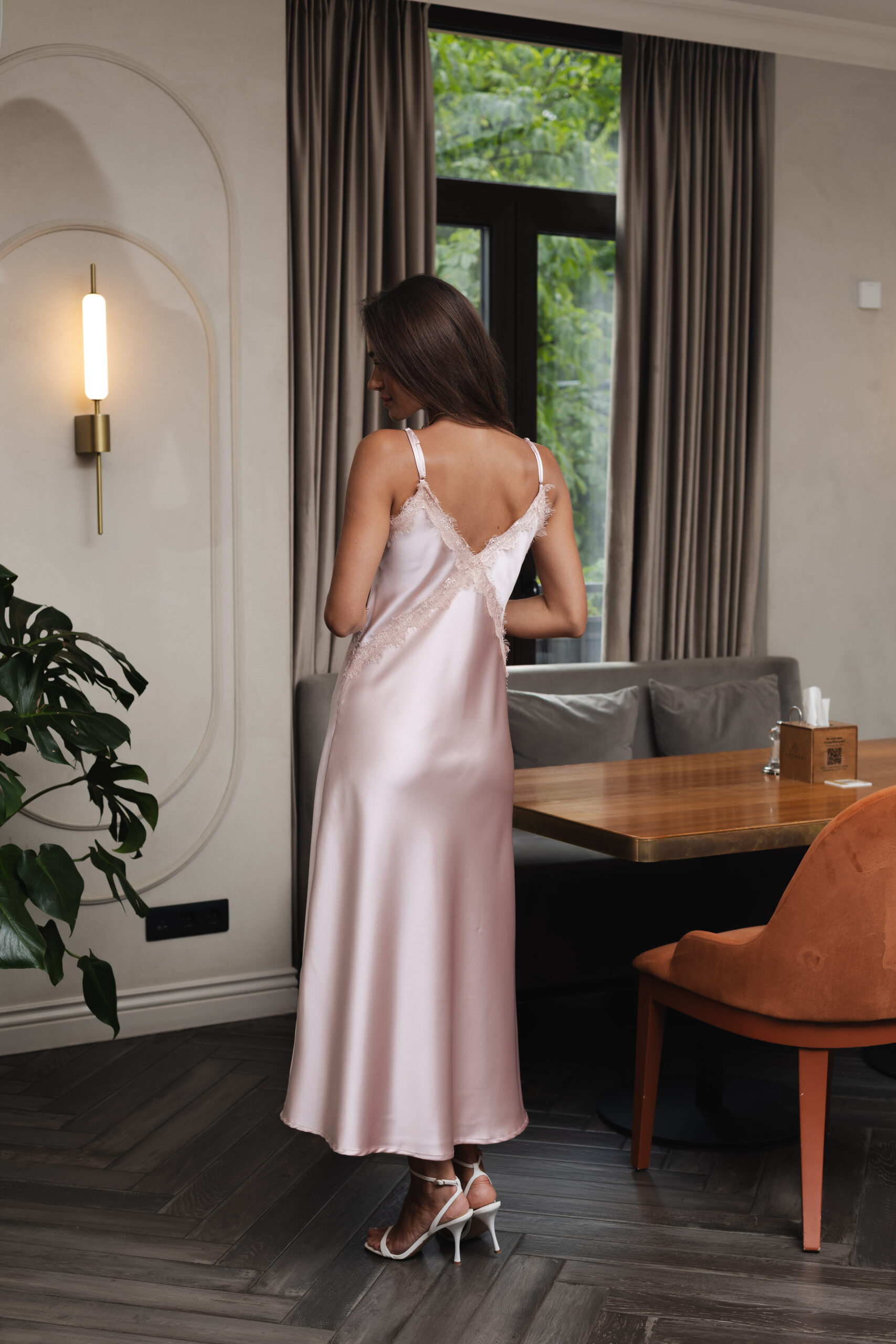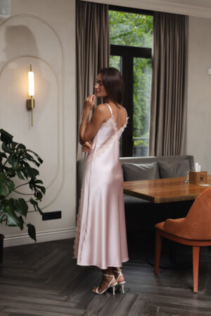Ця ніжно-рожева сукня-комбінація з атласу — як перший світанок: м’яка, тиха, чарівна. Її благородний блиск, тендітний крій і легкість створюють образ мрії — жіночний, чуттєвий, елегантний. Це саме та сукня, яку надягаєш не для когось, а щоб відчути себе особливою.