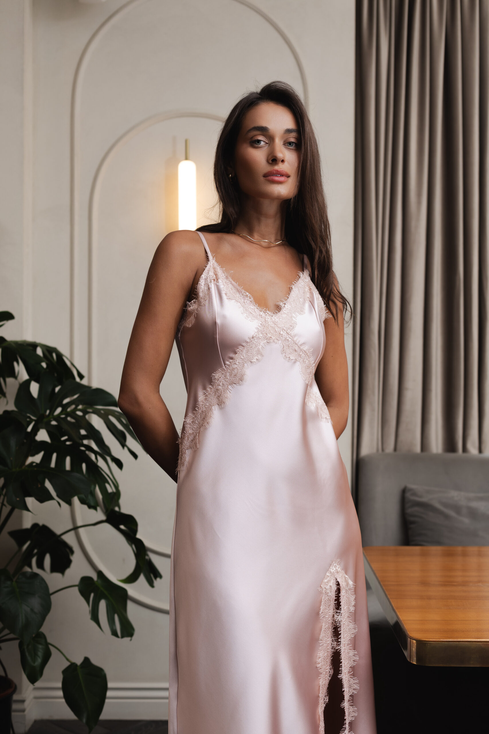 Пудровий рожевий відтінок робить цю сукню універсальною: він підходить до будь-якого тону шкіри, надає обличчю свіжості й виглядає розкішно як вдень, так і ввечері.