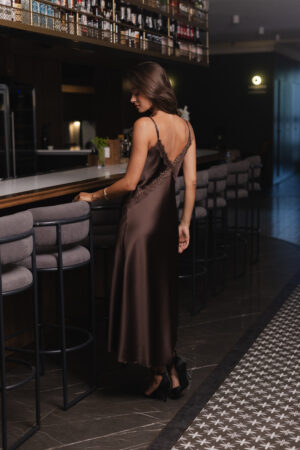 Шоколадна атласна сукня — вишуканість у кожному русі