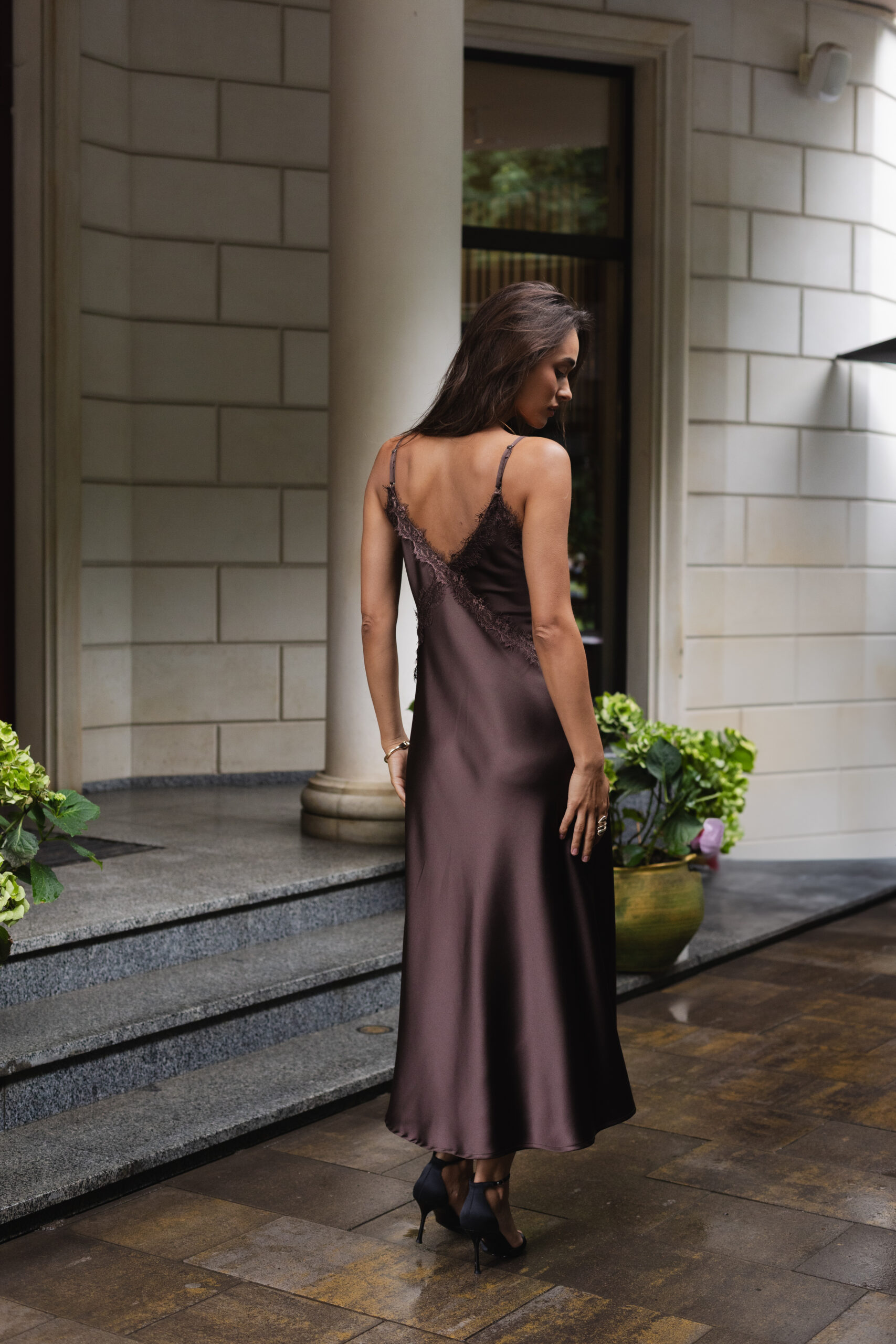 Шоколадна атласна сукня-комбінація легко трансформується під будь-який настрій: