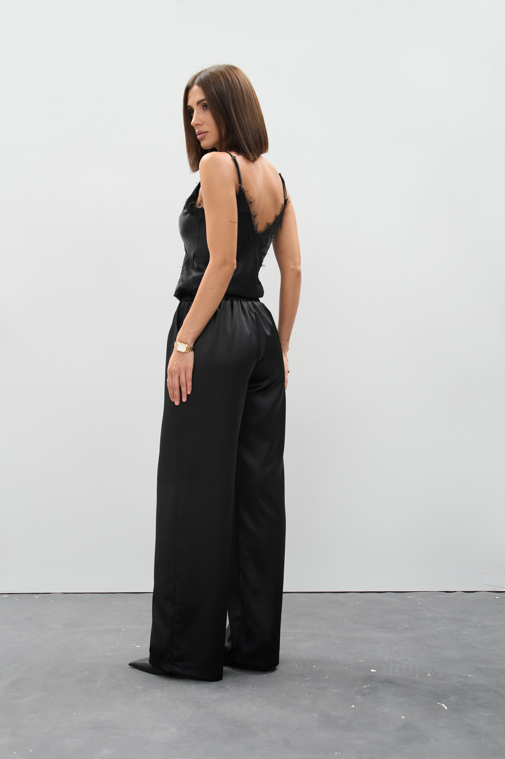 Атласна текстура додає глибини класичному чорному кольору, перетворюючи простий елемент гардеробу на елегантну заяву. Палаццо — це не просто тренд, а стиль, який підкреслює індивідуальність.