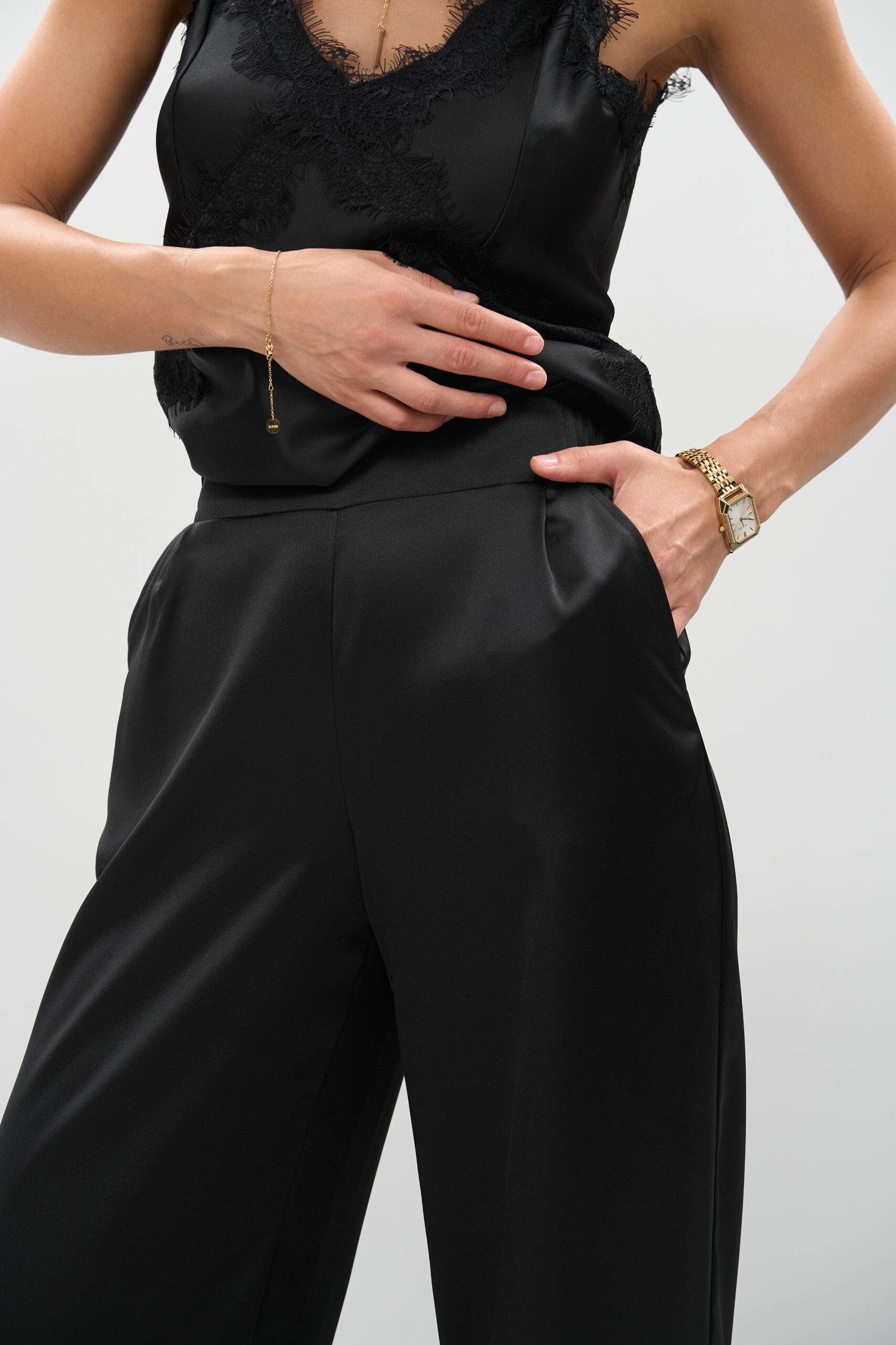 Тканина струмлива, не сковує, легко лягає по фігурі й надає штанам витонченого вигляду. Ідеальна як для спекотного дня, так і для вечірньої події — виглядає розкішно як у природному, так і в штучному світлі.