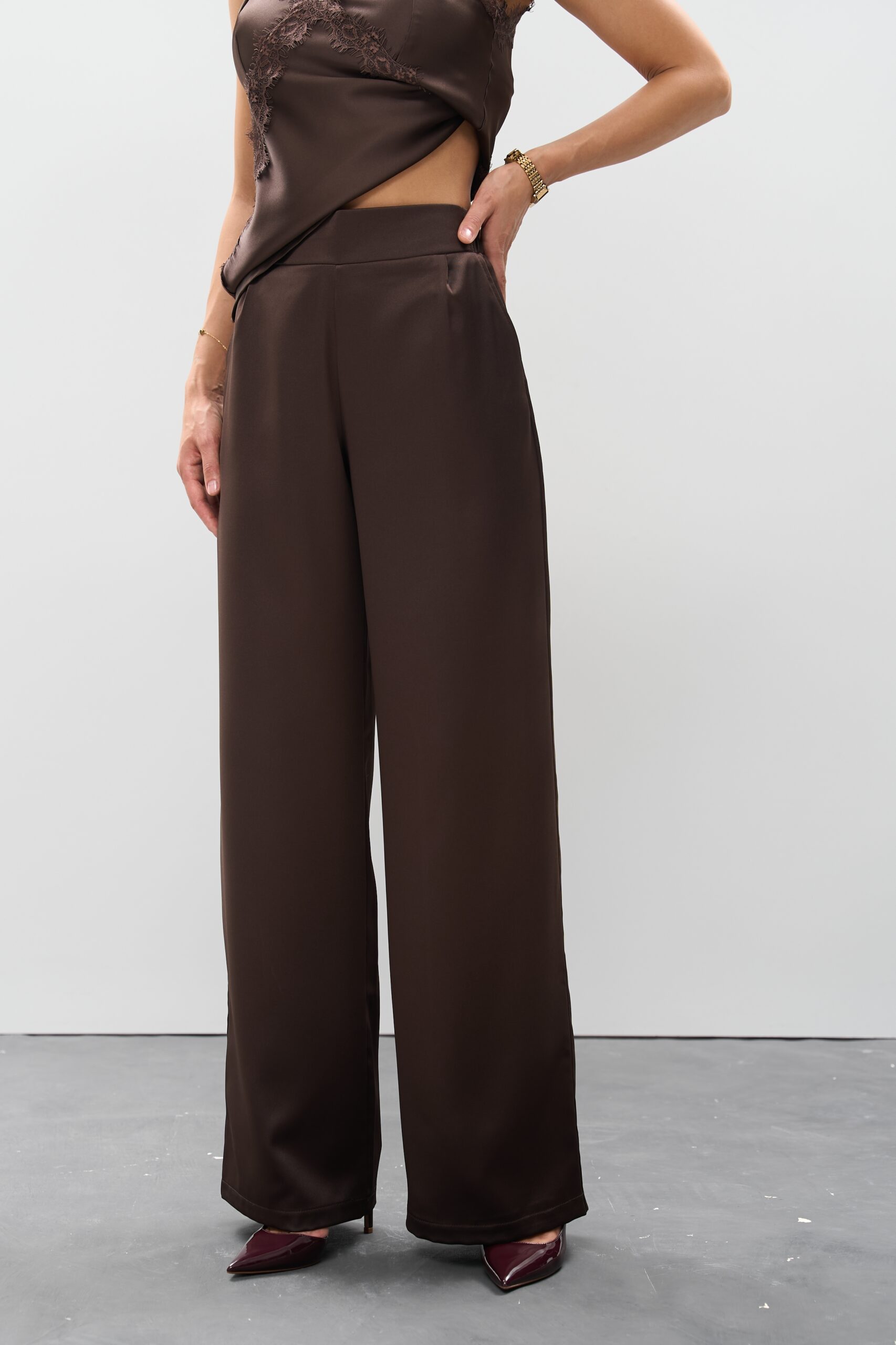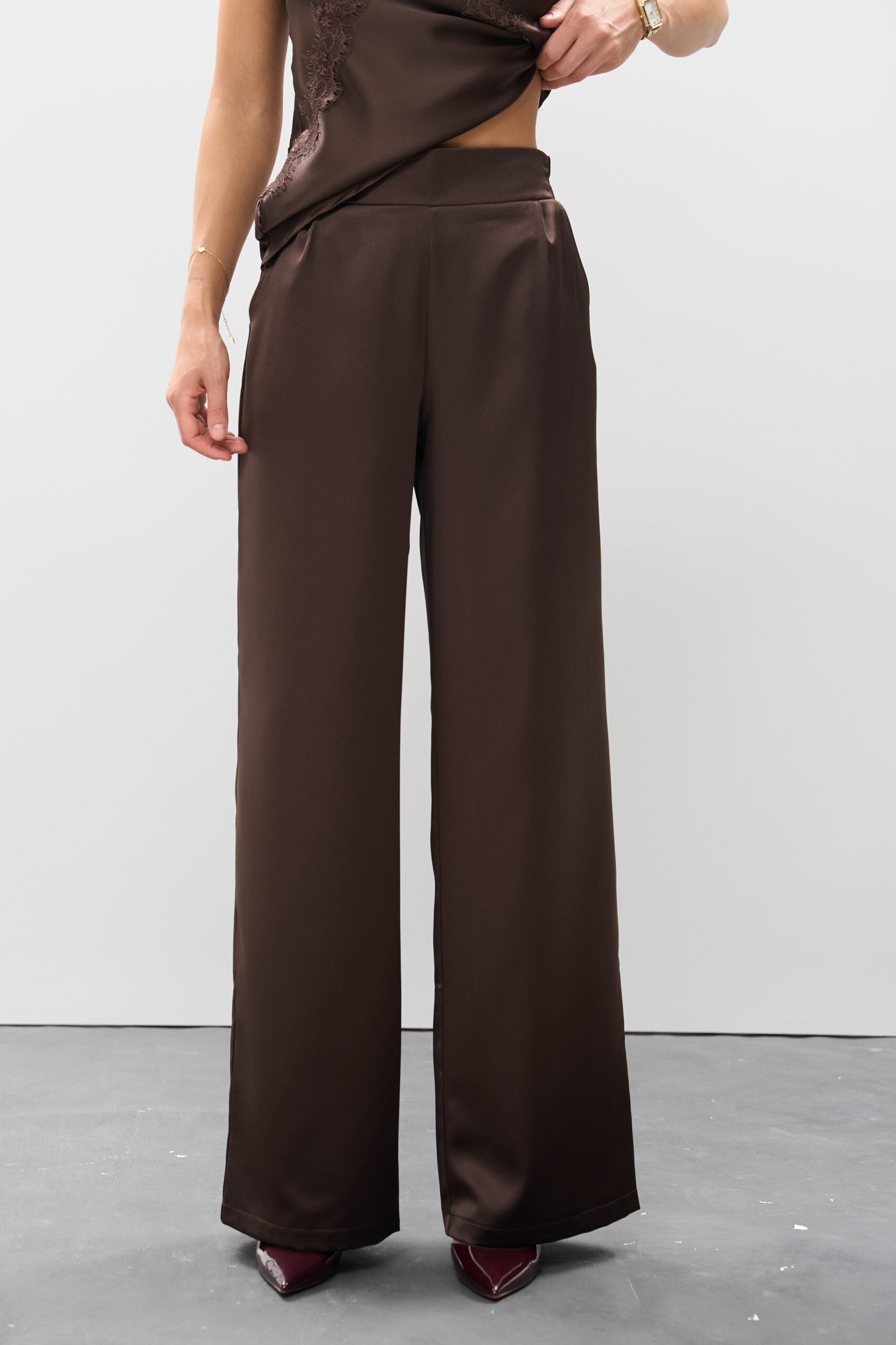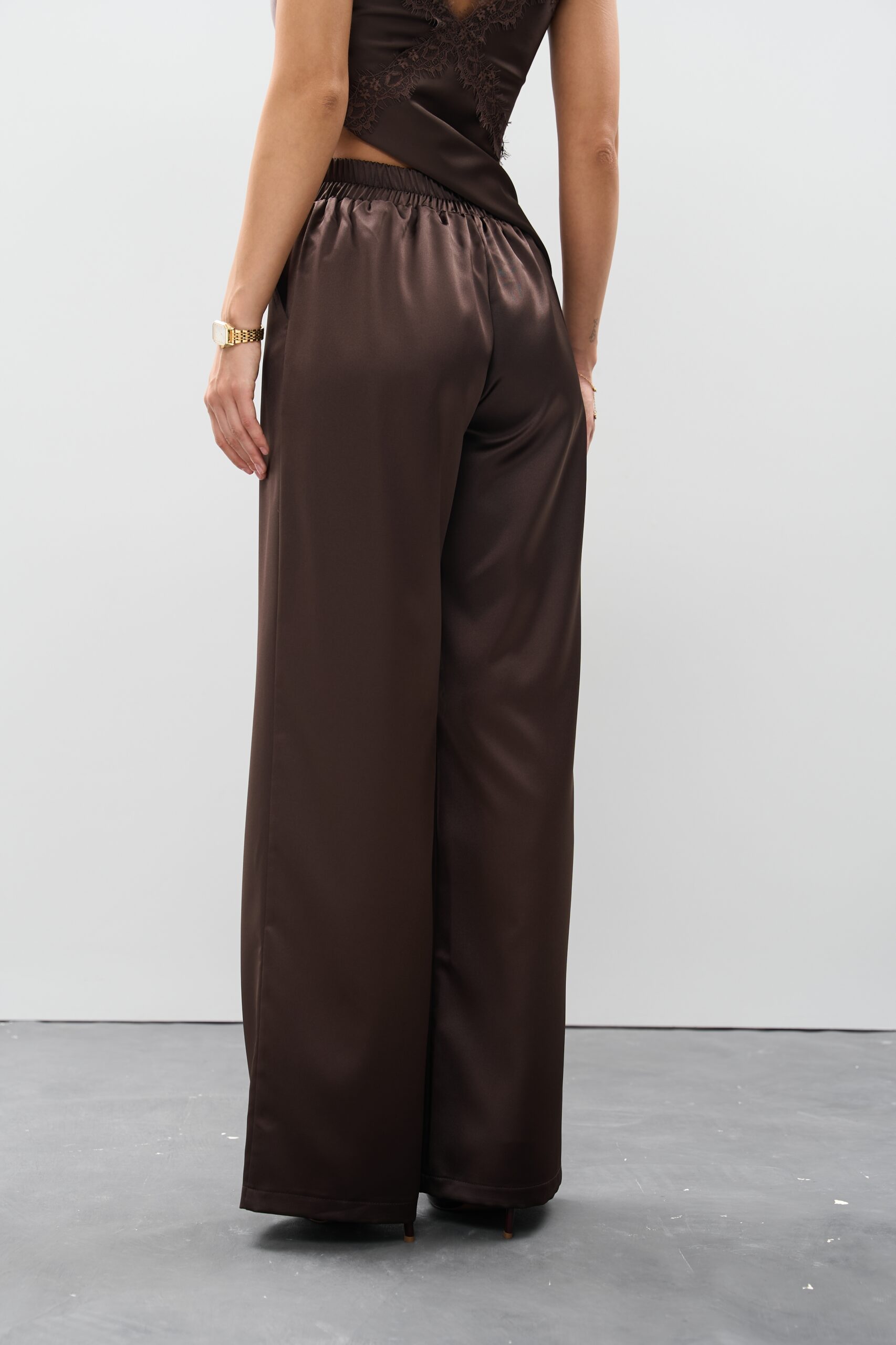 Ці атласні штани шоколадного кольору легко стилізуються: