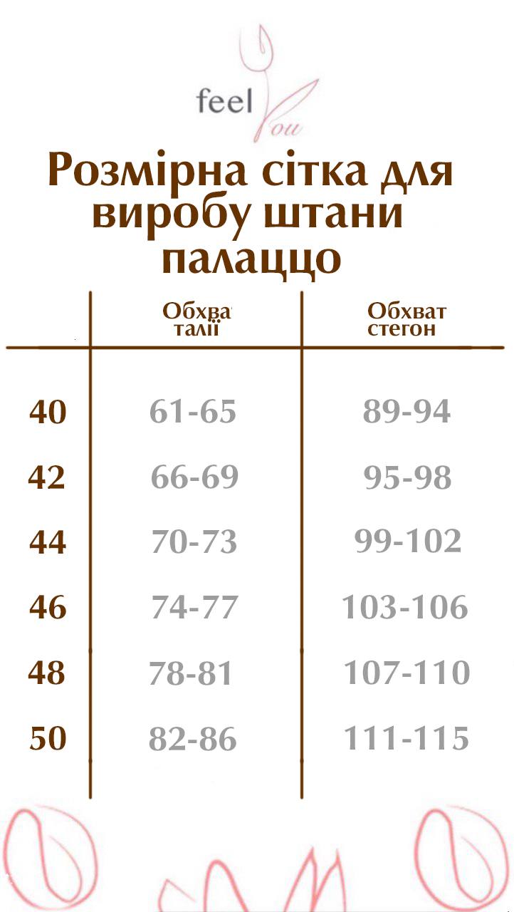 Штани доступні у розмірах: 40, 42, 44, 46, 48, 50. Завдяки гнучкій посадці по талії модель ідеально адаптується під різні типи фігури — від тендітних до жіночних.