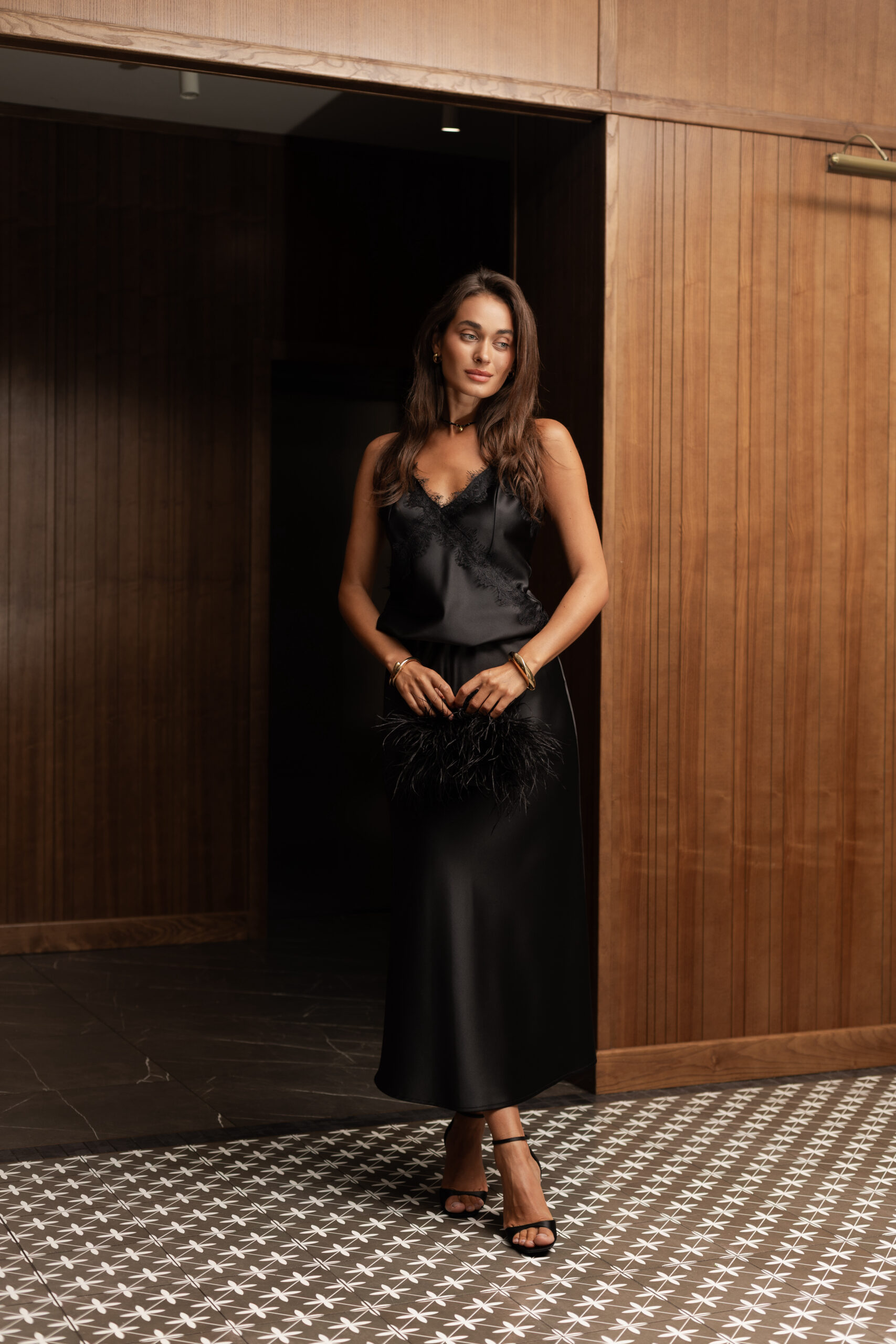 Цей жіночий атласний костюм чорного кольору — вишуканий образ для тих, хто цінує стриману розкіш. Комплект складається з атласної майки з мереживом та максі-спідниці з блискучої струмуючої тканини. Разом вони формують глибокий, гармонійний образ, що підкреслює жіночу силу, витонченість і сучасний стиль.
