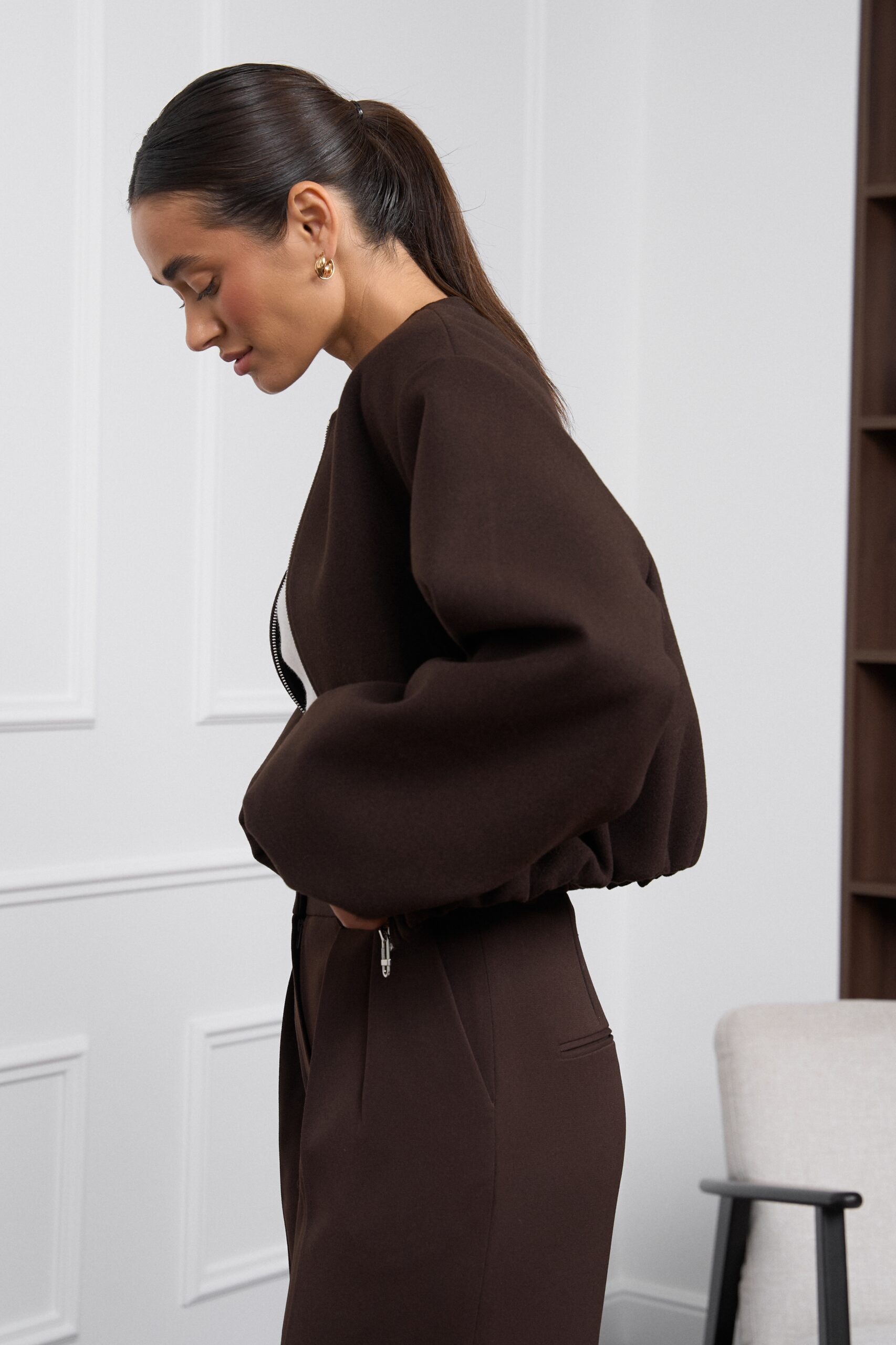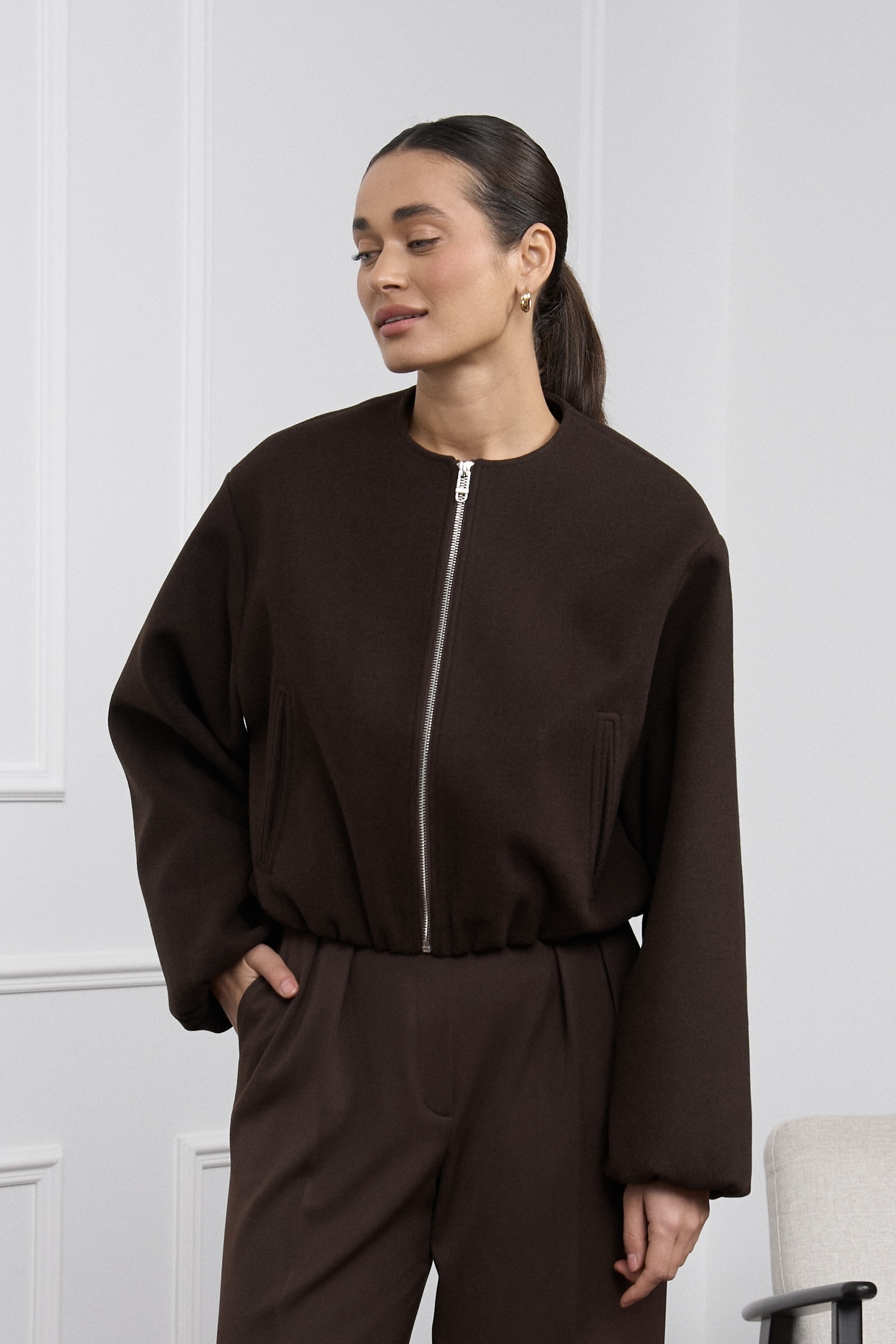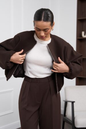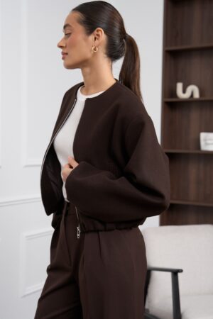 Прямий крій бомбера забезпечує комфорт і стиль, а спущена лінія плеча додає образу легкості і невимушеності. Пишні рукави на резинці створюють модний акцент, який привертає увагу і надає енергійного вигляду. Така модель підходить для будь-якої події: від прогулянок до офісних зустрічей і вечірніх виходів. Цей бомбер стане чудовим доповненням до вашого весняного гардеробу.