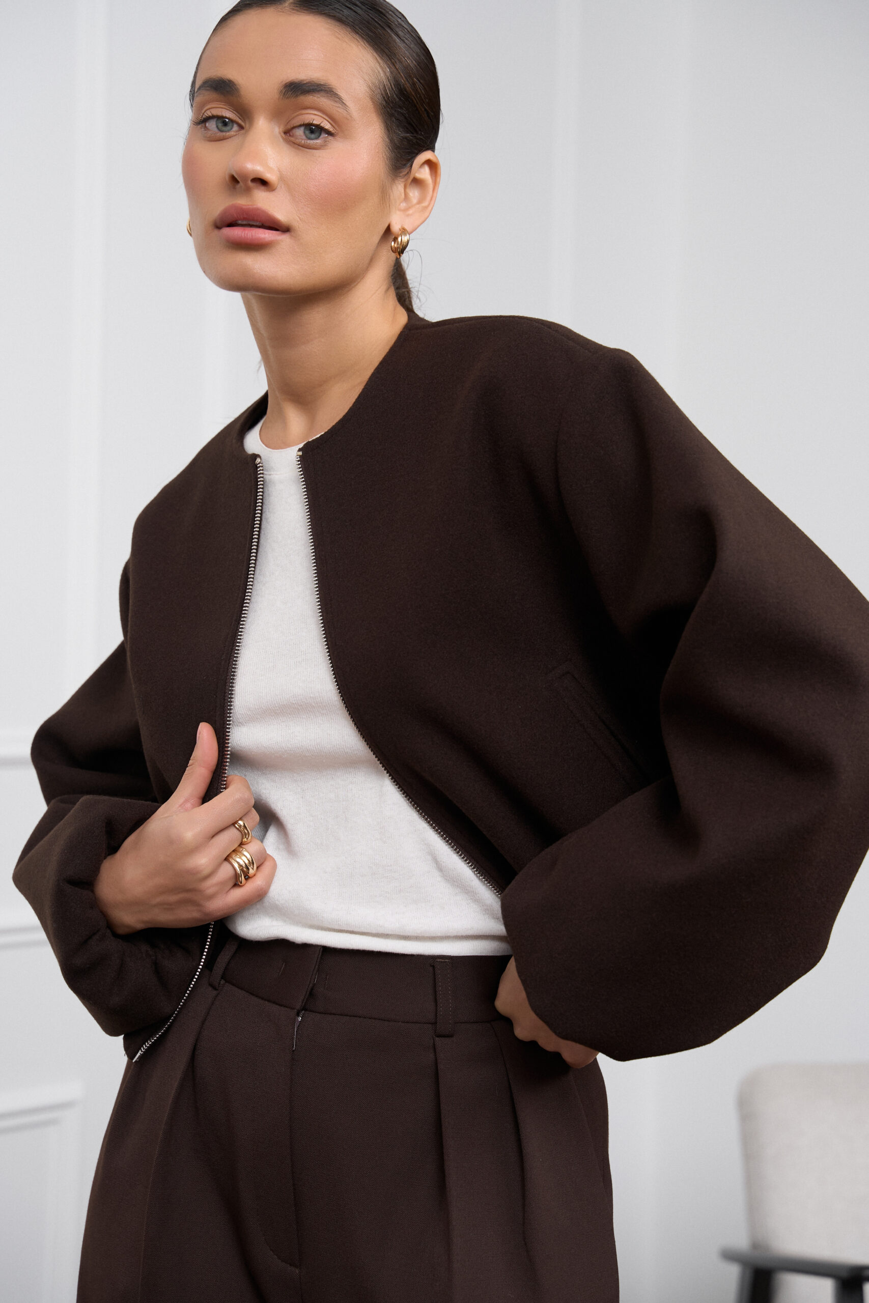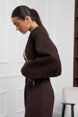 Цей бомбер з акцентними рукавами — універсальний та стильний елемент для будь-якого образу. Легкий для комбінування з іншими речами, а прямий крій з пишними рукавами додає елегантності і сучасного вигляду. Завдяки спущеній лінії плеча та резинкам на рукавах і низу, бомбер виглядає модно і створює ефектний силует, який підходить як для повсякденних, так і для більш елегантних образів.