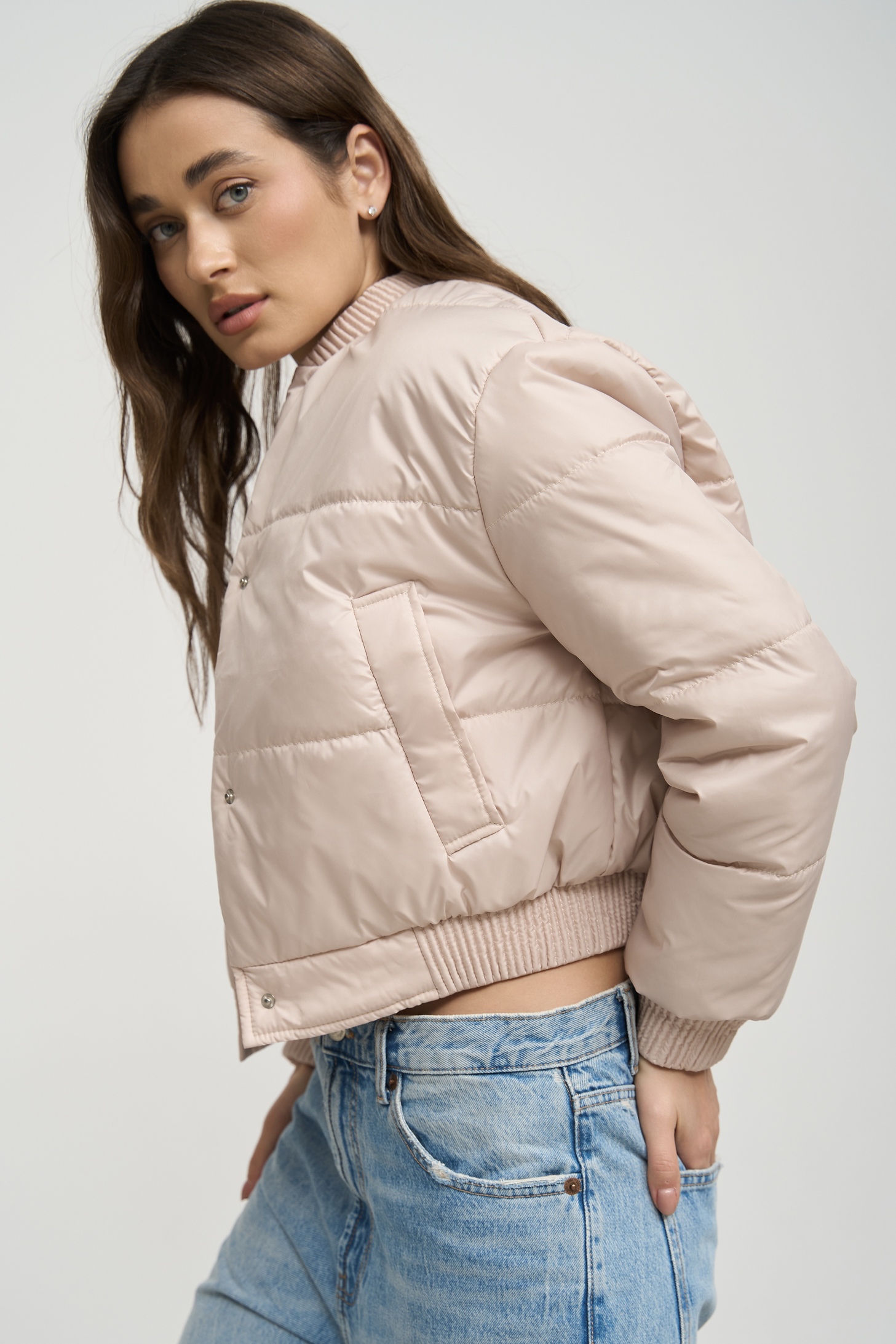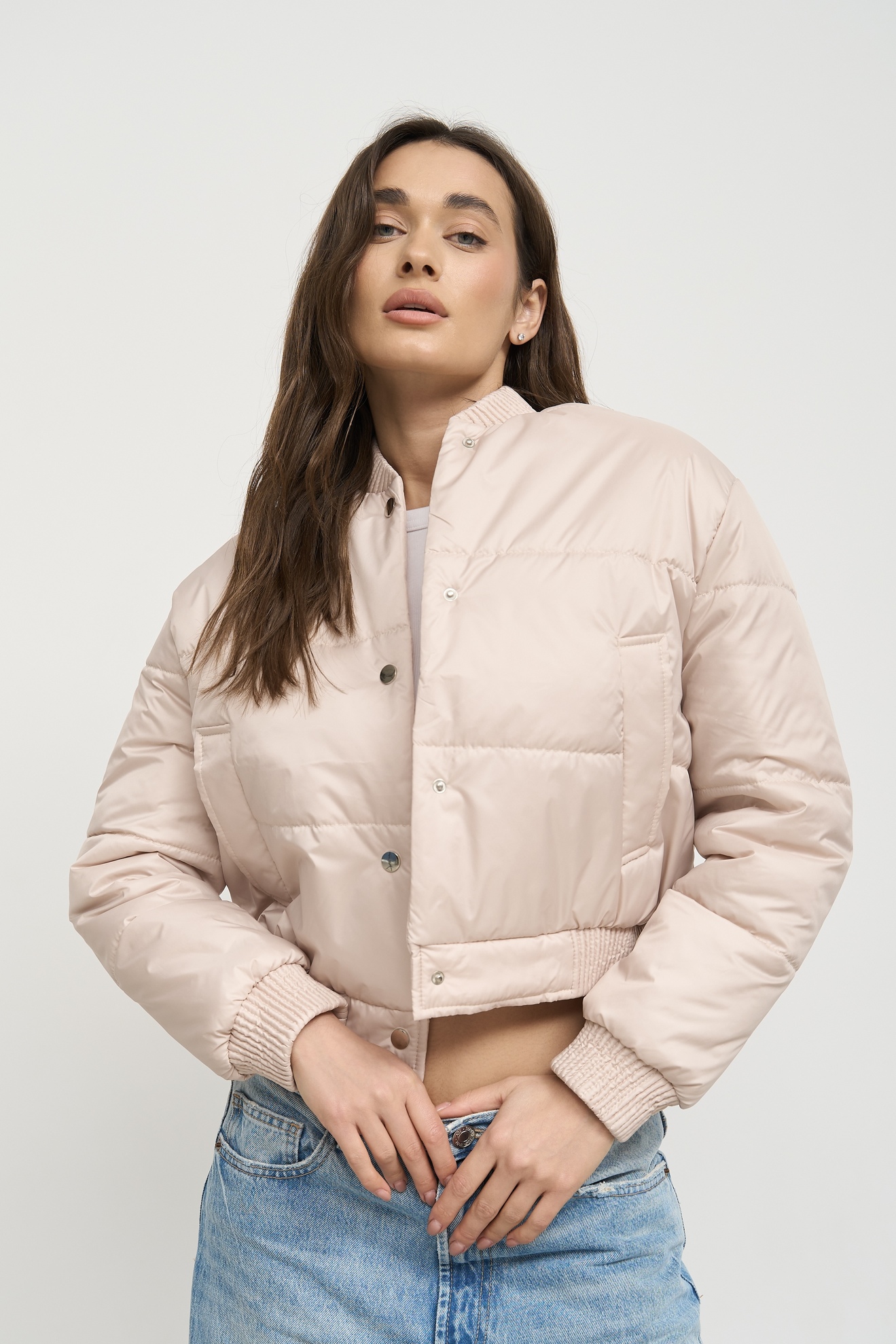 Особливу увагу варто звернути на деталі та оздоблення. Бомбер має дві бокові кишені, які не тільки додають йому практичності, але й служать стильним акцентом. Декоративні манжети на комірі, рукавах та внизу куртки надають їй завершеного вигляду та додають вишуканості. Застібка на кнопки – це зручне та практичне рішення, яке дозволяє легко одягати та знімати куртку.