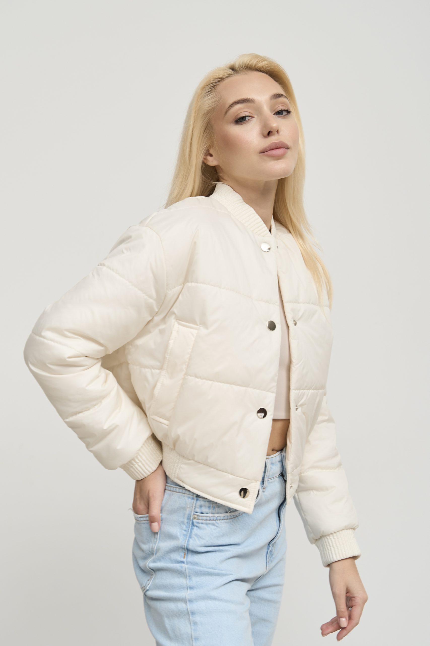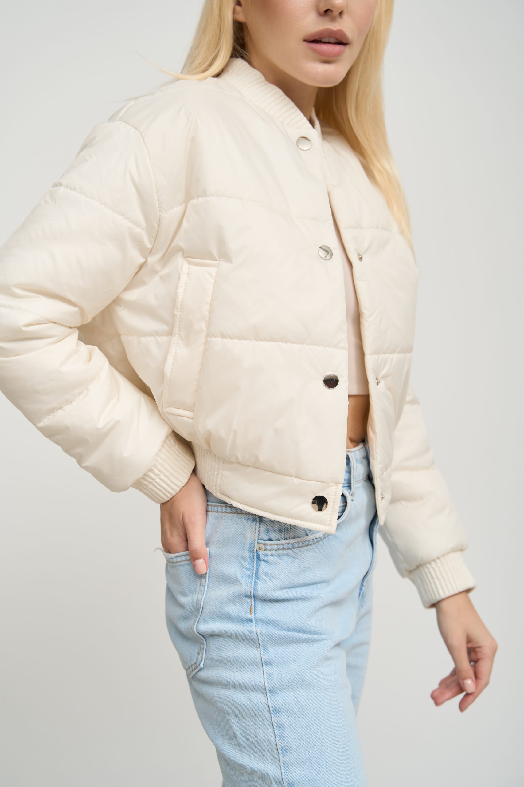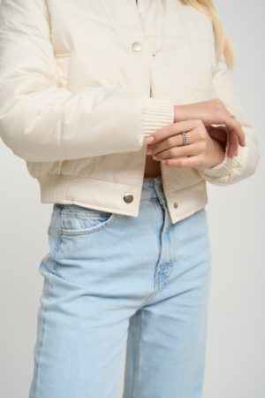 Особливу увагу варто звернути на деталі та оздоблення. Бомбер має дві бокові кишені, які не тільки додають йому практичності, але й служать стильним акцентом. Декоративні манжети на комірі, рукавах та внизу куртки надають їй завершеного вигляду та додають вишуканості. Застібка на кнопки – це зручне та практичне рішення, яке дозволяє легко одягати та знімати куртку.