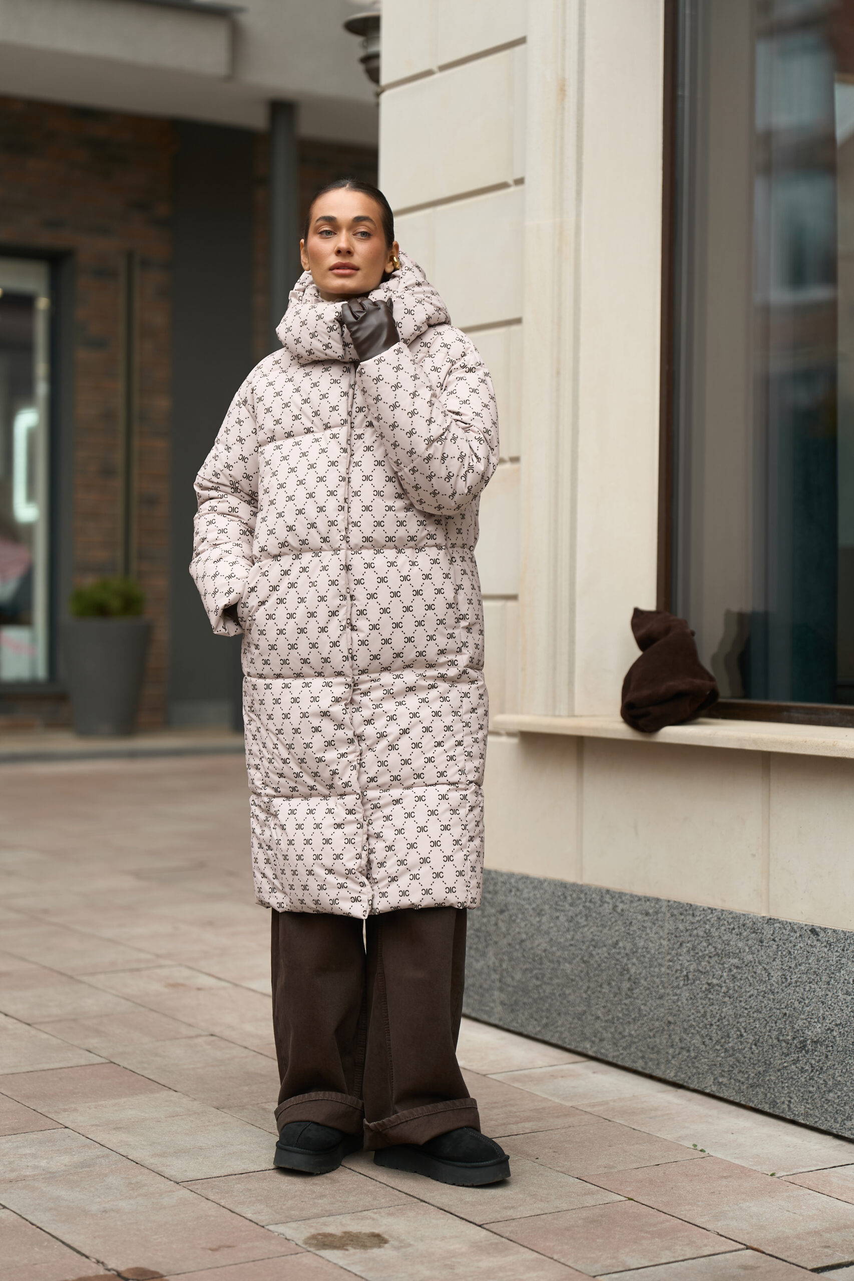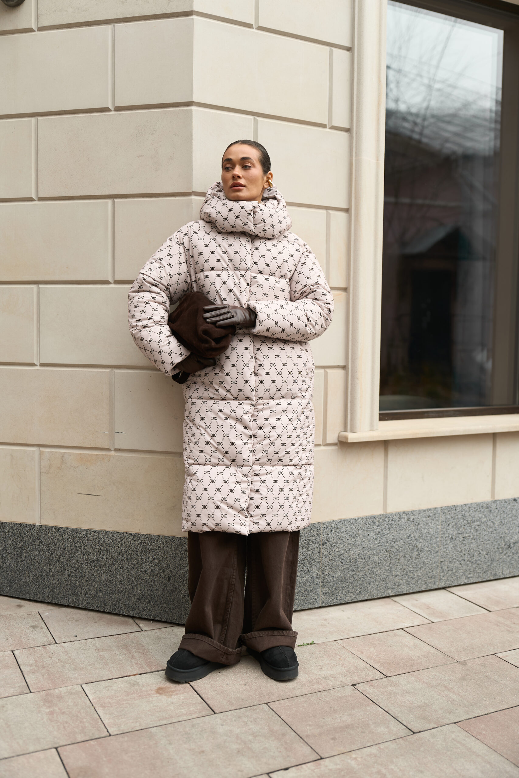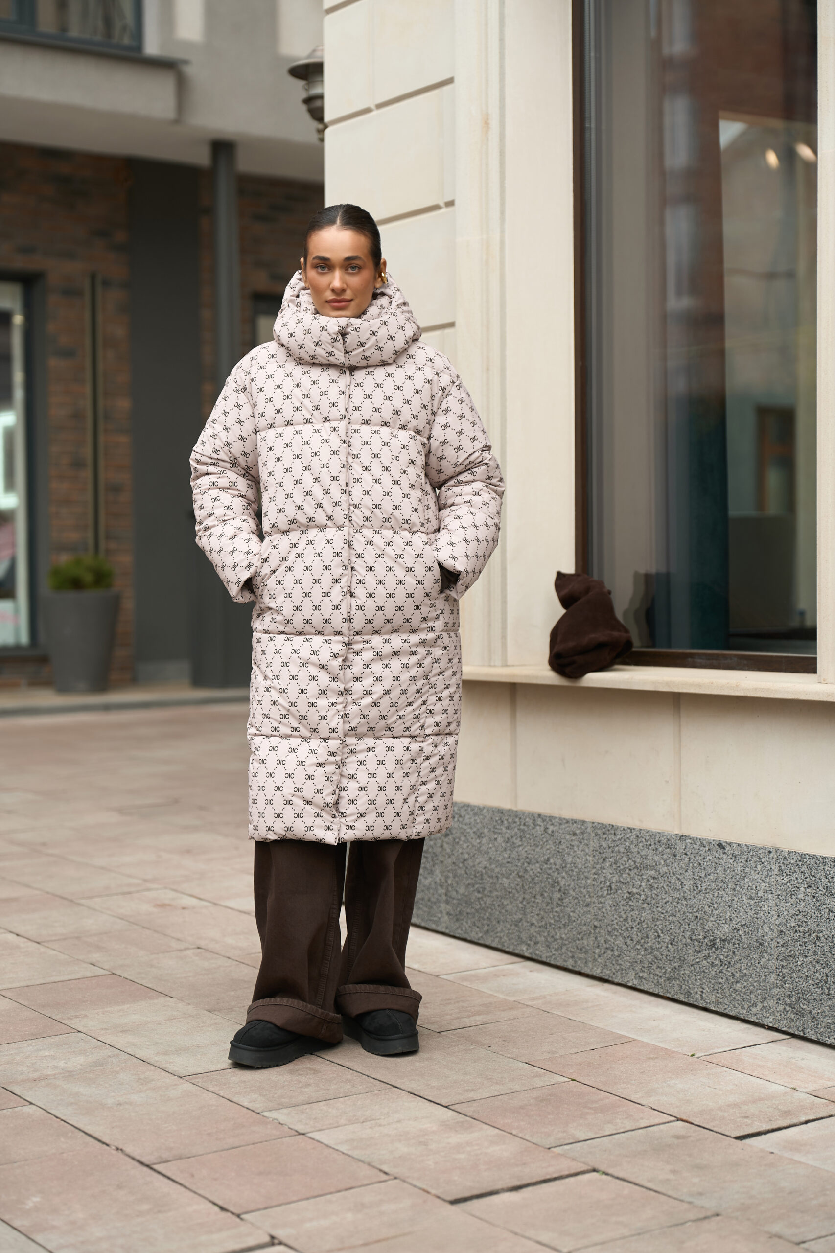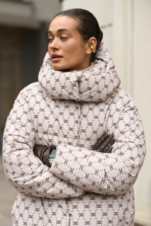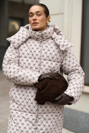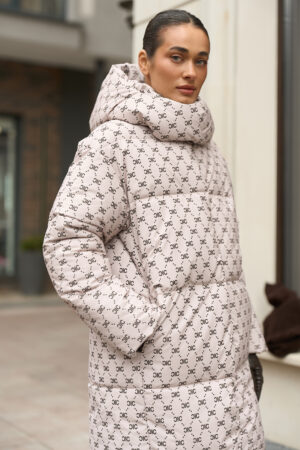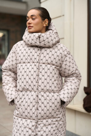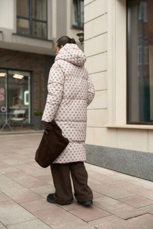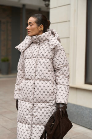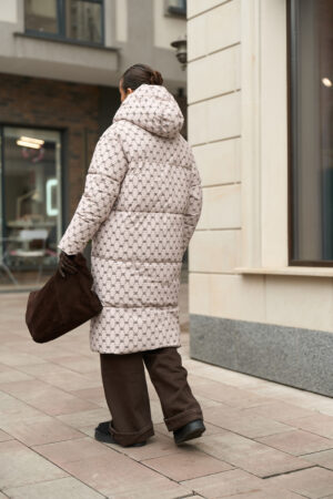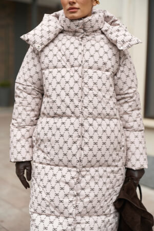 Жіночий довгий зимовий пуховик із капюшоном у бежевому кольорі з принтом — теплий, стильний та вишуканий вибір для холодної зими