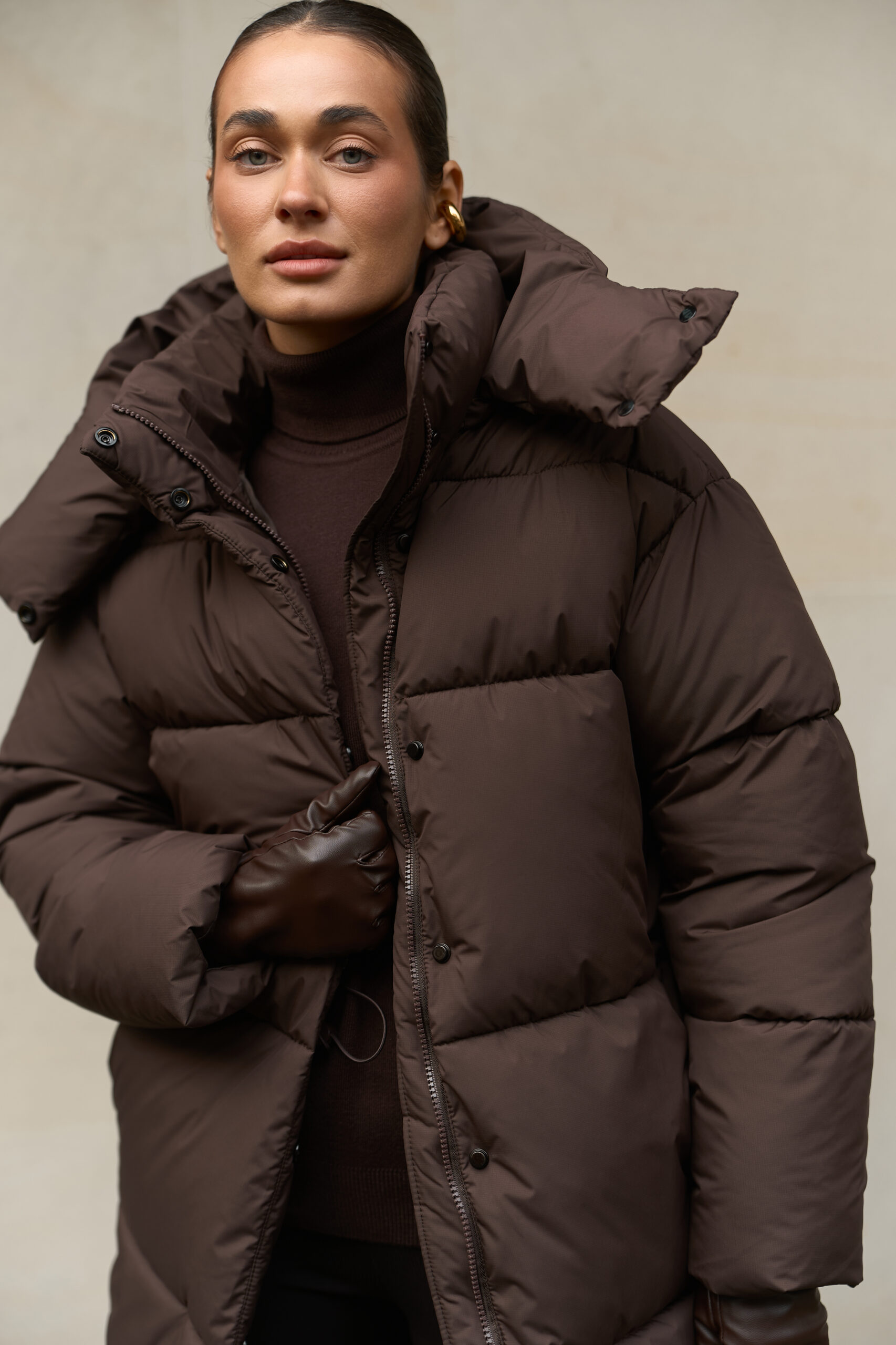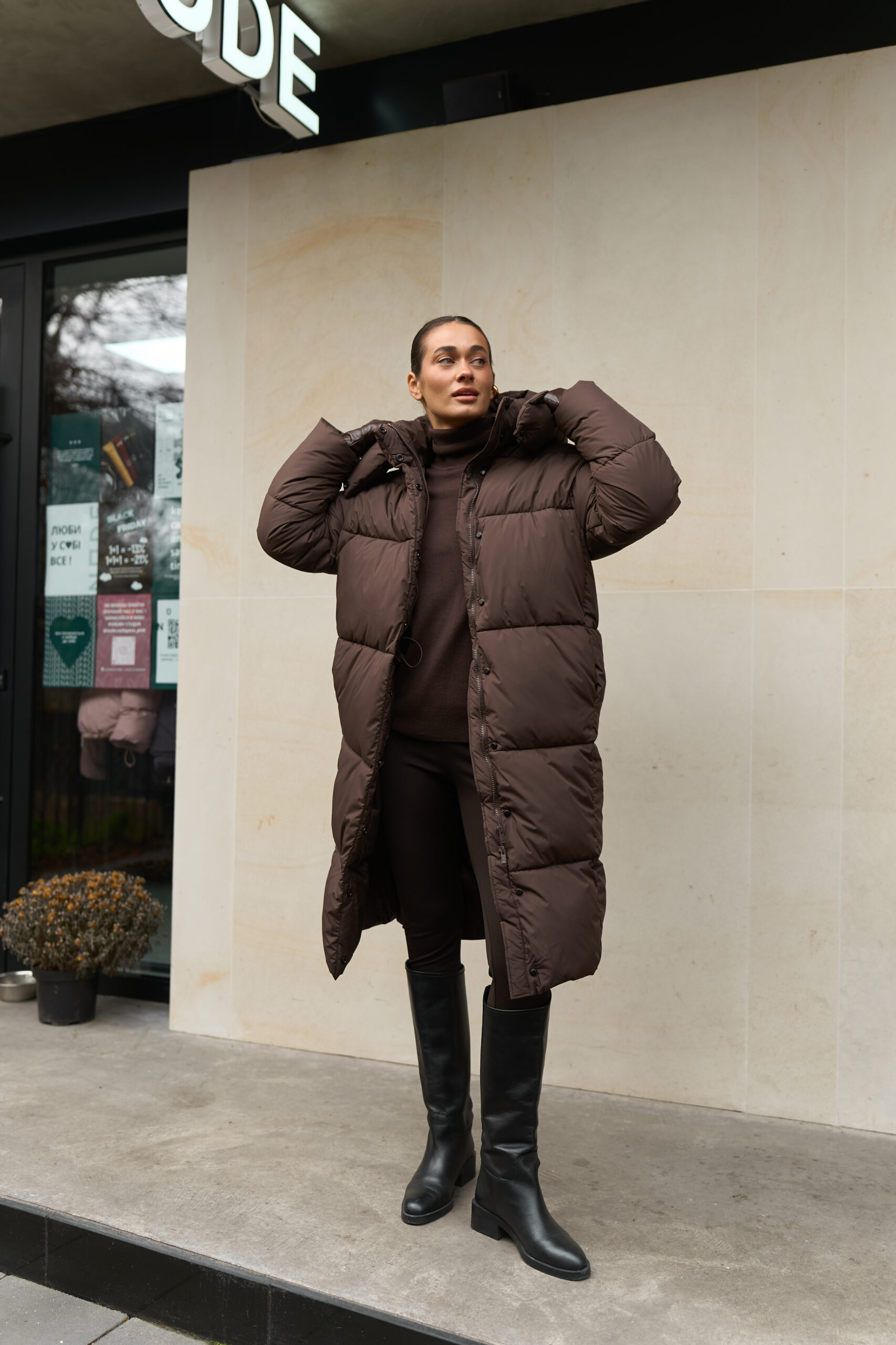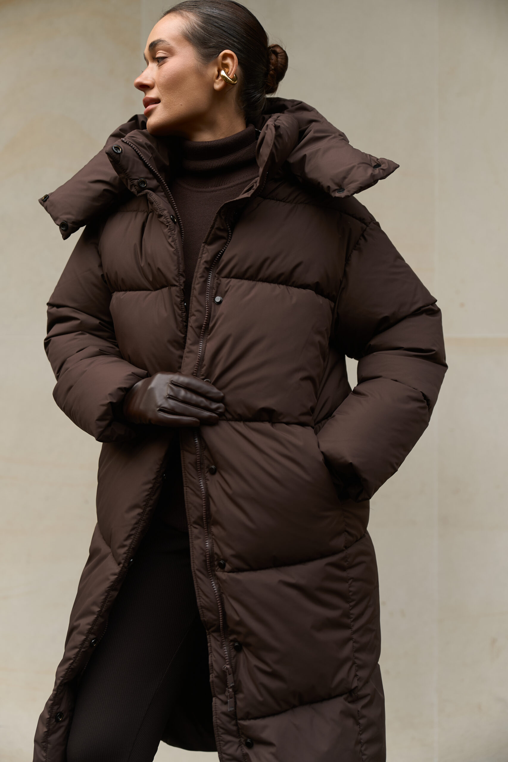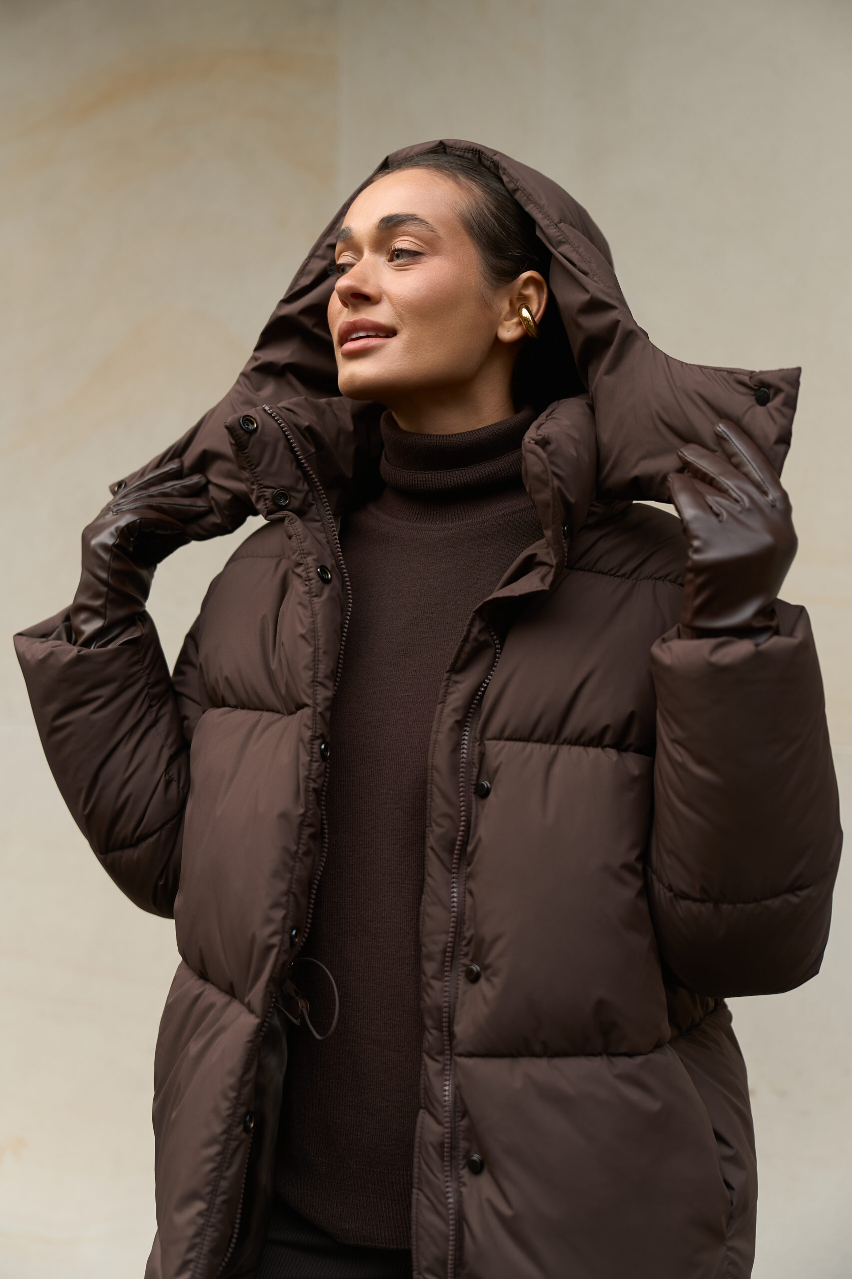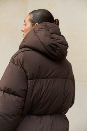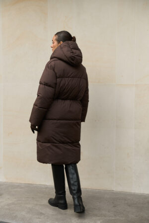 Жіночий довгий зимовий пуховик із капюшоном у шоколадному кольорі — теплий, стильний і вишуканий вибір на холодну пору року