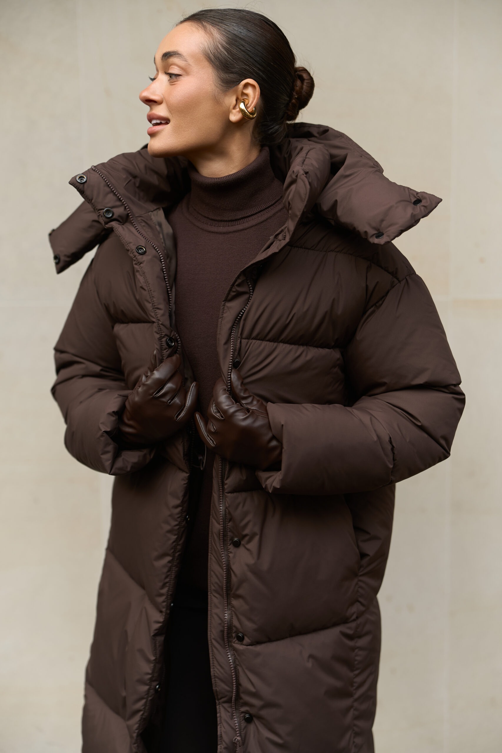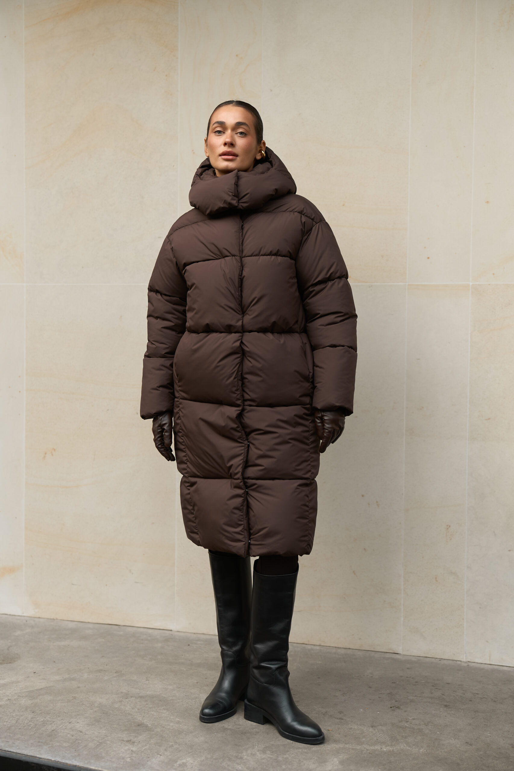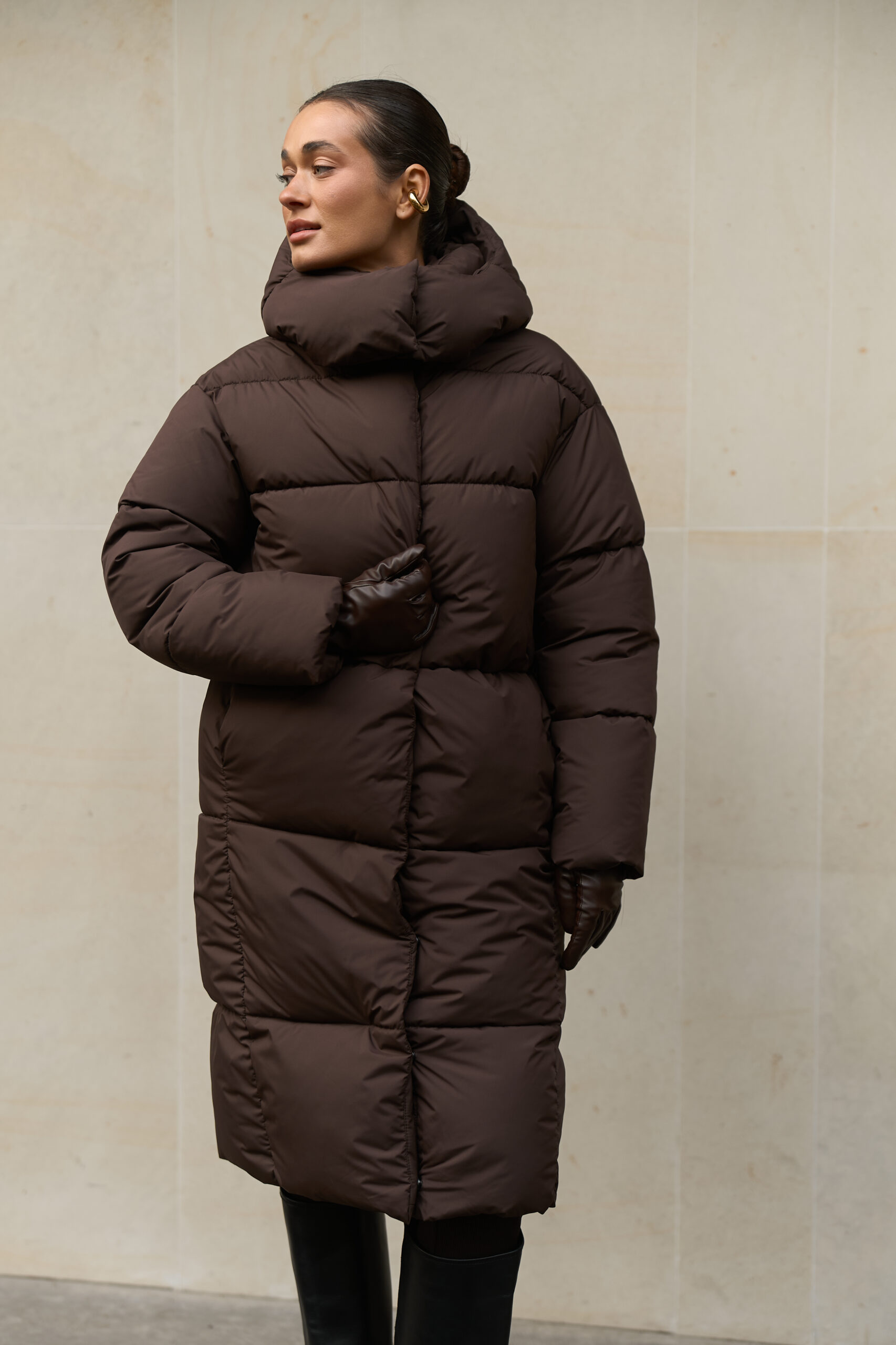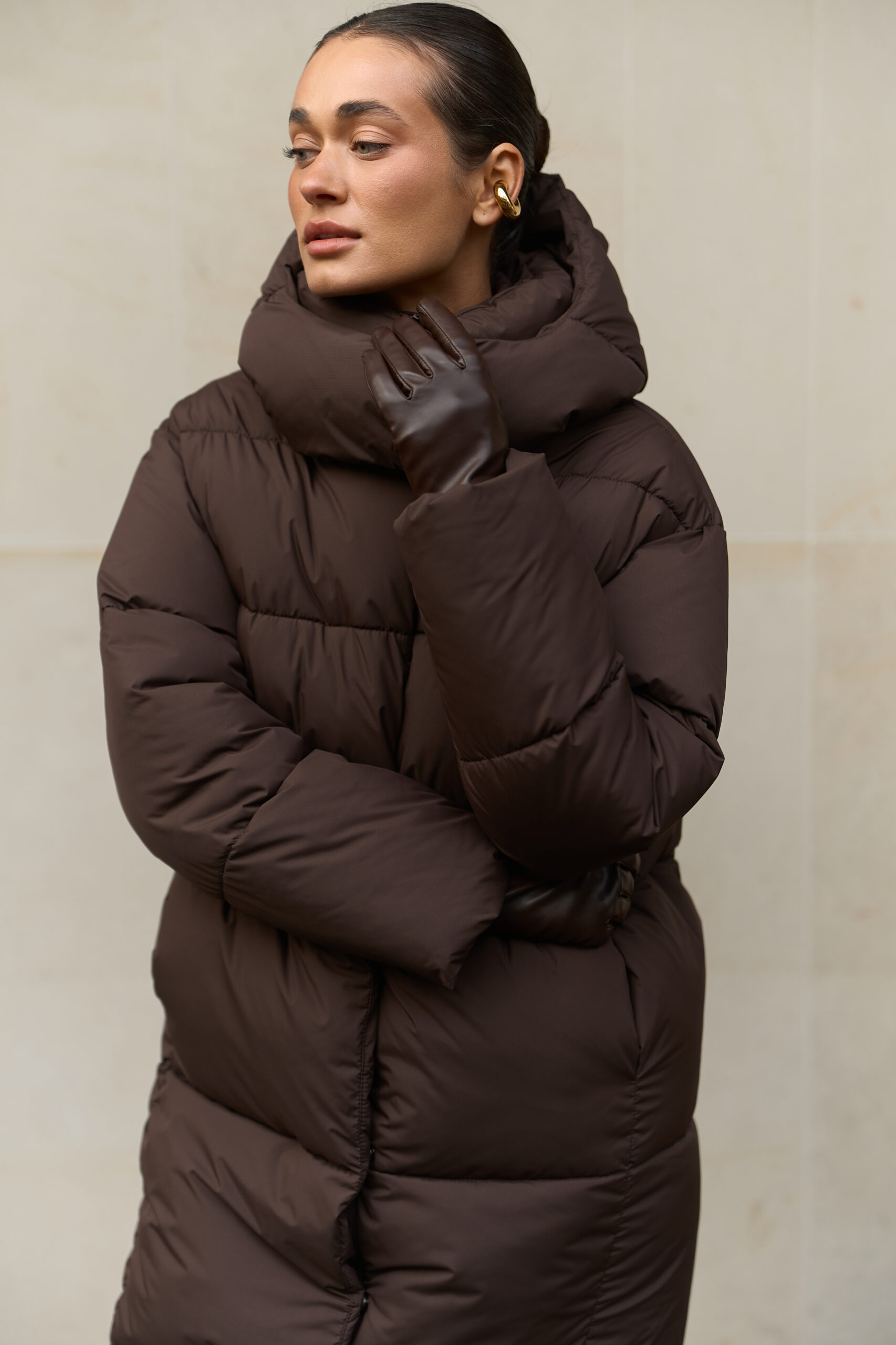 Жіночий довгий зимовий пуховик із капюшоном у шоколадному кольорі — теплий, стильний і вишуканий вибір на холодну пору року