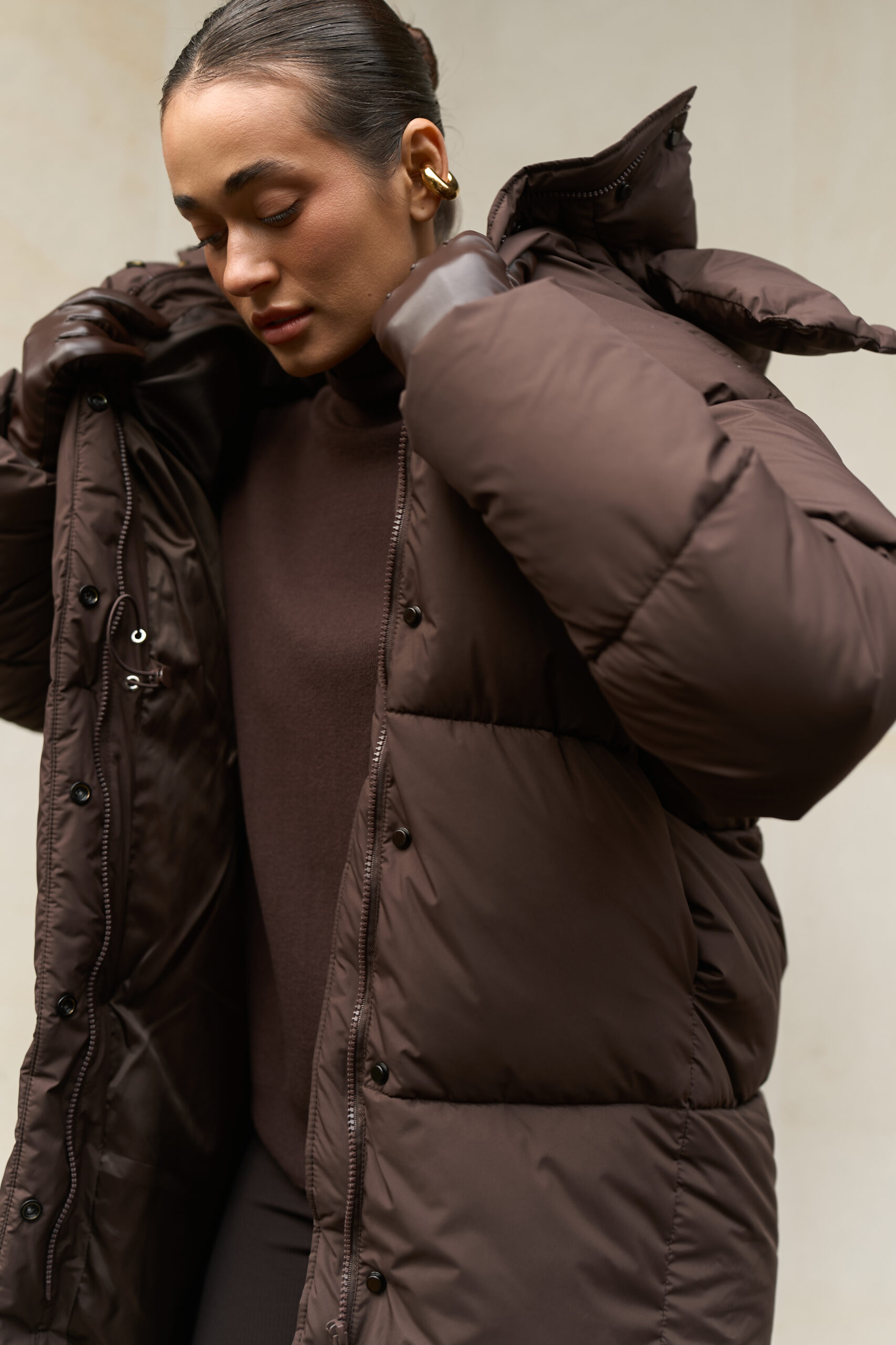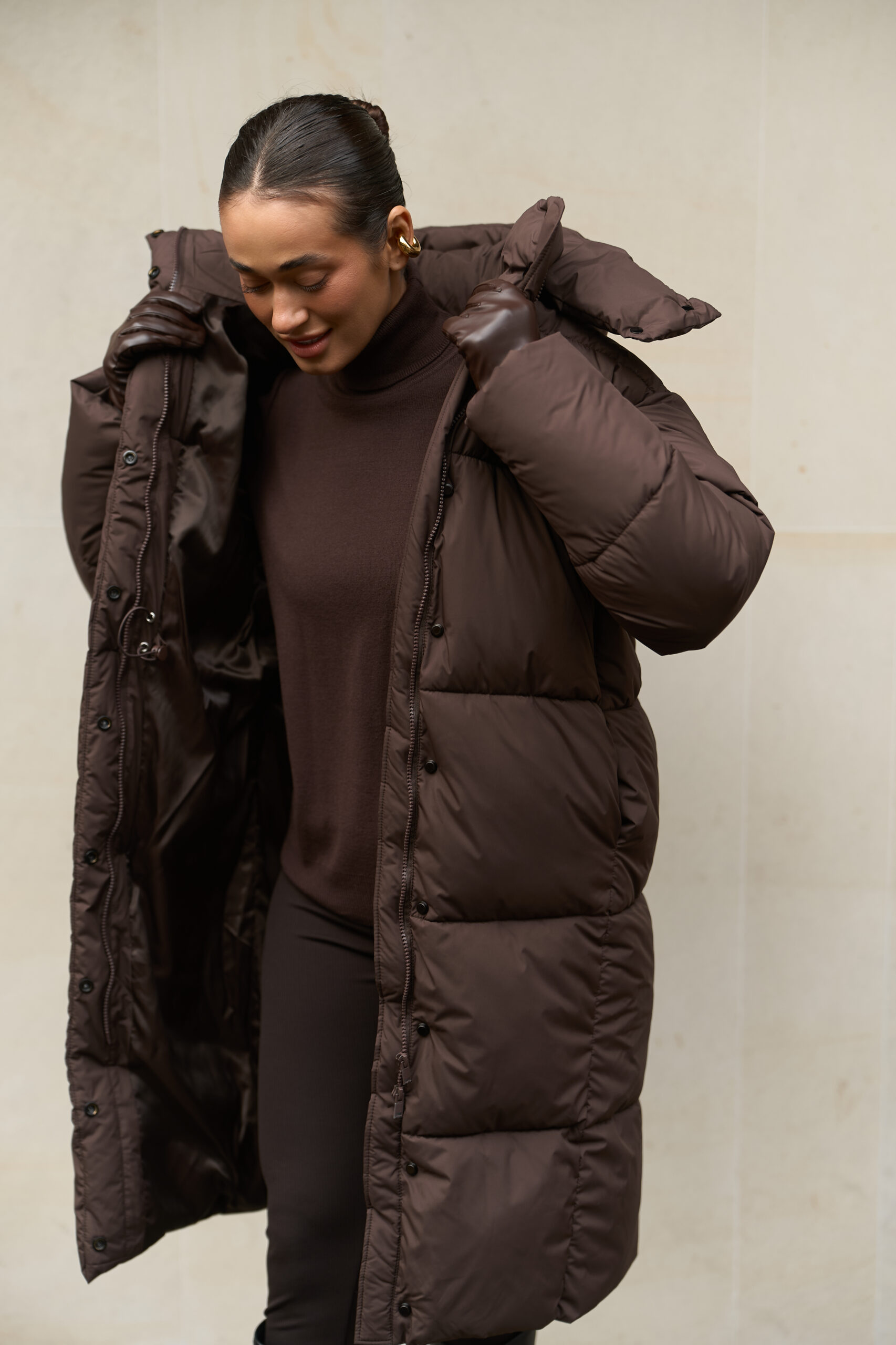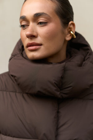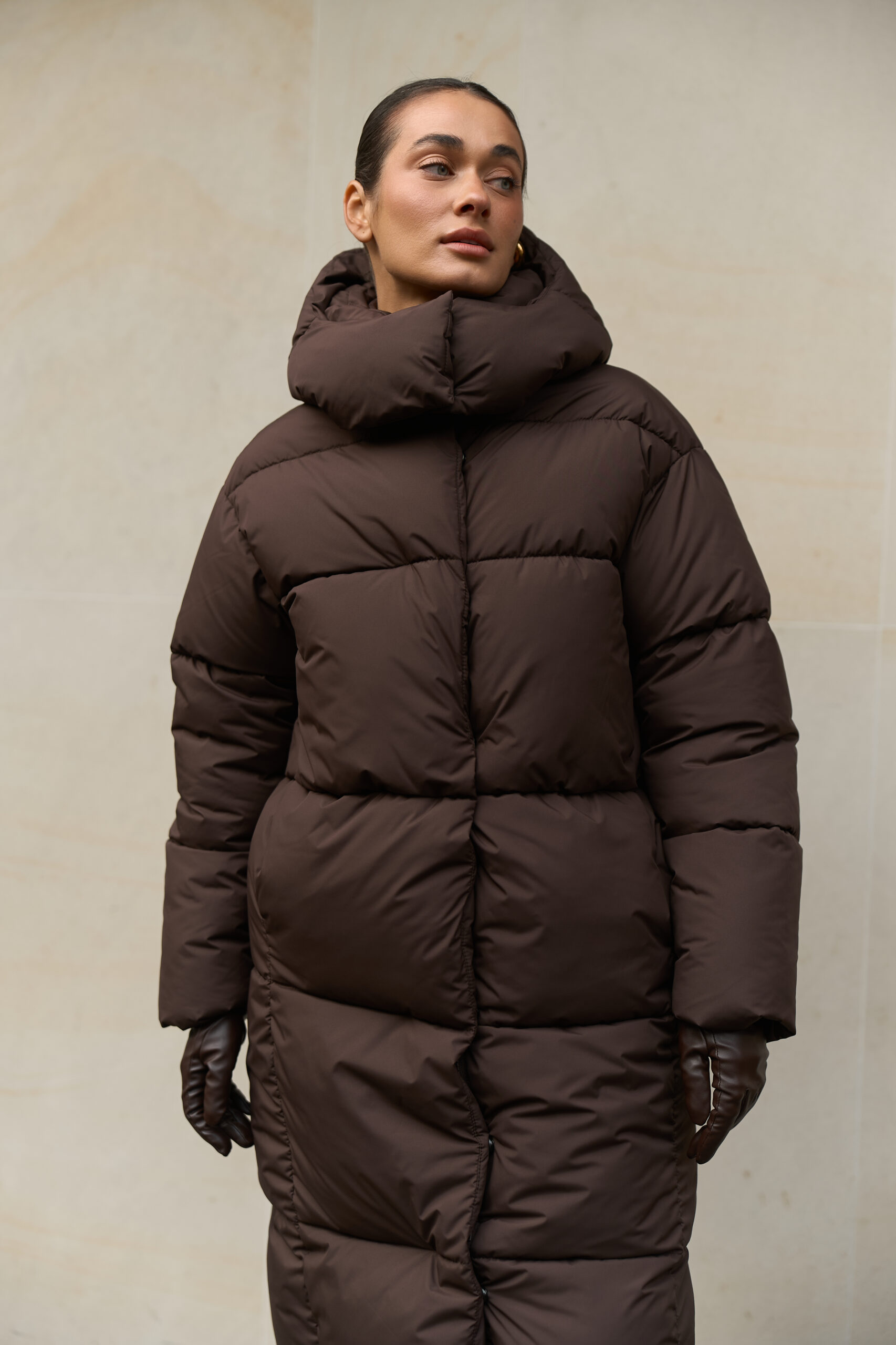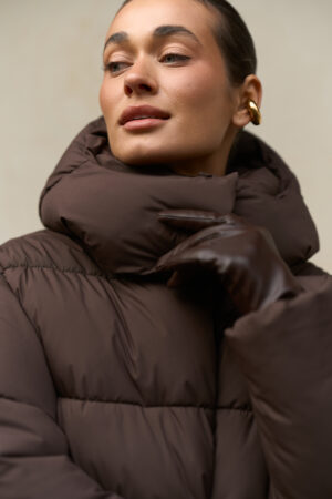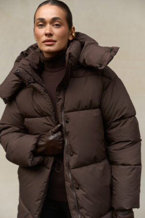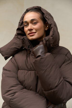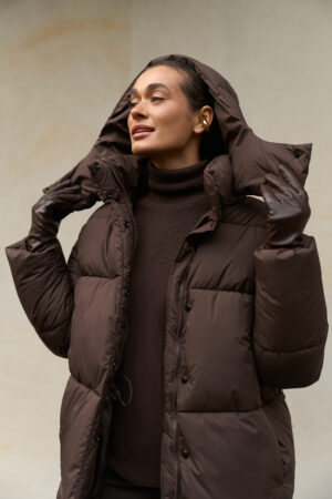 Цей жіночий довгий зимовий пуховик у шоколадному кольорі — ідеальний варіант для тих, хто шукає теплий пуховик на зиму в стильному, глибокому та благородному відтінку. Модель має зйомний капюшон, регульовану талію та мембранну тканину, що забезпечує захист від морозу, снігу та вітру. Пуховик виглядає дорого, вишукано та стає універсальною частиною зимового гардероба.