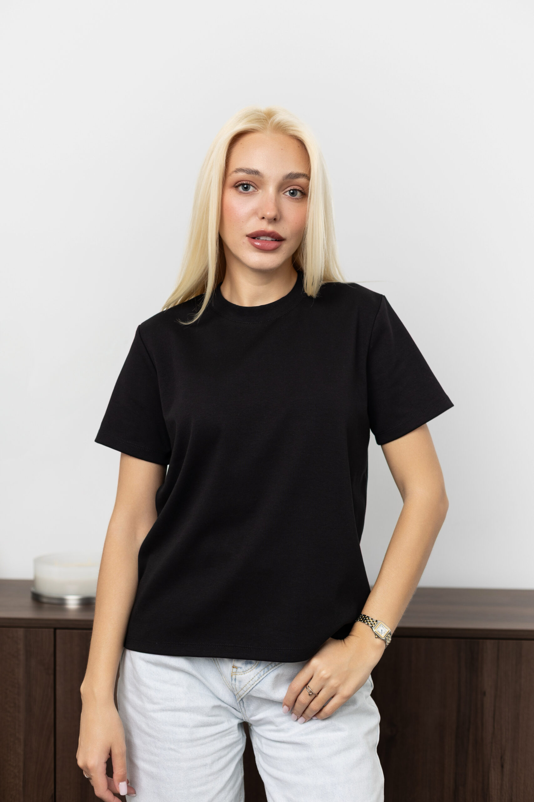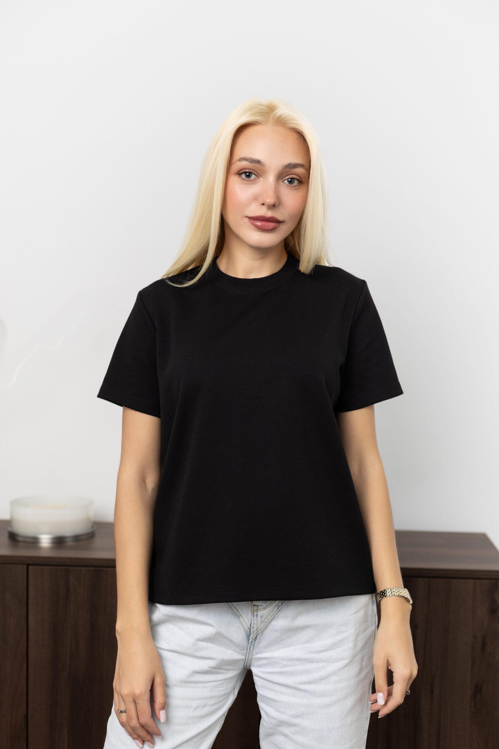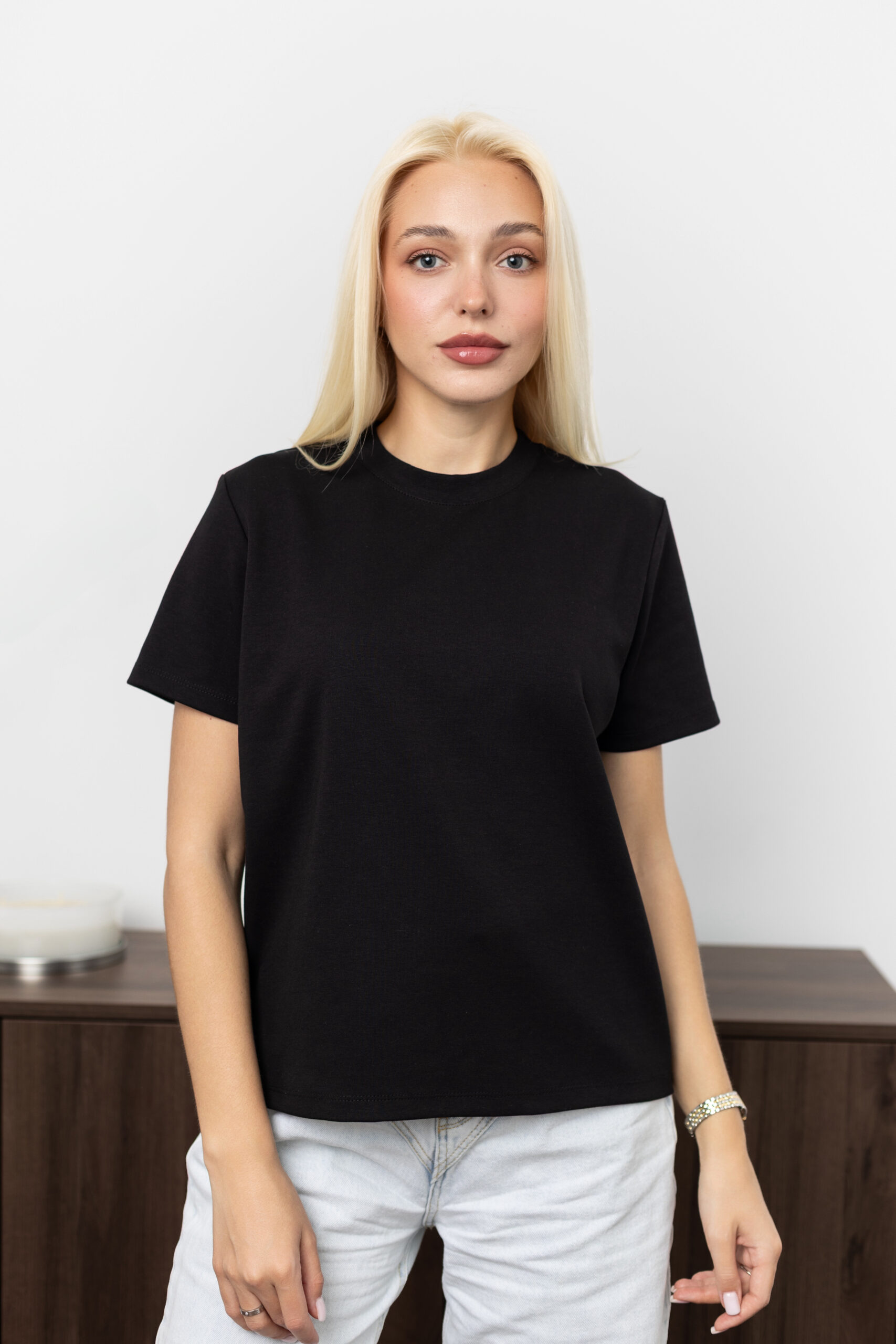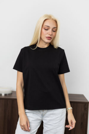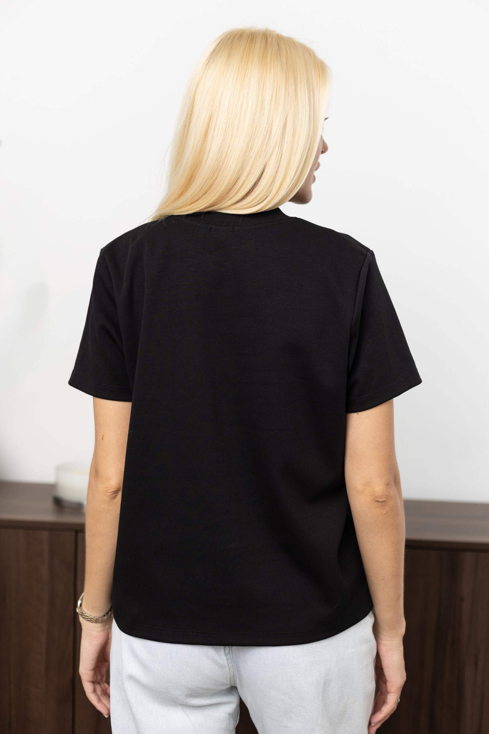 Ця чорна футболка — справжній must-have. Вона чудово виглядає з класичними брюками і підборами, створюючи мінімалістичний діловий образ. Для casual-луку поєднуйте її з джинсами, кросівками й жакетом oversize. А для сміливішого настрою — надягайте з шкіряною спідницею або total black луком.