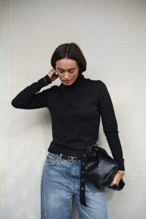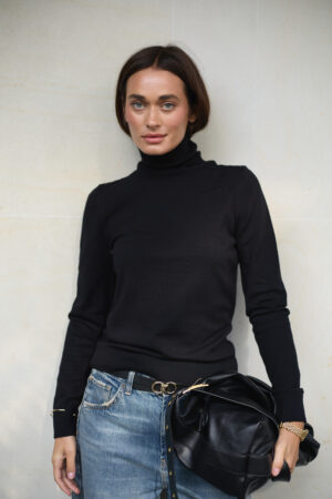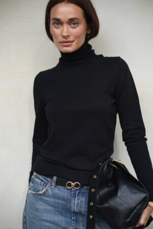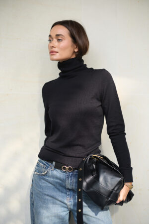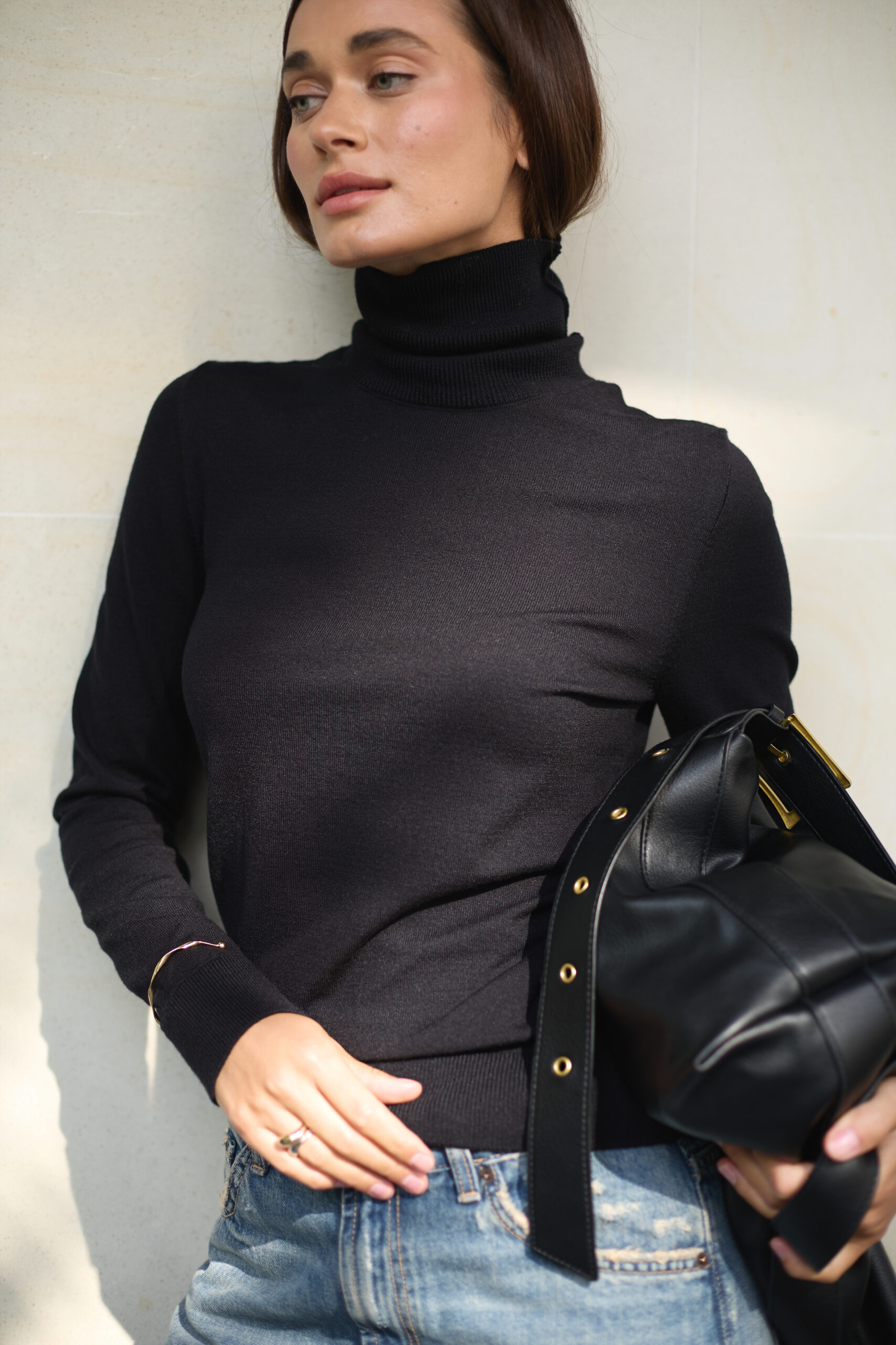 Жіночий гольф у чорному кольорі з гладкої в’язки — елегантна базова модель із віскози, еластану та нейлону. Має високу горловину, подовжені рукави та приталений крій. Класичний чорний відтінок підкреслює стриману розкіш, витонченість і універсальність, роблячи цей гольф незамінною основою стильного гардеробу.