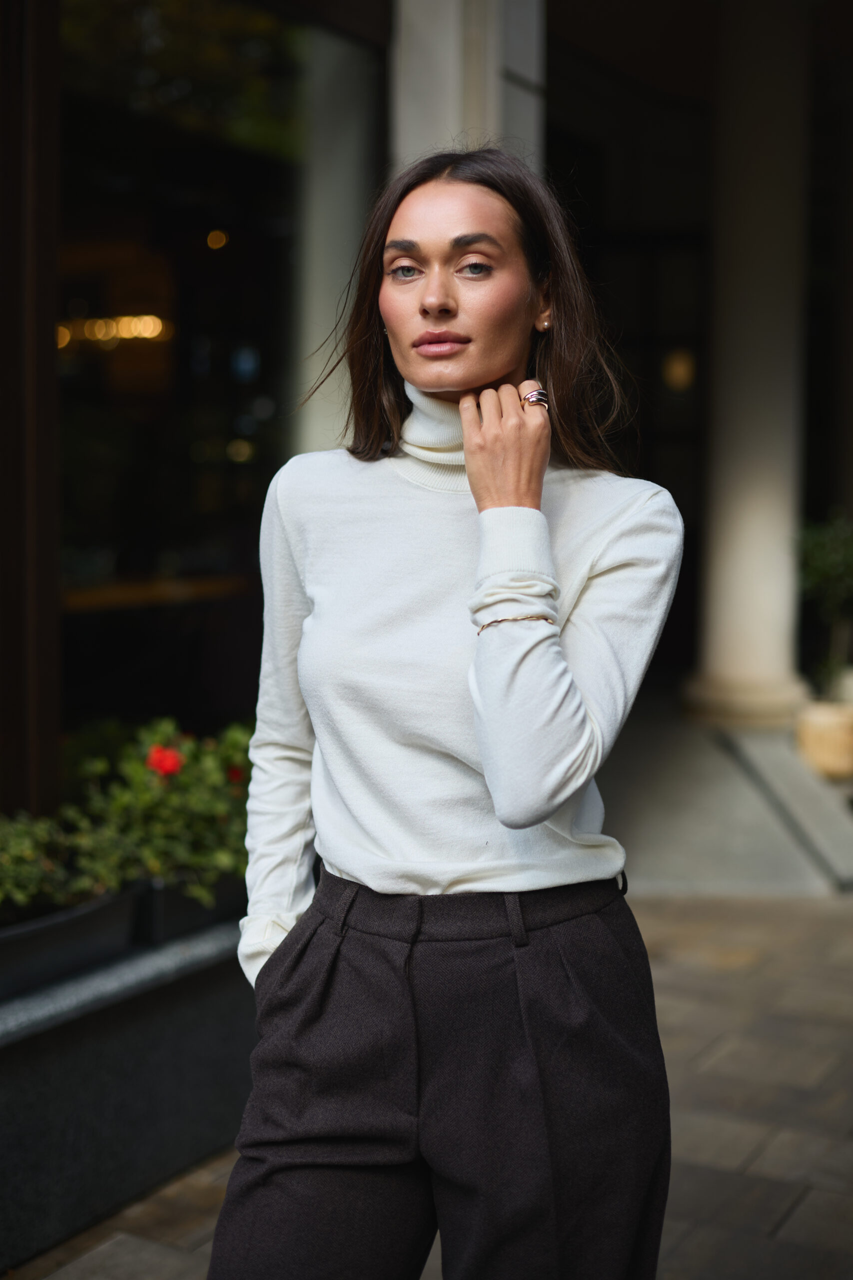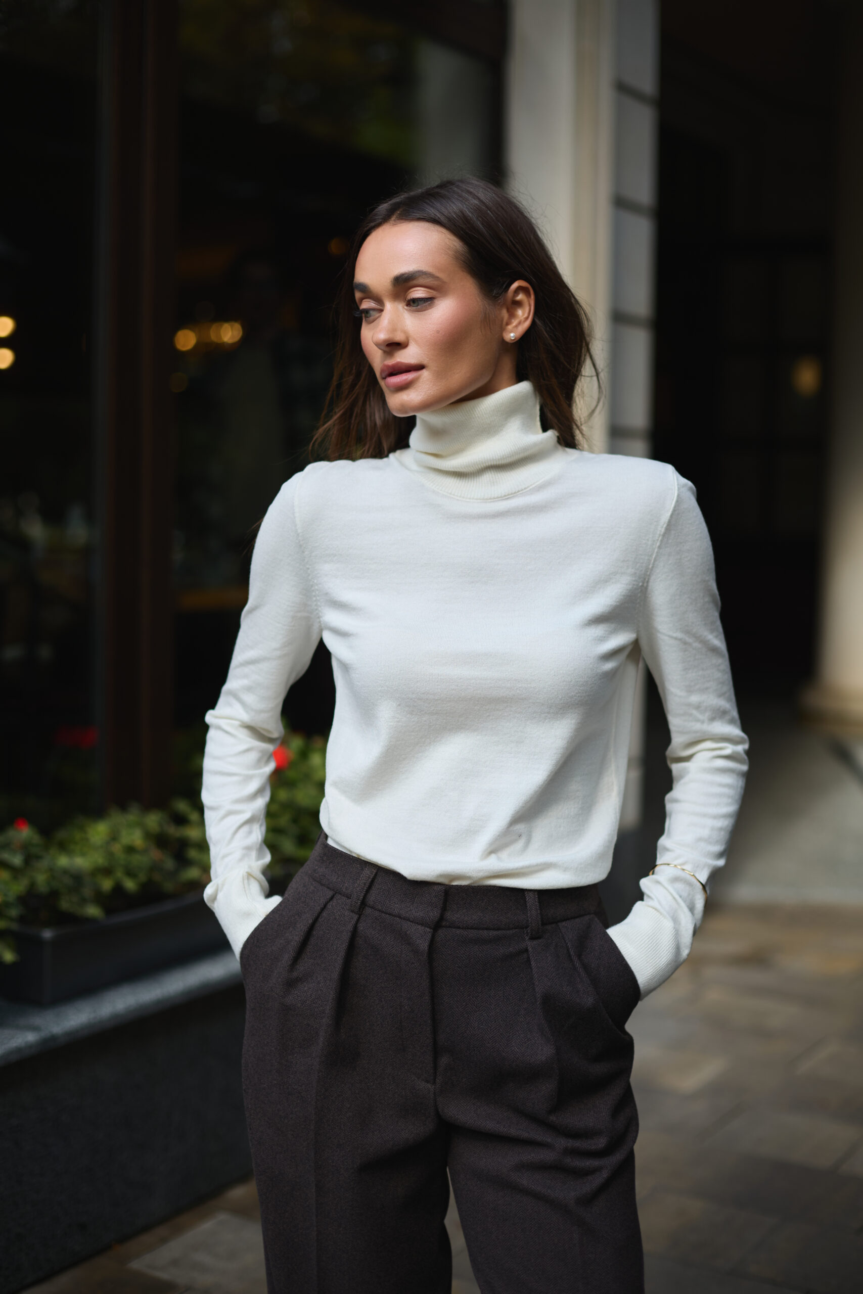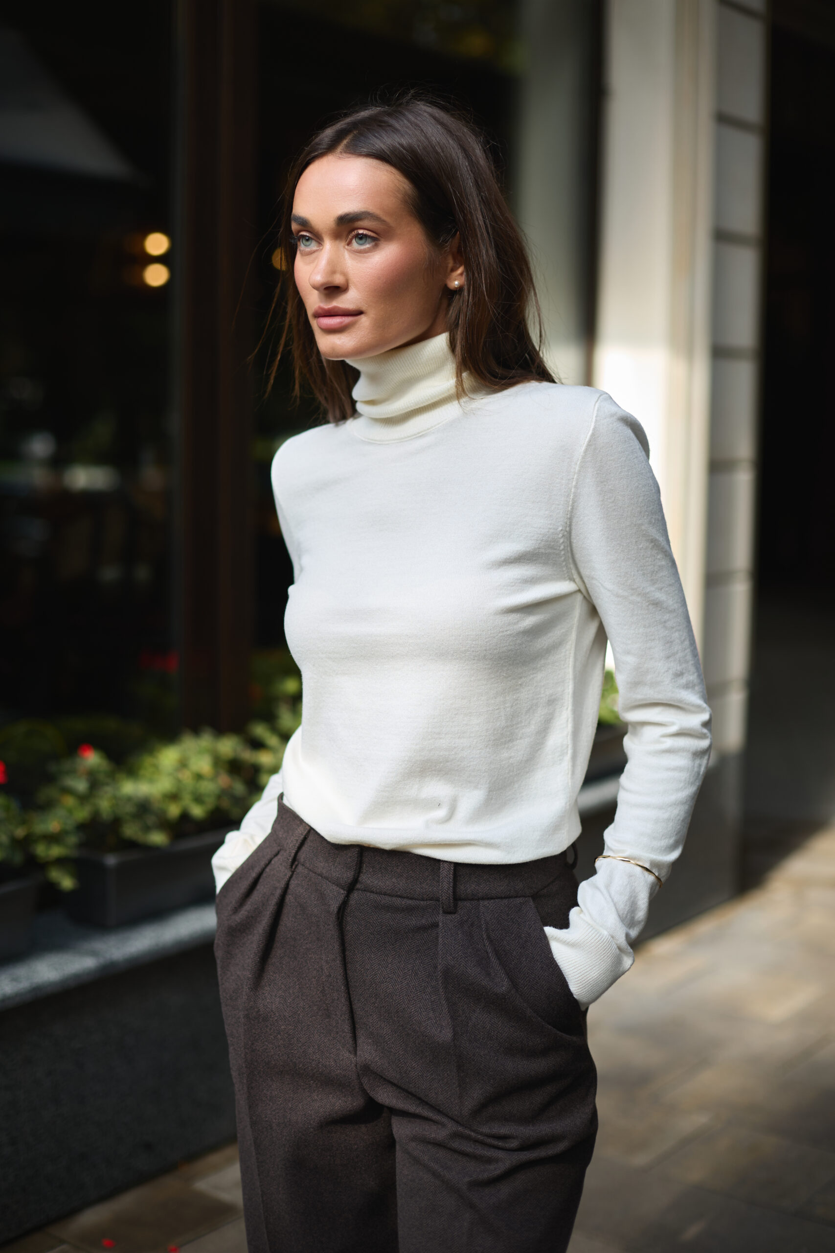 Гольф має класичний приталений силует, який підкреслює фігуру, зберігаючи комфорт і свободу рухів. Висока горловина забезпечує додатковий захист від холоду, а подовжені рукави додають витонченості та створюють елегантну лінію рук. Молочний колір надає образу свіжості, м’якості й чудово поєднується як з пастельними, так і з контрастними відтінками.