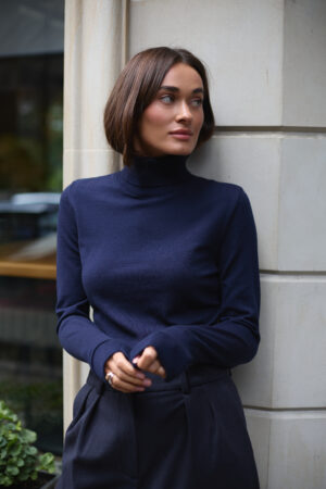 Жіночий гольф у глибокому синьому відтінку — це сучасна класика, яка поєднує в собі вишуканість і практичність. Цей колір випромінює спокій, впевненість і гармонію, водночас залишається універсальним для будь-якого випадку. Синій гольф стане основою безлічі образів: від офісного луку з жакетом і брюками до повсякденного стилю з джинсами чи спідницею.