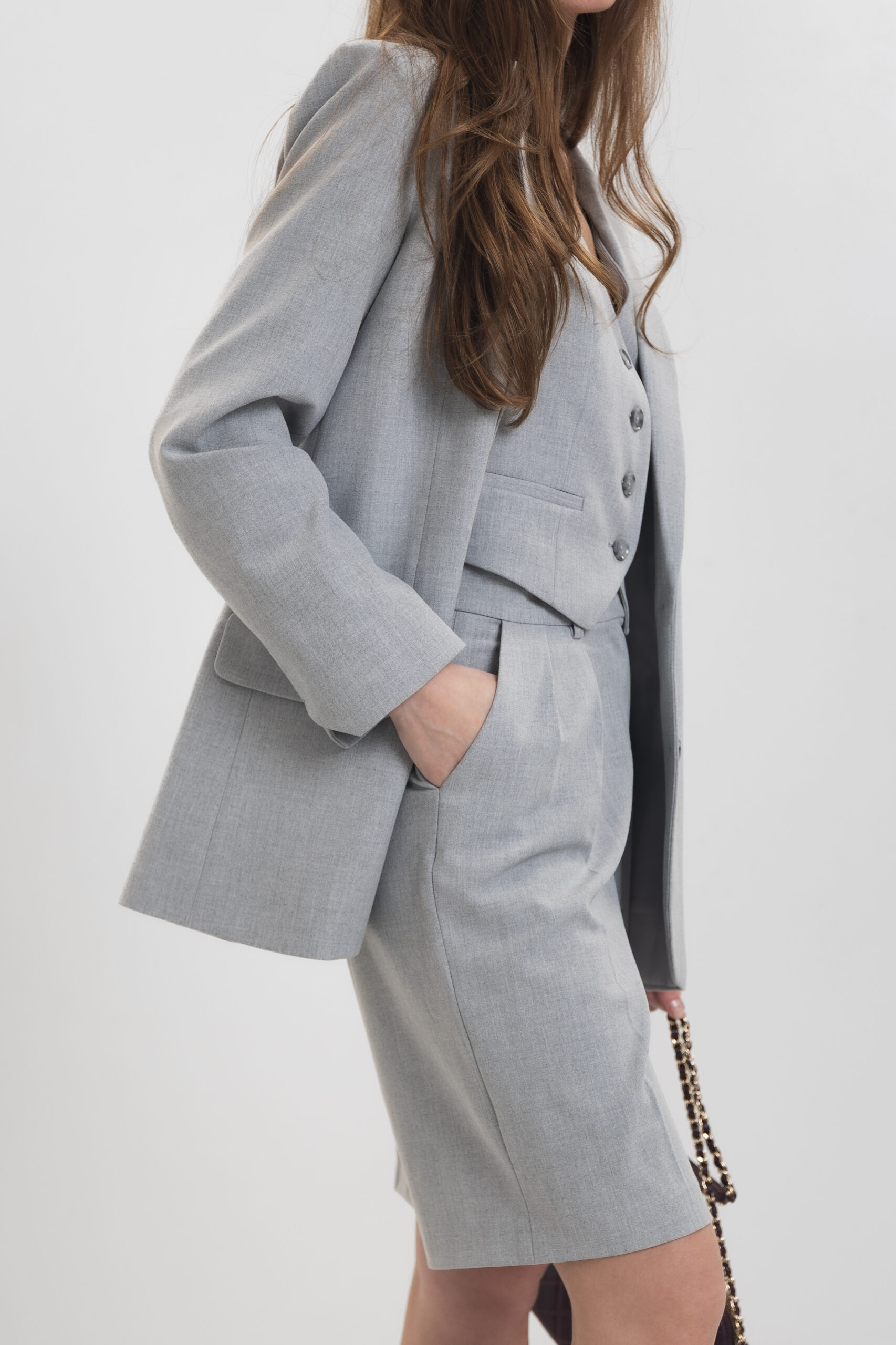 Модель має вільний крій з довжиною до коліна, що дозволяє створювати легкий, невимушений образ, водночас виглядаючи елегантно і строго. Світло-сірий колір підходить для будь-яких ситуацій, легко поєднуючись як з класичними елементами гардеробу, так і з більш розслабленими варіантами.