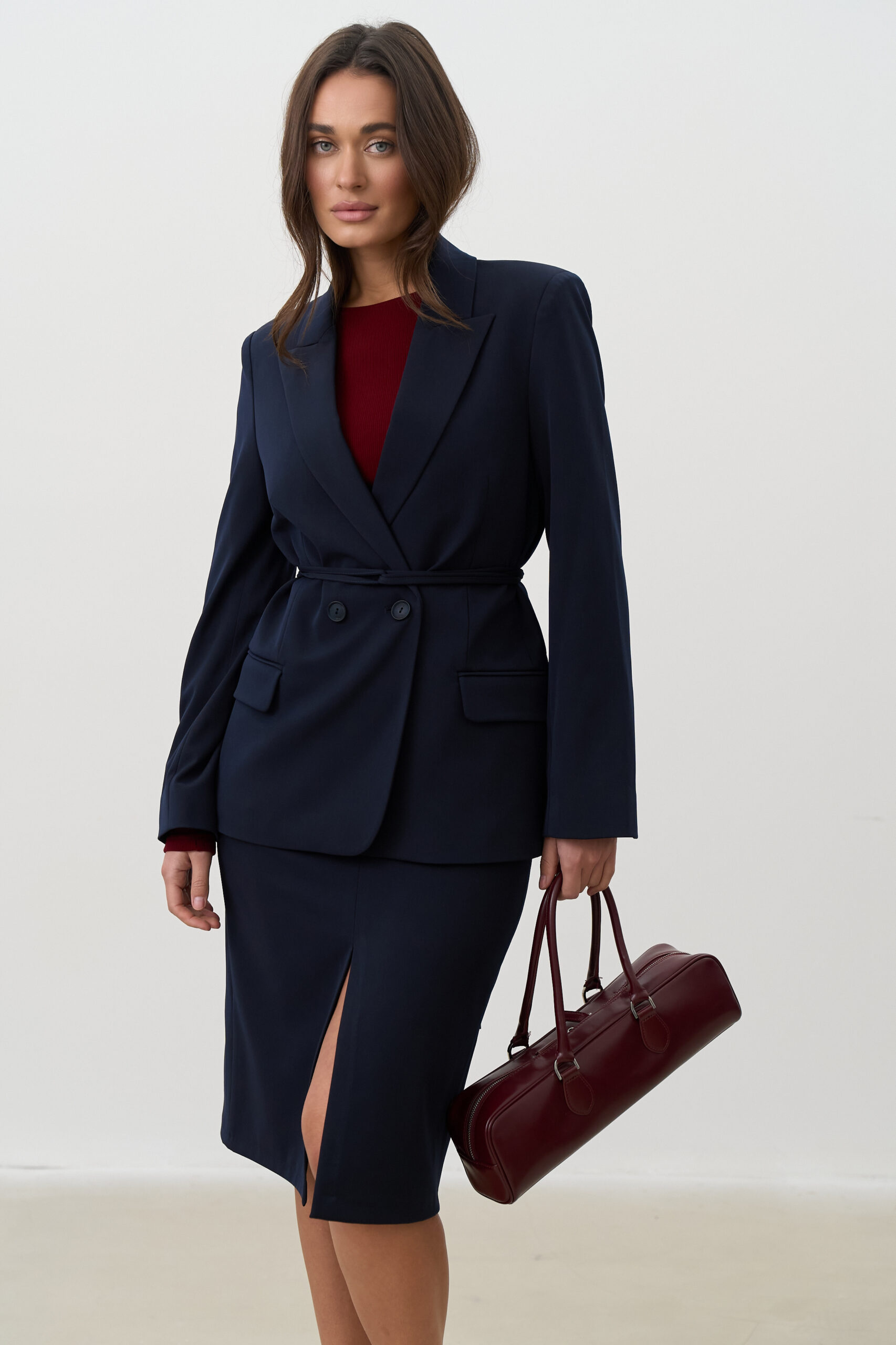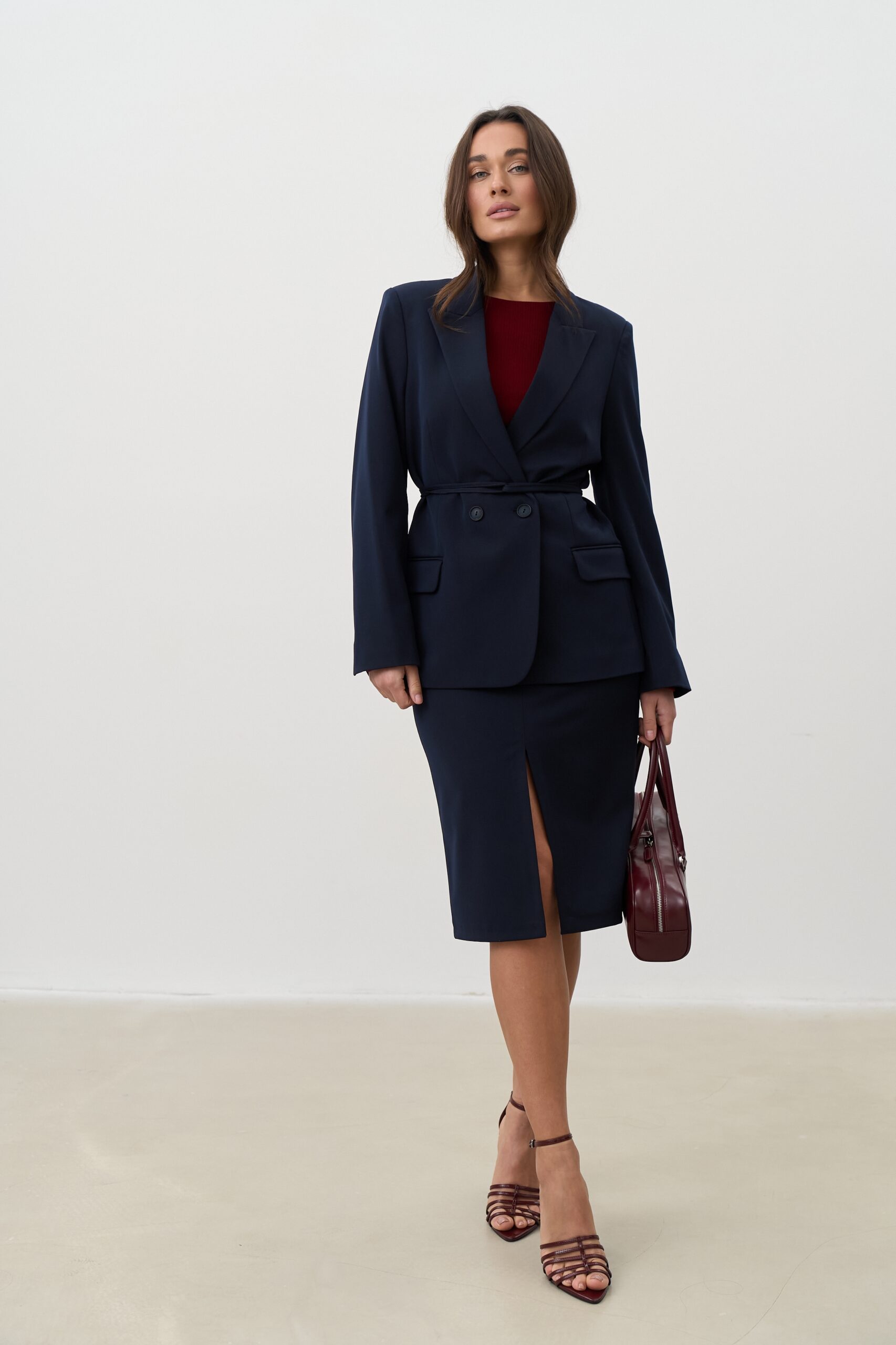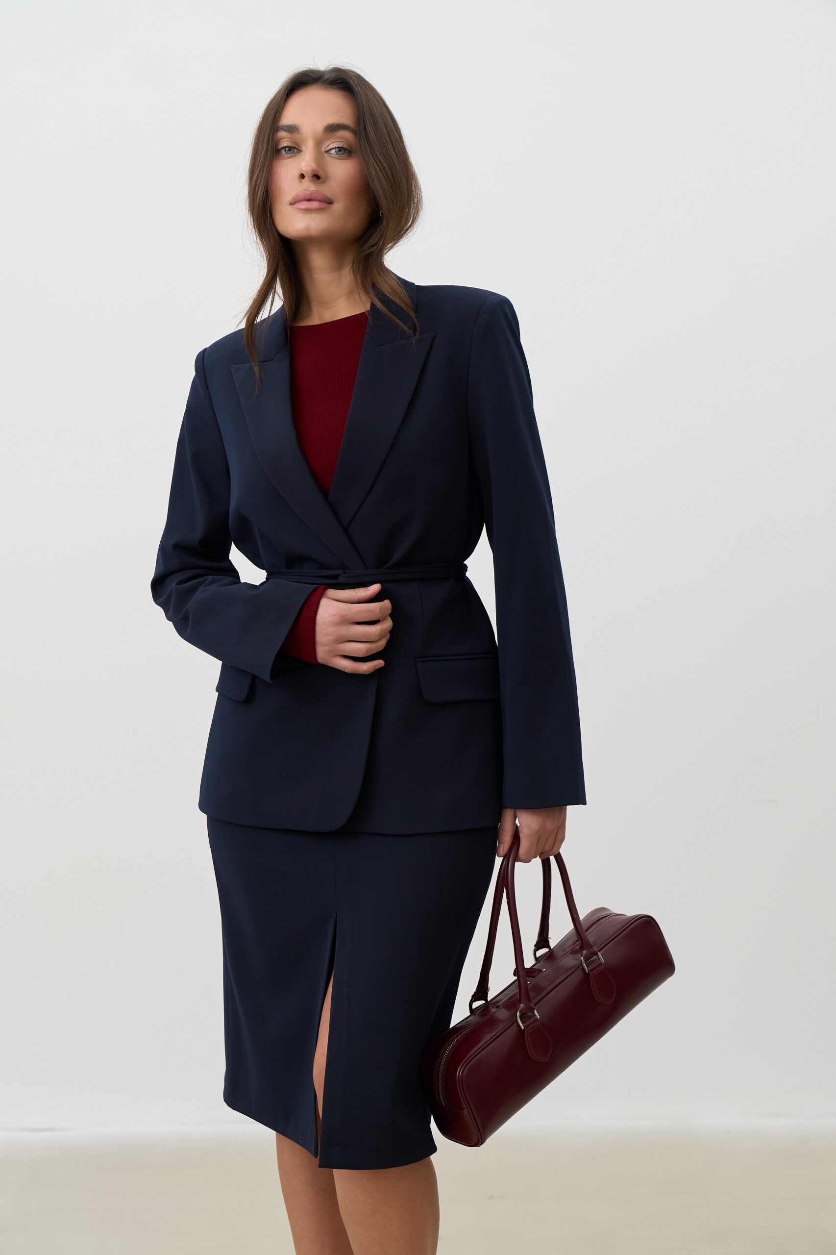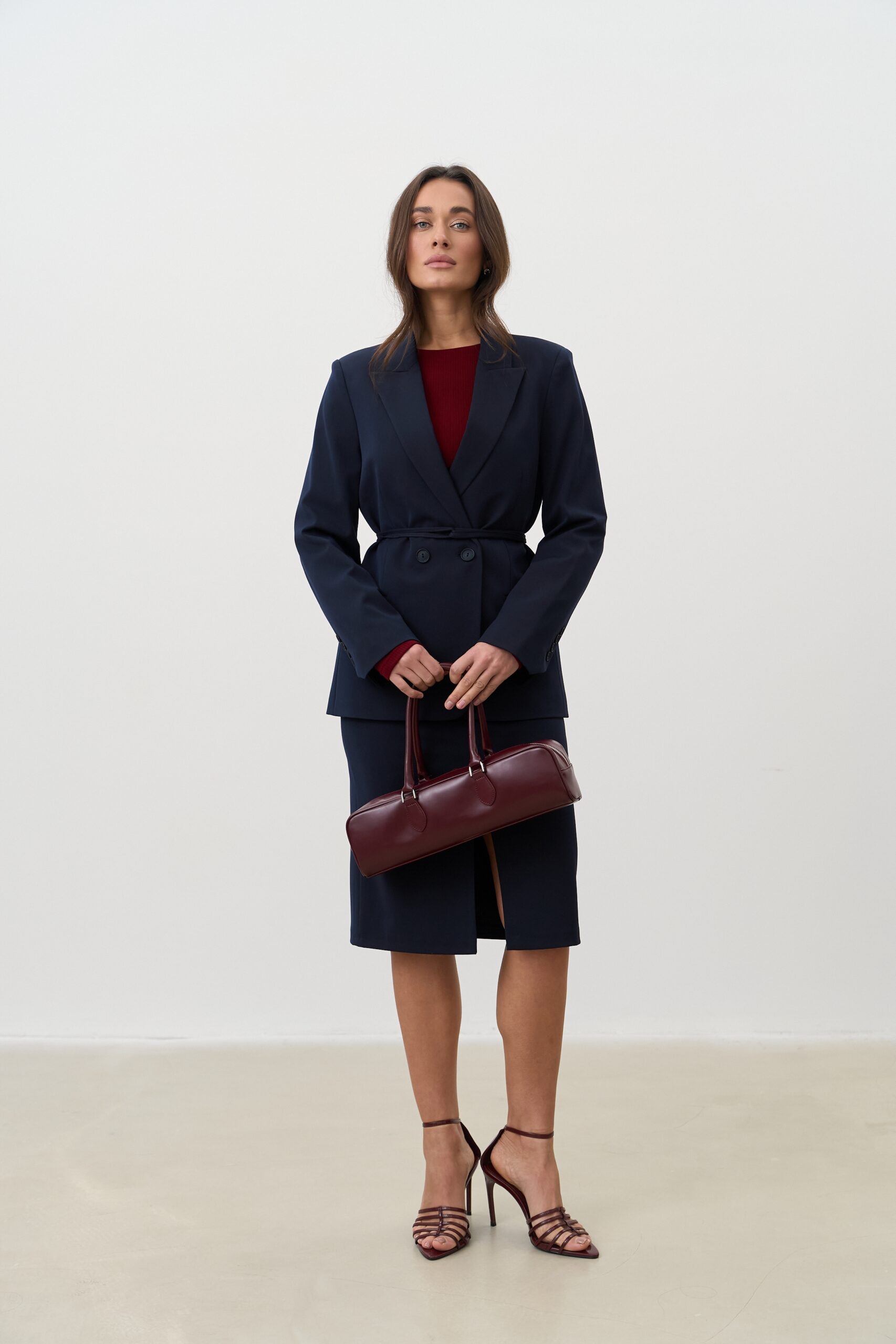 Синій колір символізує стабільність, професіоналізм і впевненість. Він легко поєднується з білими, молочними, бежевими, сірими та яскравими акцентами, дозволяючи створювати як класичні ділові, так і сучасні стильні образи.