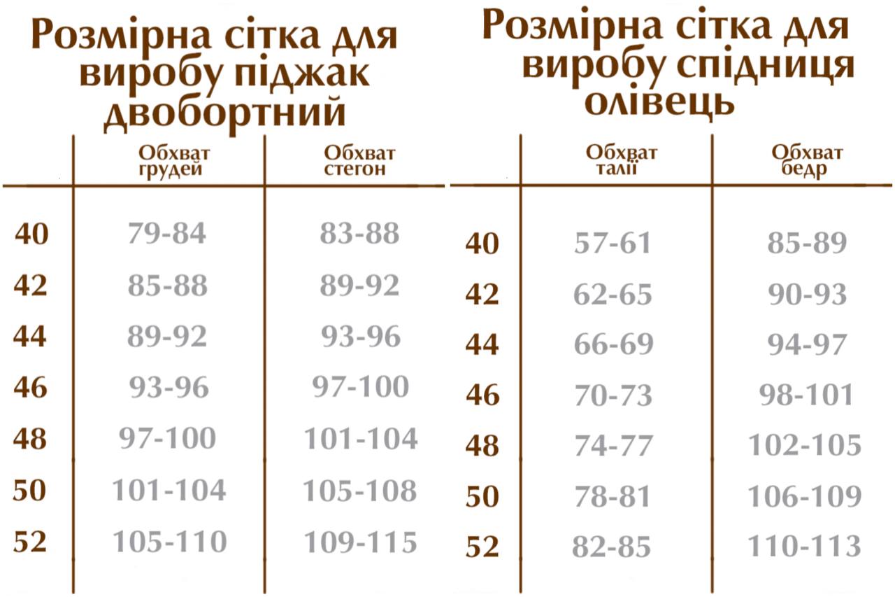 Костюм доступний у розмірах 40, 42, 44, 46, 48, 50, 52, що дозволяє підібрати ідеальну посадку для різних типів фігури.