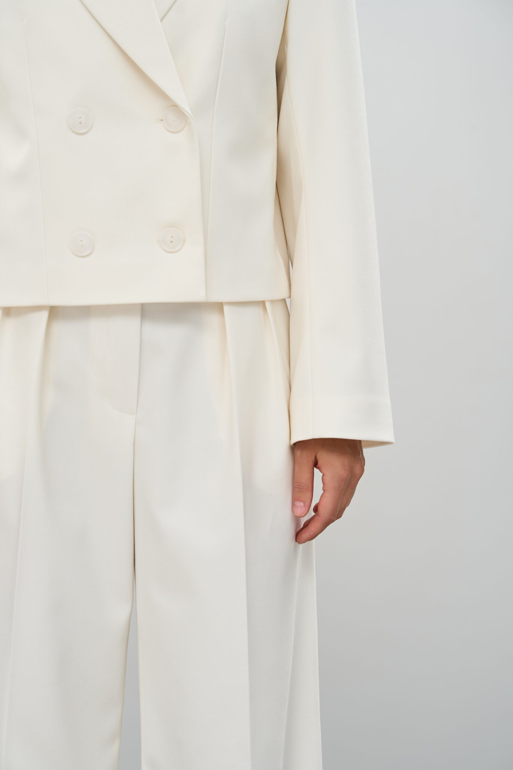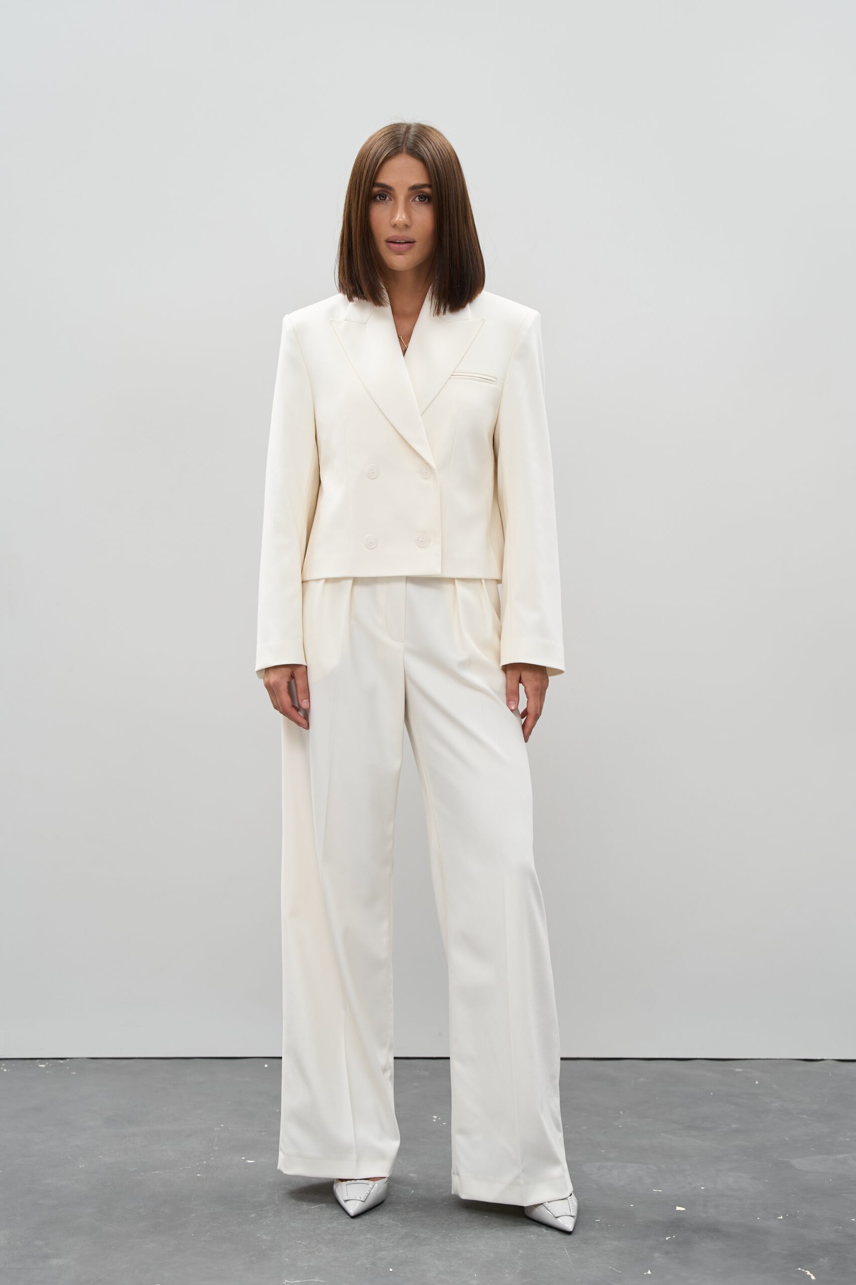 Цей костюм у відтінку молока — вишукана класика у сучасному прочитанні. Вкорочений піджак і широкі штани палаццо створюють гармонійний ансамбль, який підкреслює жіночність, легкість і витонченість силуету. Це ідеальне рішення для тих, хто шукає універсальний наряд, що поєднує строгість класики та трендовість сучасної моди.