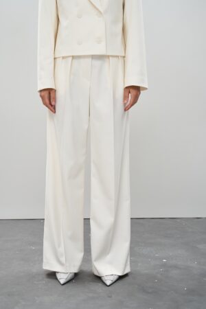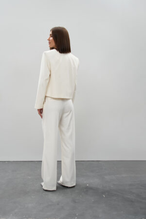 Жіночий костюм у кольорі молоко з вкороченим піджаком і брюками палаццо — елегантність у світлому виконанні