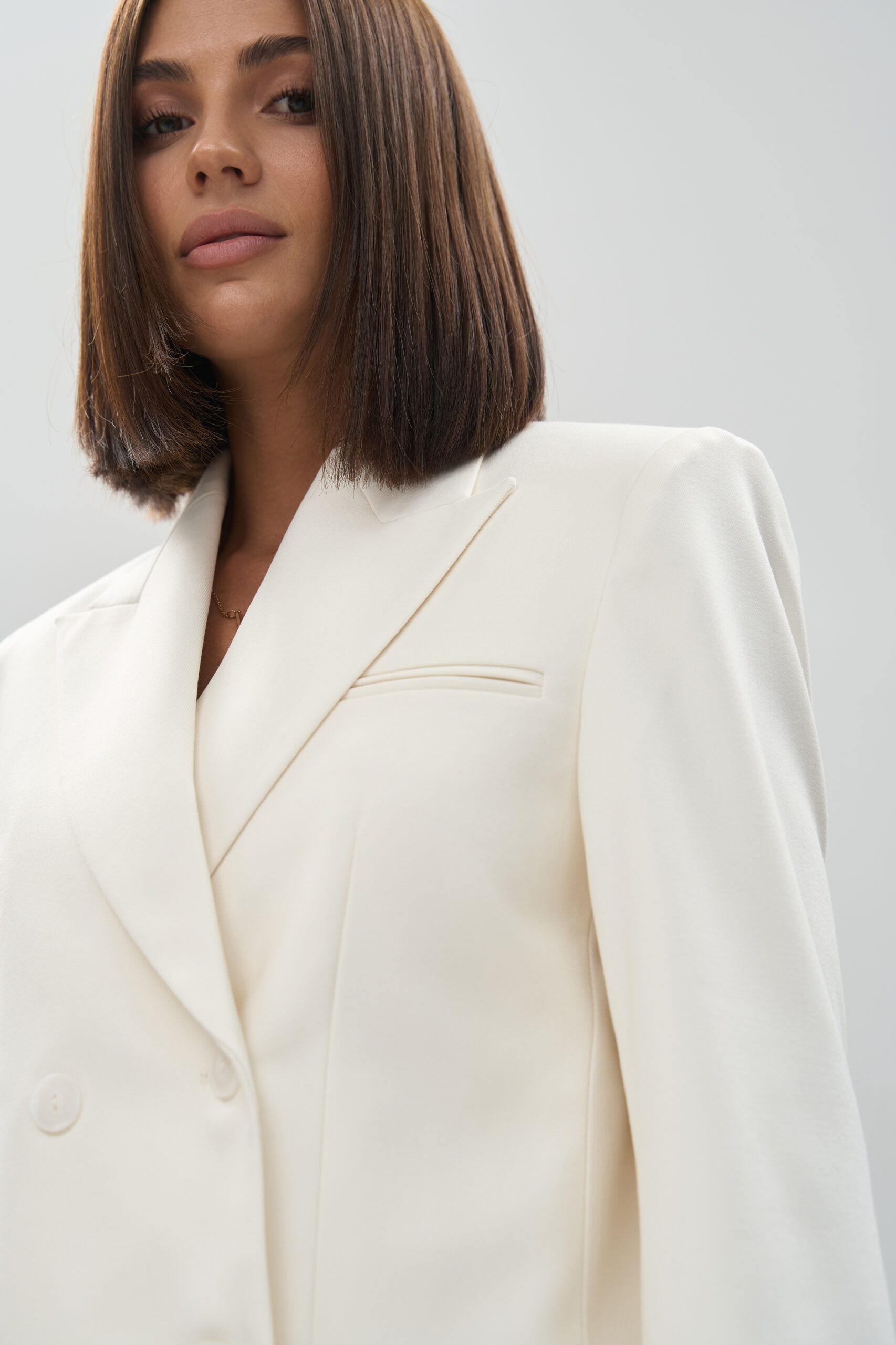 Відтінок молока — символ чистоти, легкості та універсальності. Він чудово поєднується з базовими кольорами (чорним, сірим, бежевим, коричневим) і водночас створює ніжний контраст із яскравими акцентами — смарагдовим, бордовим чи золотистим. Такий костюм стане ключовим елементом гардеробу на будь-який сезон.