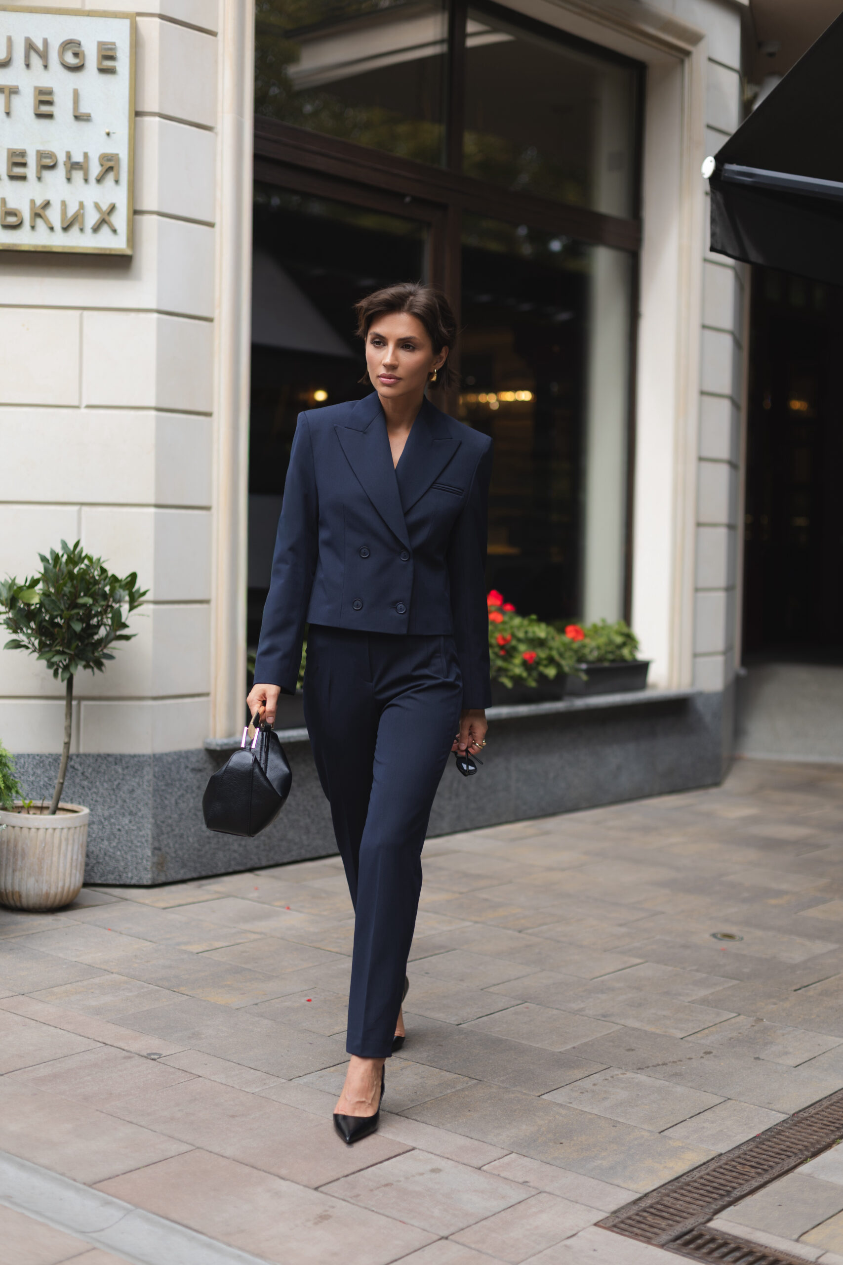 Піджак: вкорочений, прямого крою, однобортний із лаконічним коміром та відворотами. Структуровані плечі створюють чіткі лінії силуету. Одна внутрішня кишеня та декоративна нагрудна кишеня додають практичності та стилю.