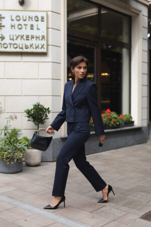 Жіночий костюм у синьому кольорі з вкороченим піджаком і завуженими штанами — стильна класика в сучасному виконанні