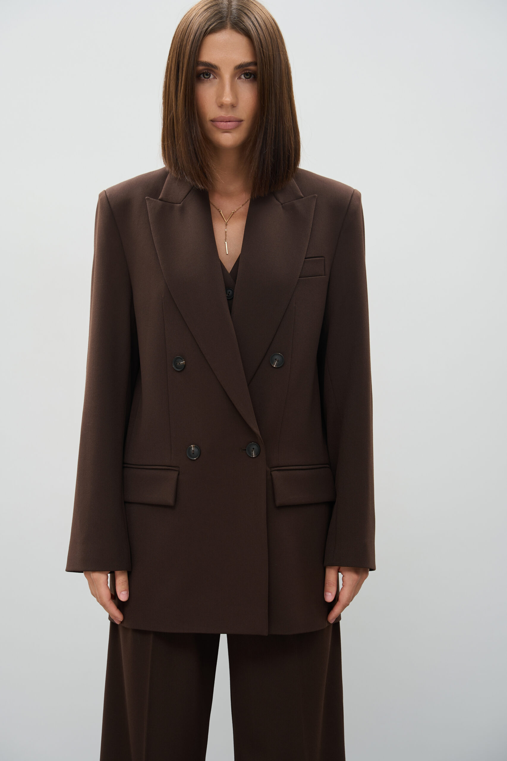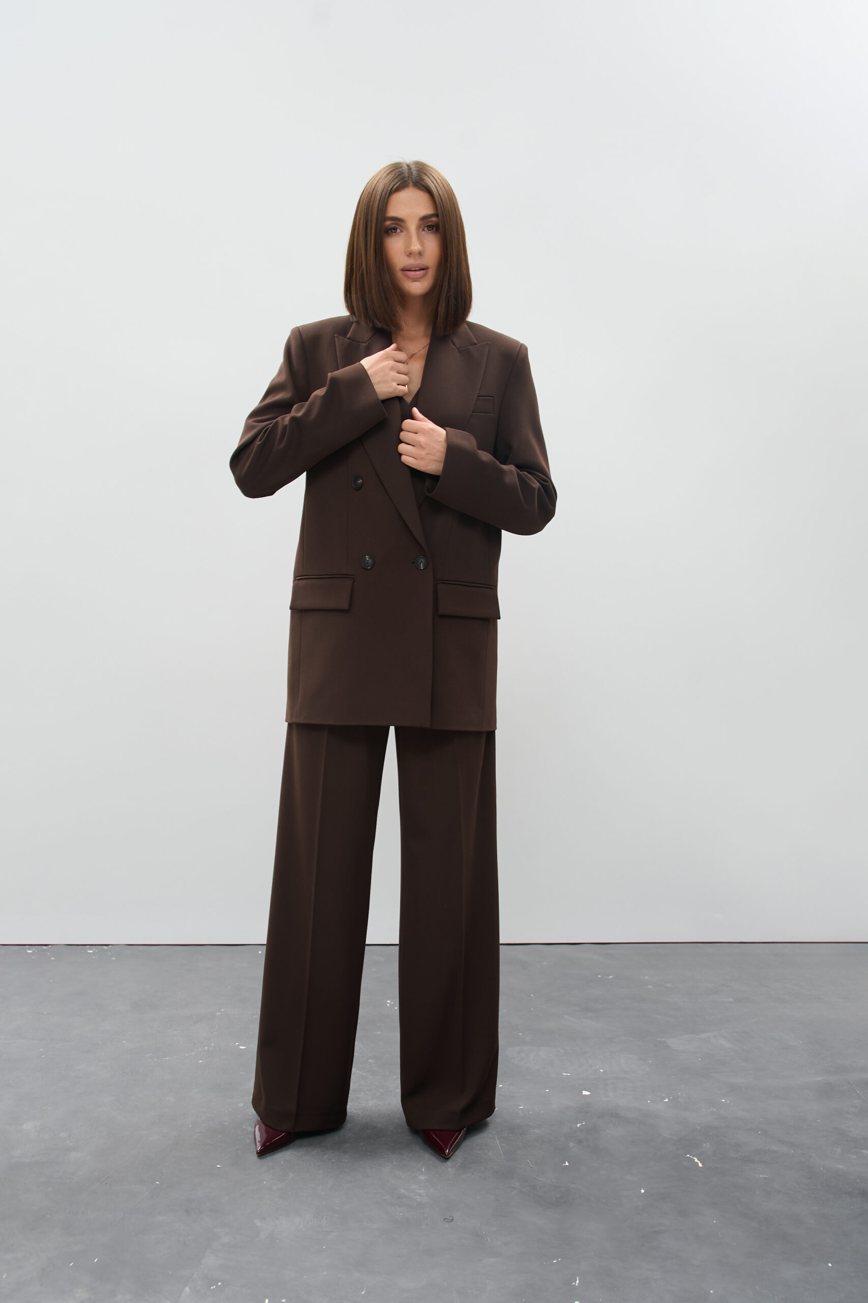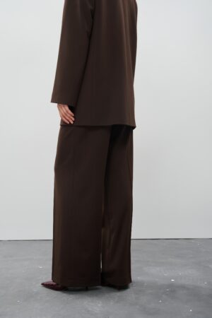 Жіночий шоколадний костюм з акцентними плечима та штанами палаццо — глибина кольору і сила силуету