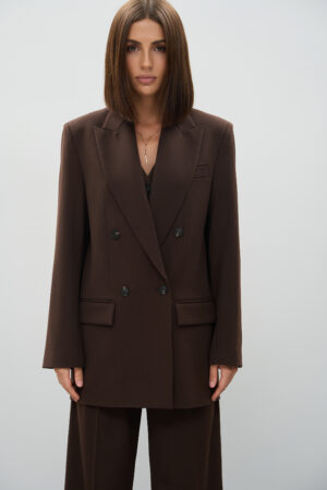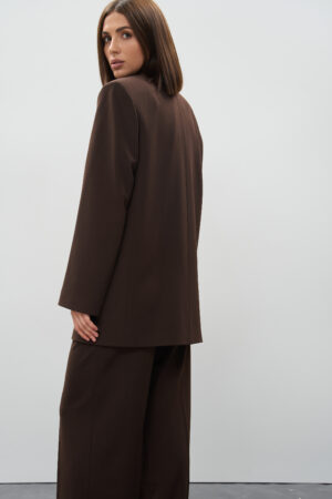Жіночий шоколадний костюм із піджаком з акцентними плечима та штанами палаццо — це інвестиція в елегантність, характер і сучасний стиль. Він легко адаптується під різні ситуації, залишаючись завжди актуальним і виразним.