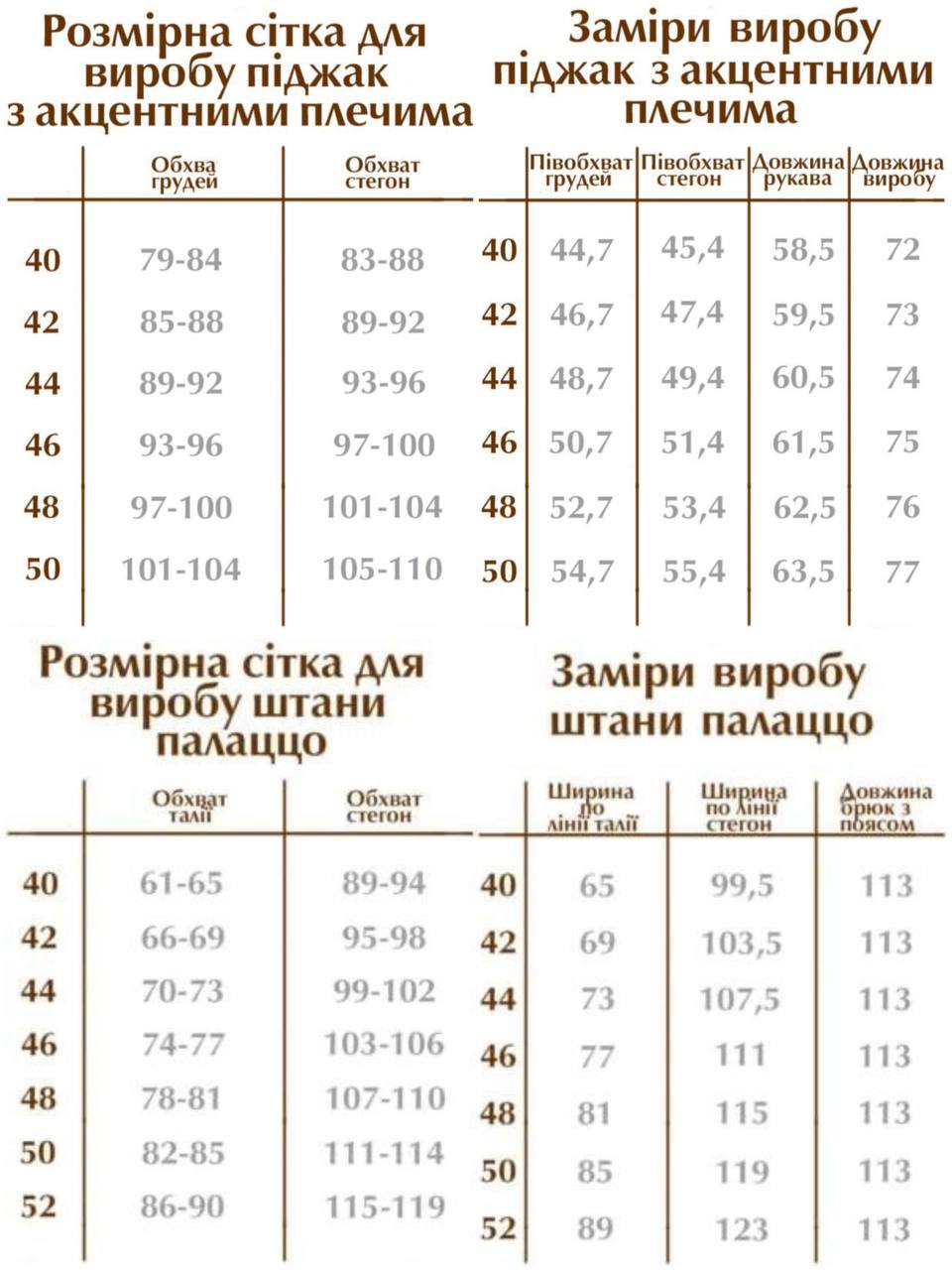 Костюм представлений у розмірах 40, 42, 44, 46, 48, 50, що дозволяє підібрати ідеальну посадку для різних типів фігури.