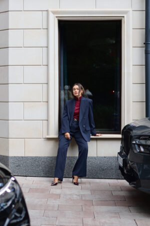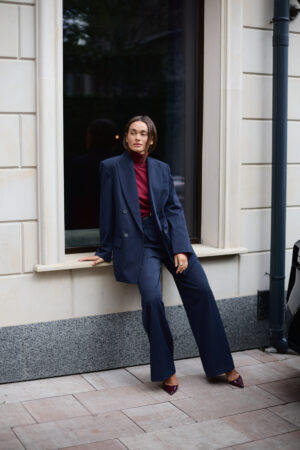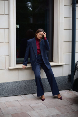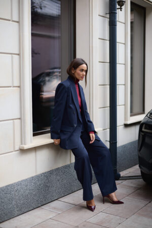 Жіночий синій костюм із піджаком з акцентними плечима та штанами палаццо — це інвестиція у впевненість, структуру й бездоганний стиль. Він працює на ваш імідж, допомагаючи створювати образи, що запам’ятовуються.
