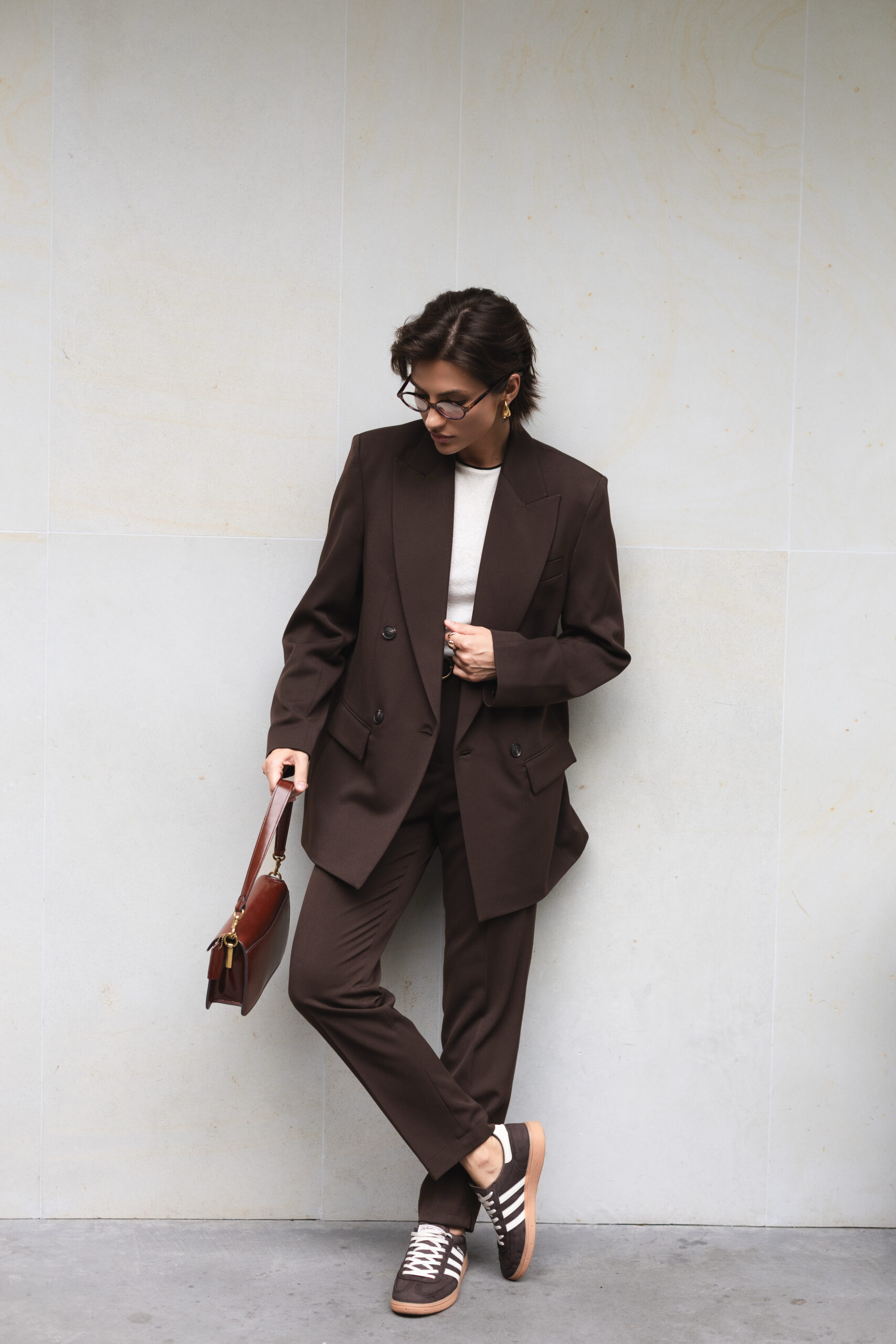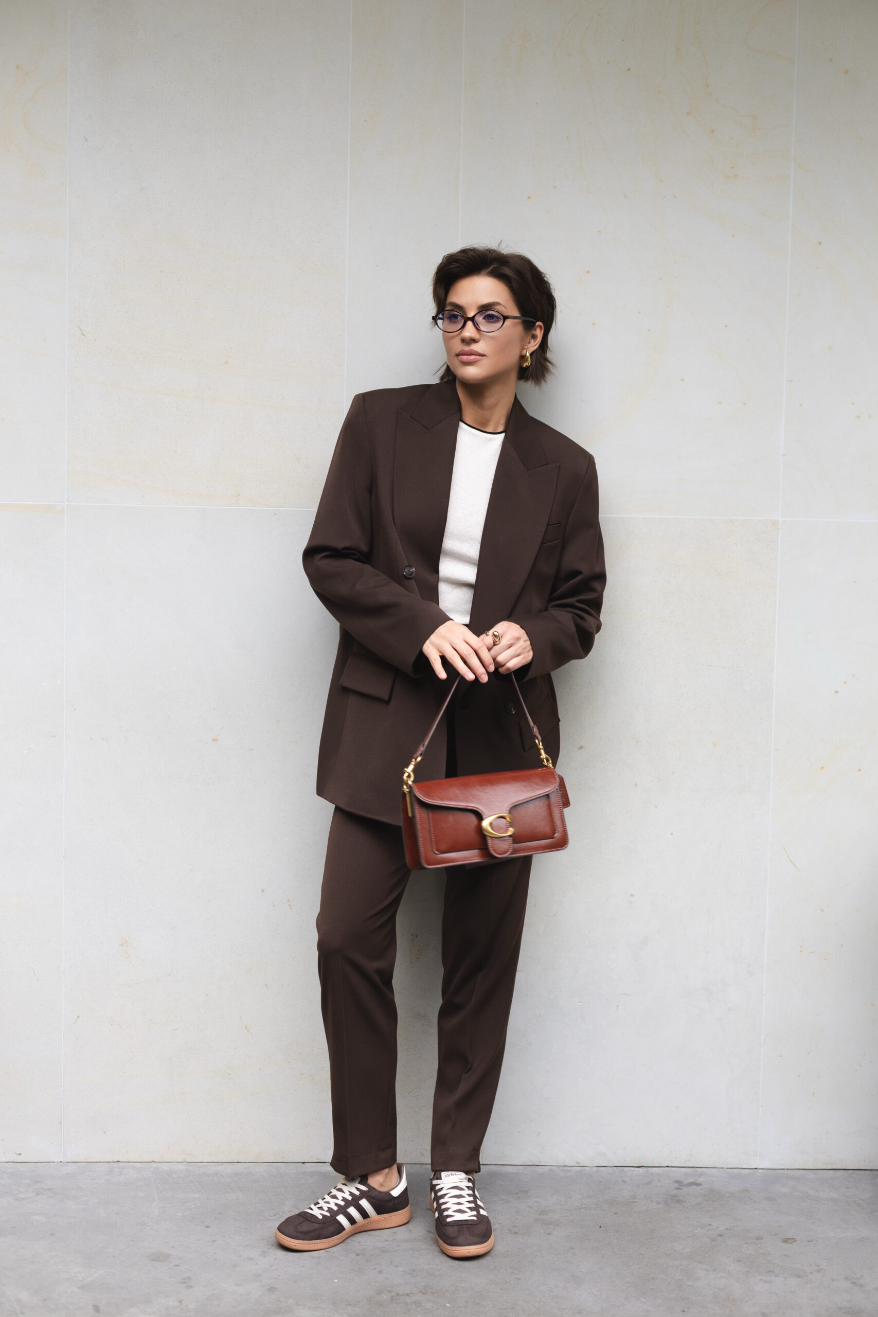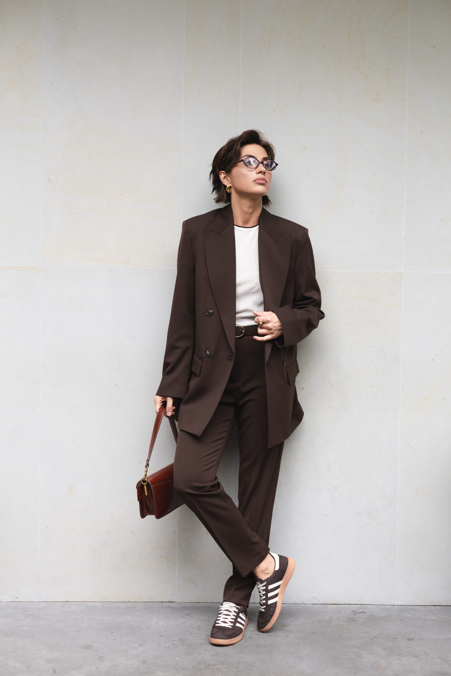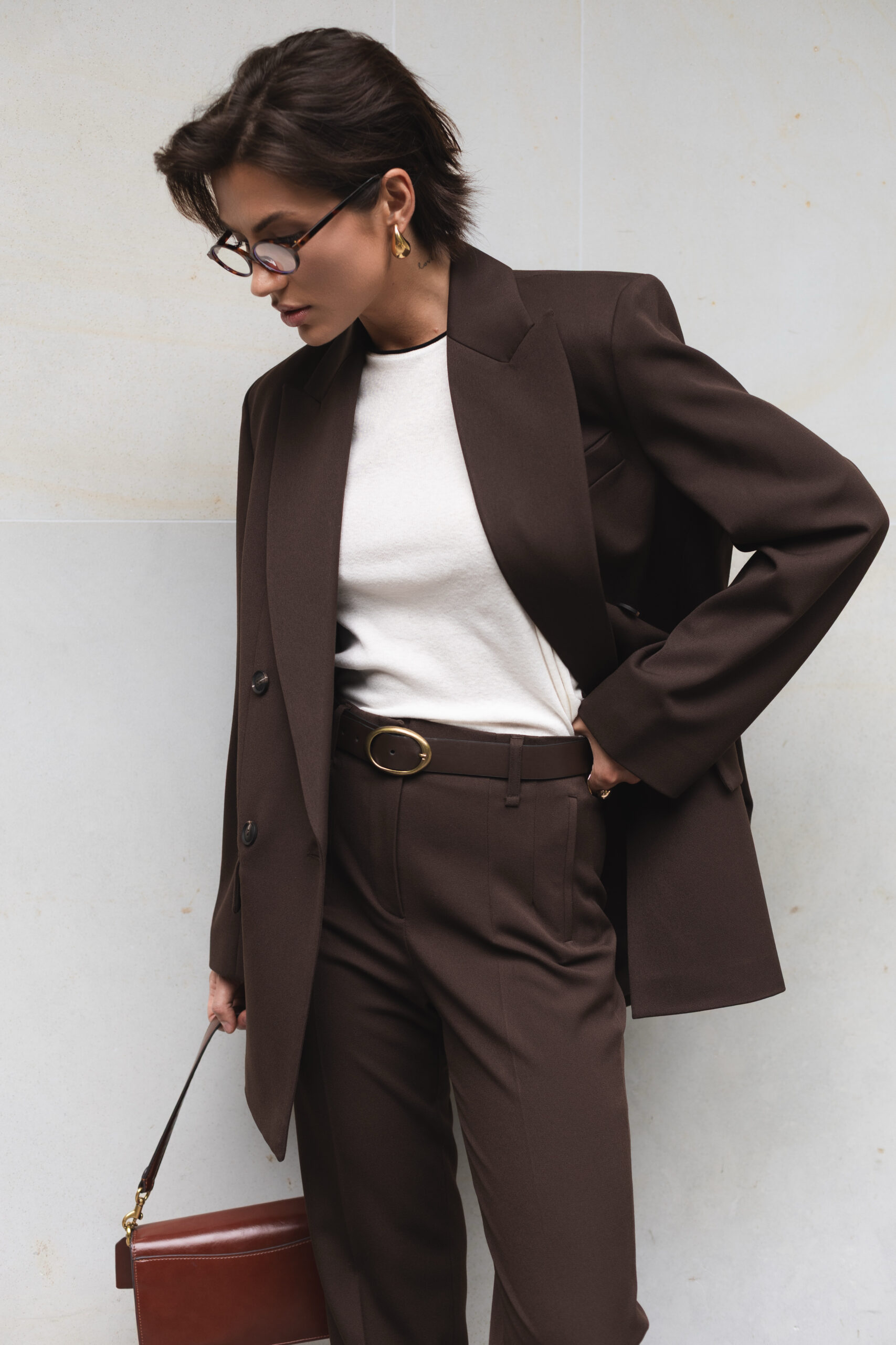 Шоколадний відтінок — теплий, глибокий і універсальний. Він чудово поєднується з білим, бежевим, чорним, сірим та пастельними кольорами, а також із яскравими акцентами — зеленим, бірюзовим чи золотистим. Такий колір підкреслює статусність і додає образу стриманої розкоші.