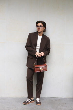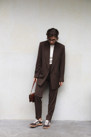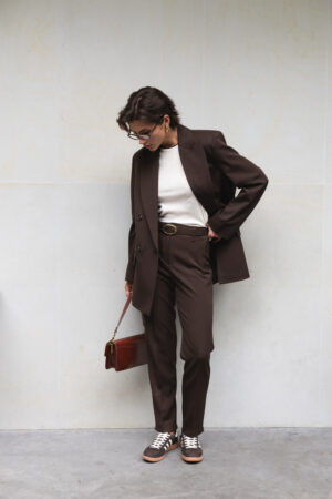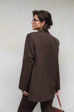 Жіночий костюм шоколадного кольору — це поєднання класики, елегантності та сучасного стилю. Він створений для тих, хто цінує витонченість, комфорт і впевненість у собі. Правильно скроєний піджак із акцентними плечима формує чітку лінію силуету, а завужені брюки з високою талією підкреслюють жіночність та додають гармонії образу.