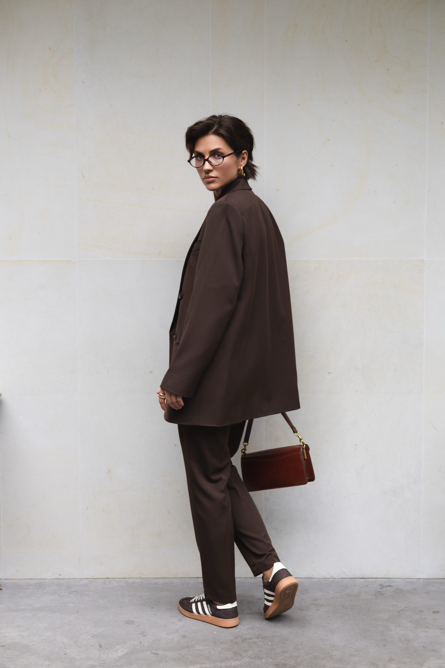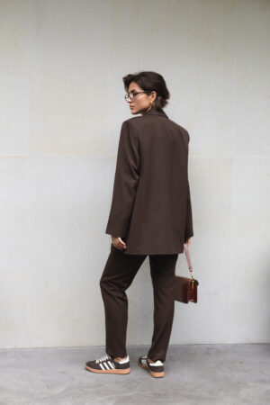 Жіночий костюм шоколадного кольору — піджак з акцентними плечима та завужені штани