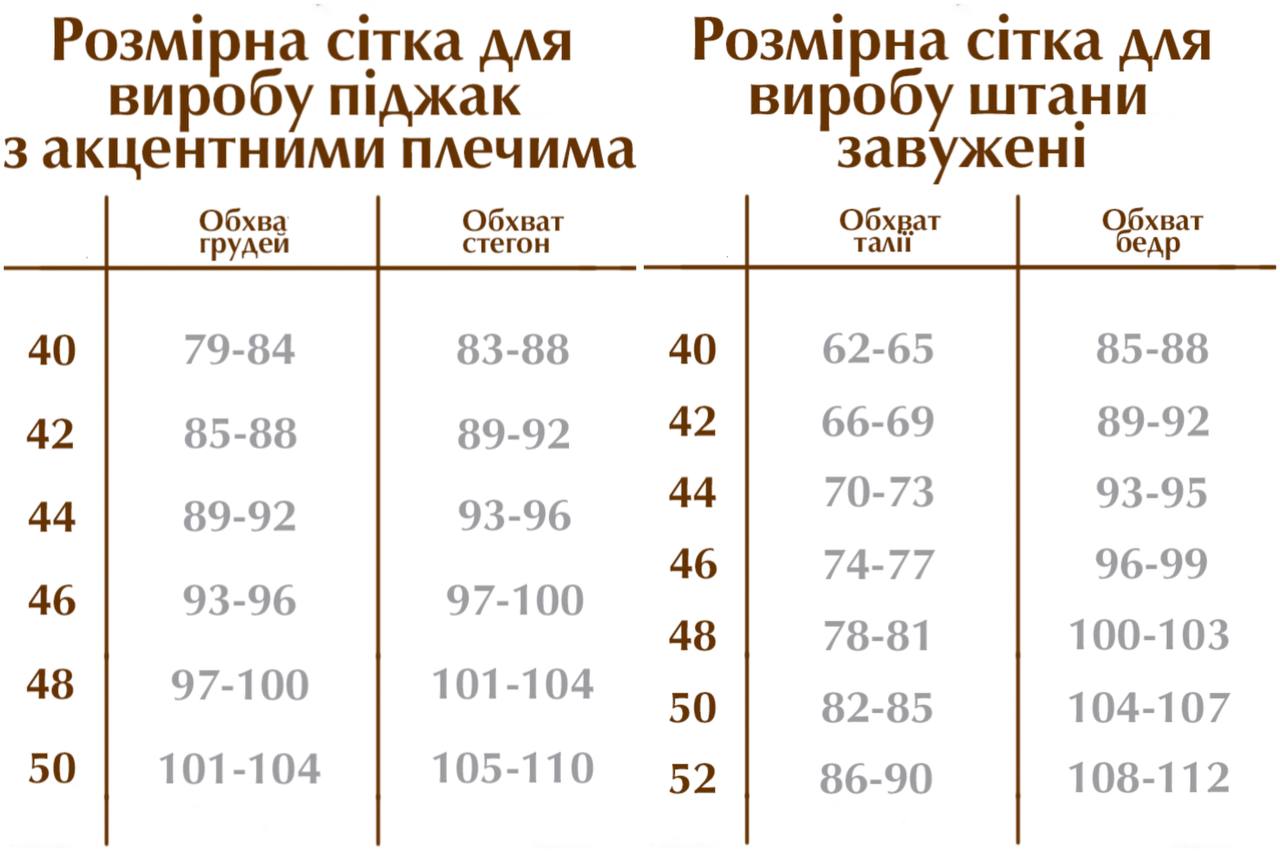 Костюм доступний у розмірах 40, 42, 44, 46, 48, 50, 52. Завдяки еластичній тканині та продуманому крою він ідеально сідає на різні типи фігур, залишаючись комфортним протягом дня.