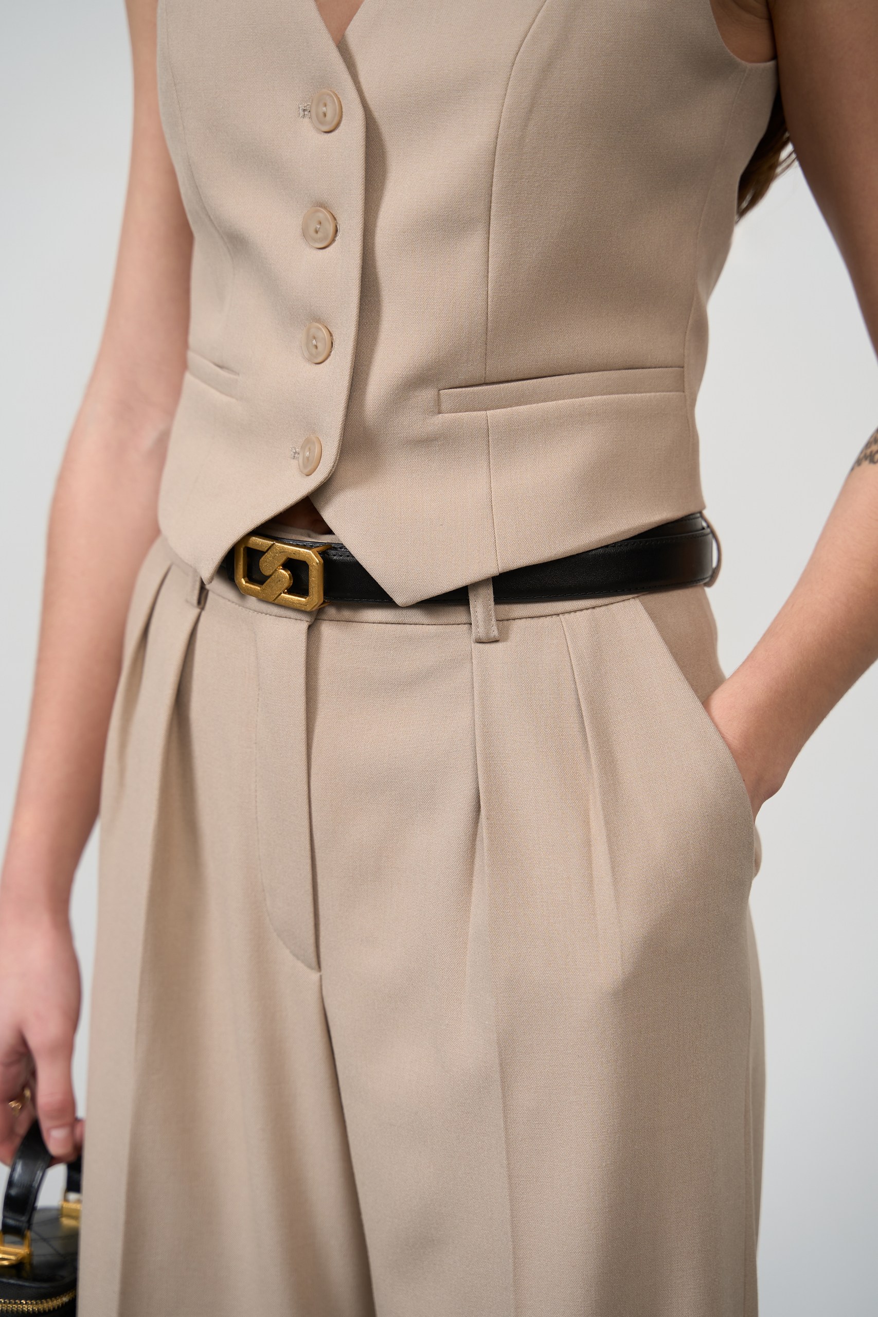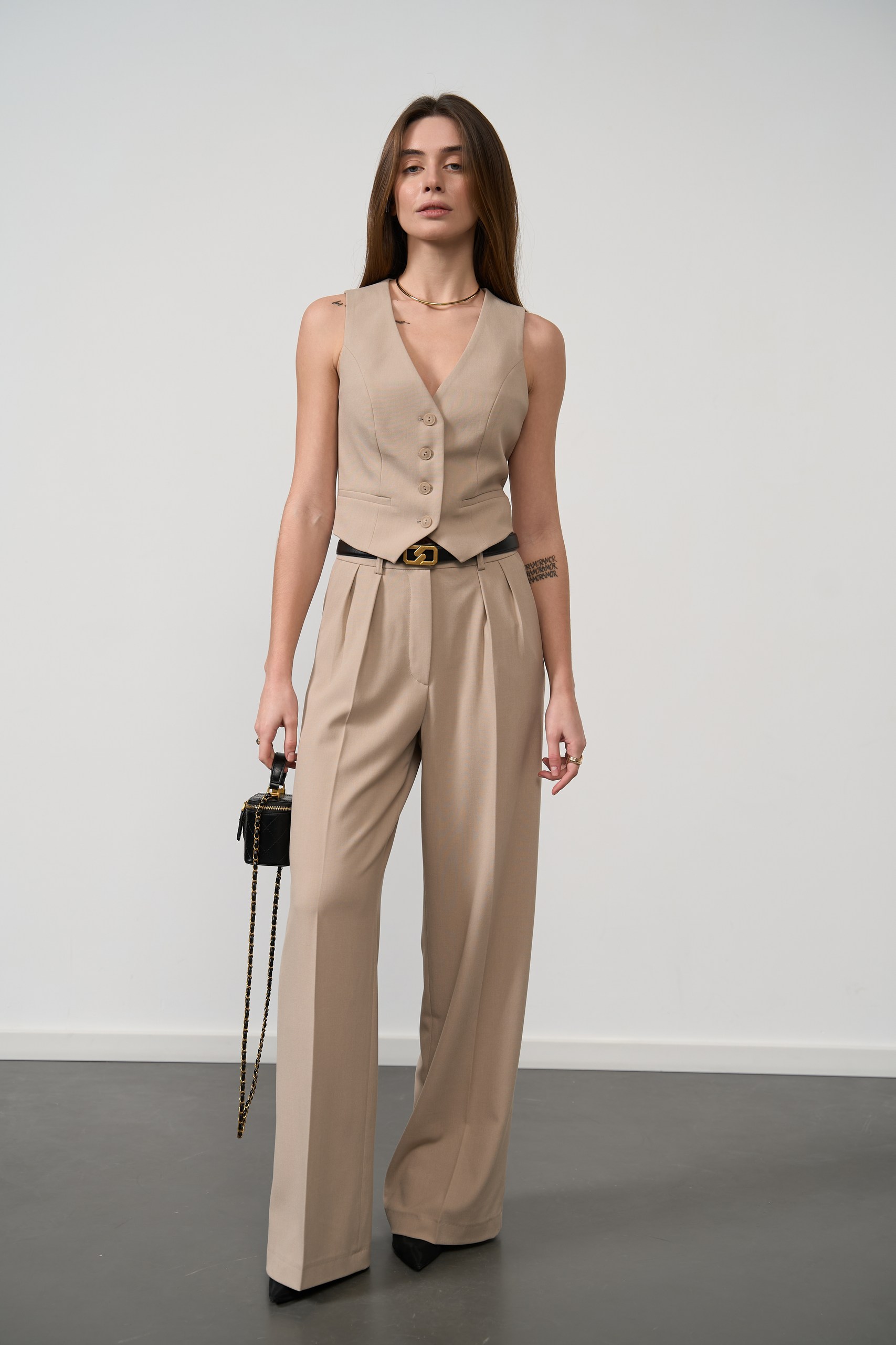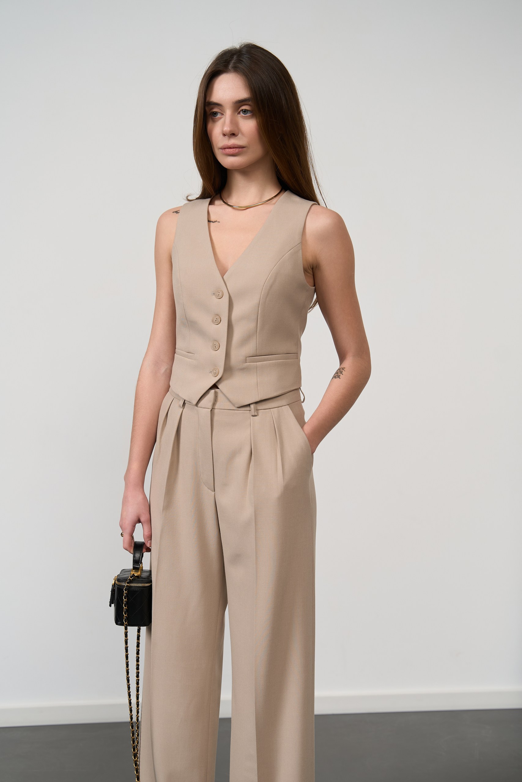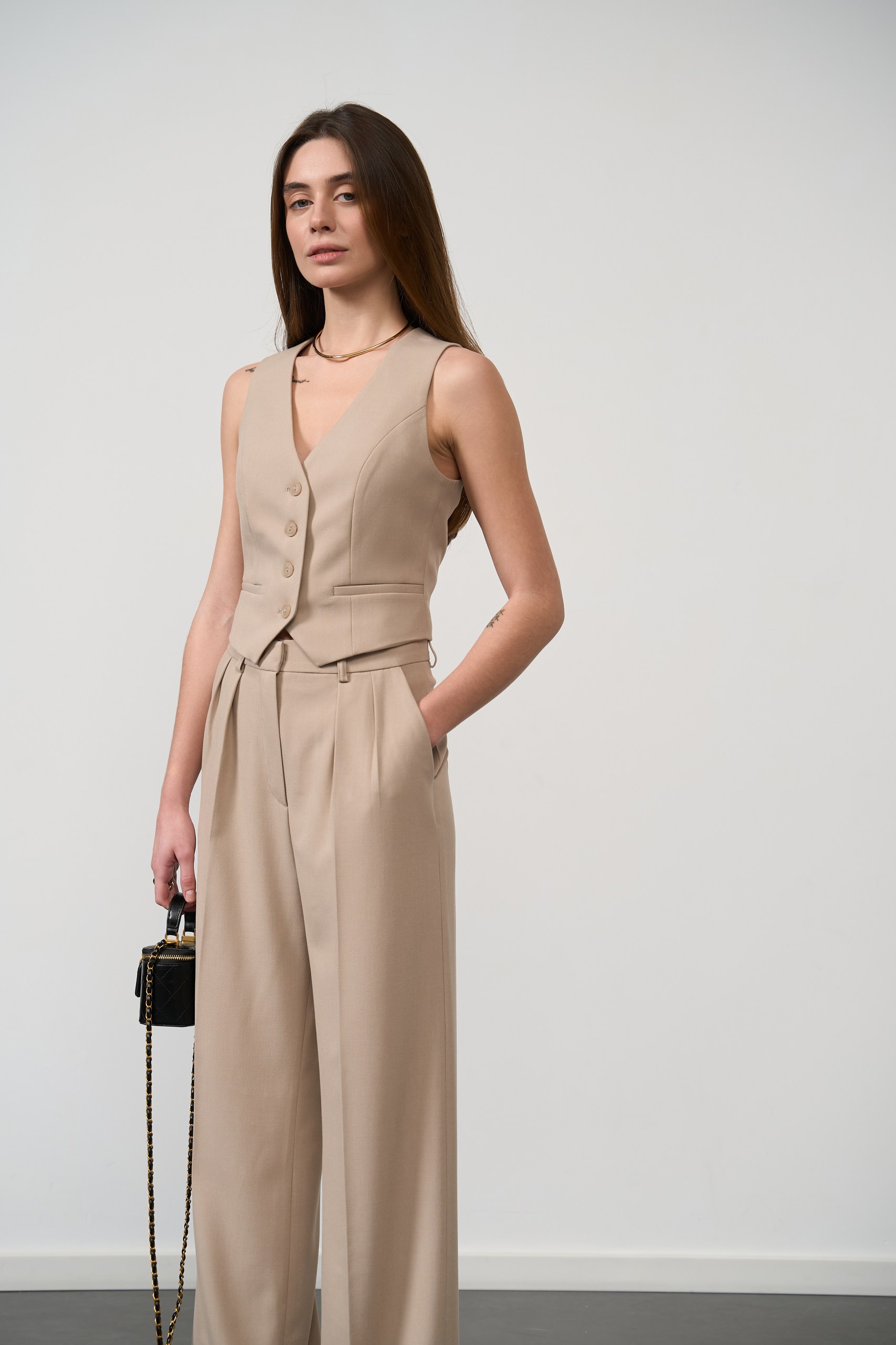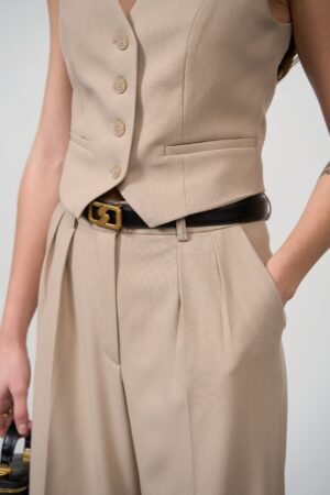 - Приталена жилетка: підкреслює талію та додає силуету витонченості. Жилетка має декоративні кишені, що надають образу стильних акцентів, і ідеально доповнює штани.