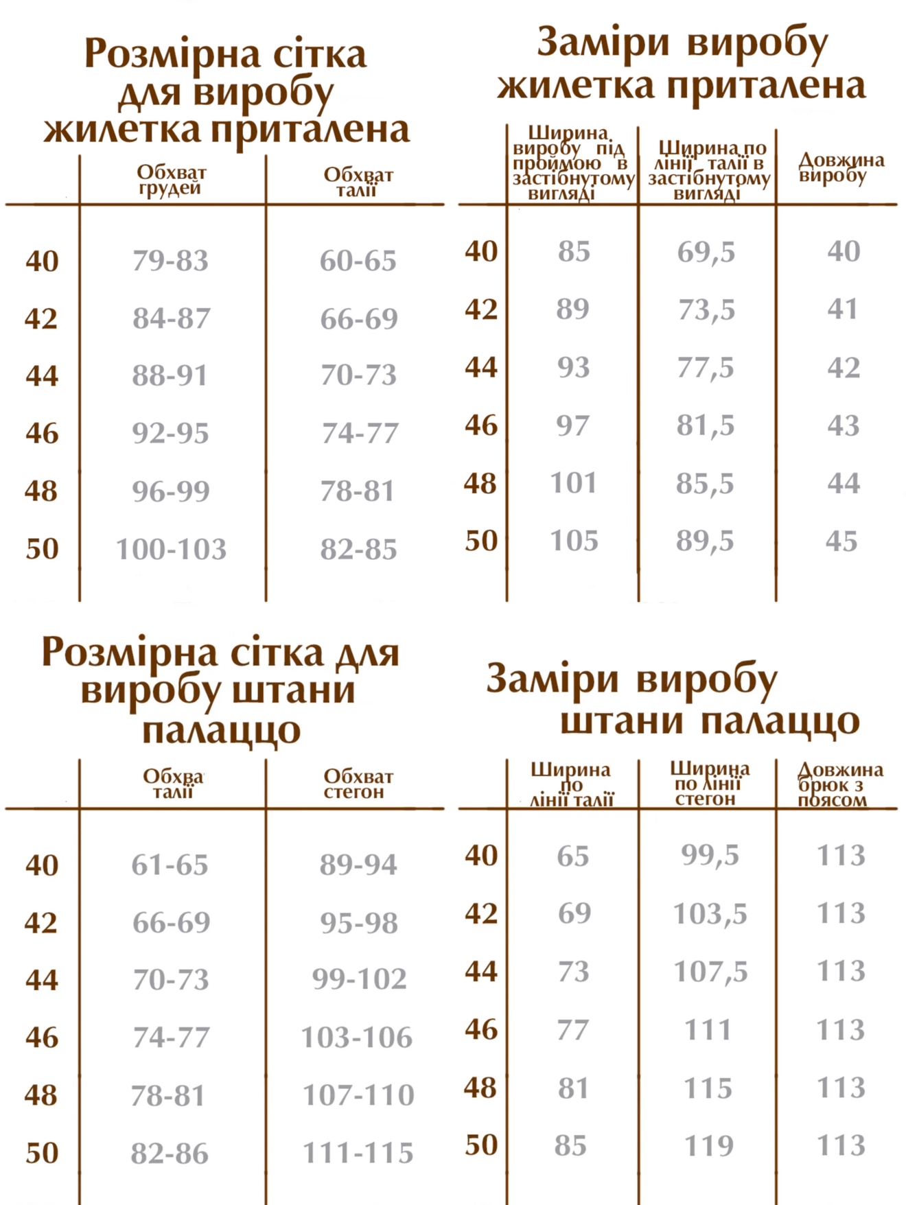 - Штани палаццо — у розмірах 40, 42, 44, 46, 48, 50.