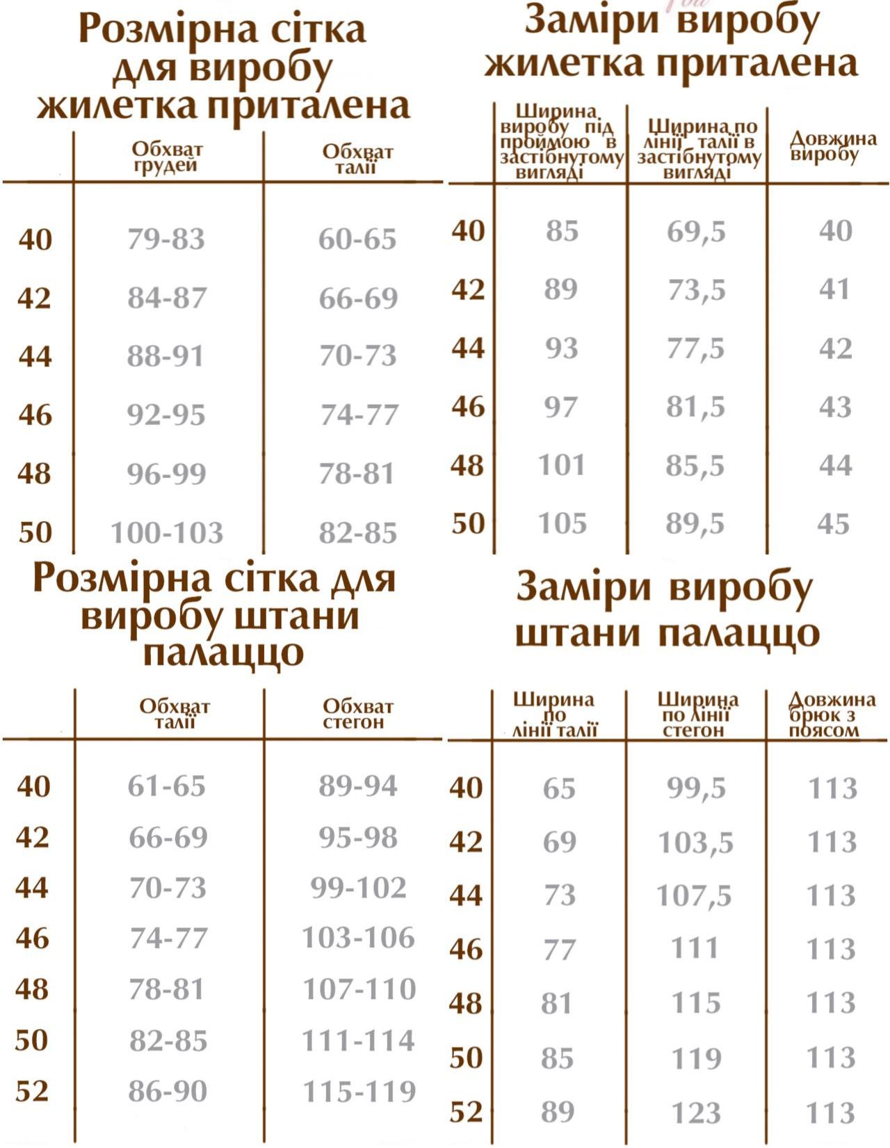 Штани палаццо: доступні в розмірах 40, 42, 44, 46, 48, 50, 52.