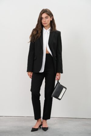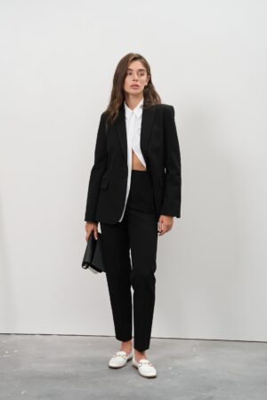 Представляємо вашій увазі елегантний жіночий костюм, що складається з класичного приталеного піджака та завужених штанів. Цей костюм створений для сучасних жінок, які цінують якість, стиль та комфорт у кожній деталі. Він ідеально підходить як для ділових зустрічей, так і для урочистих подій.