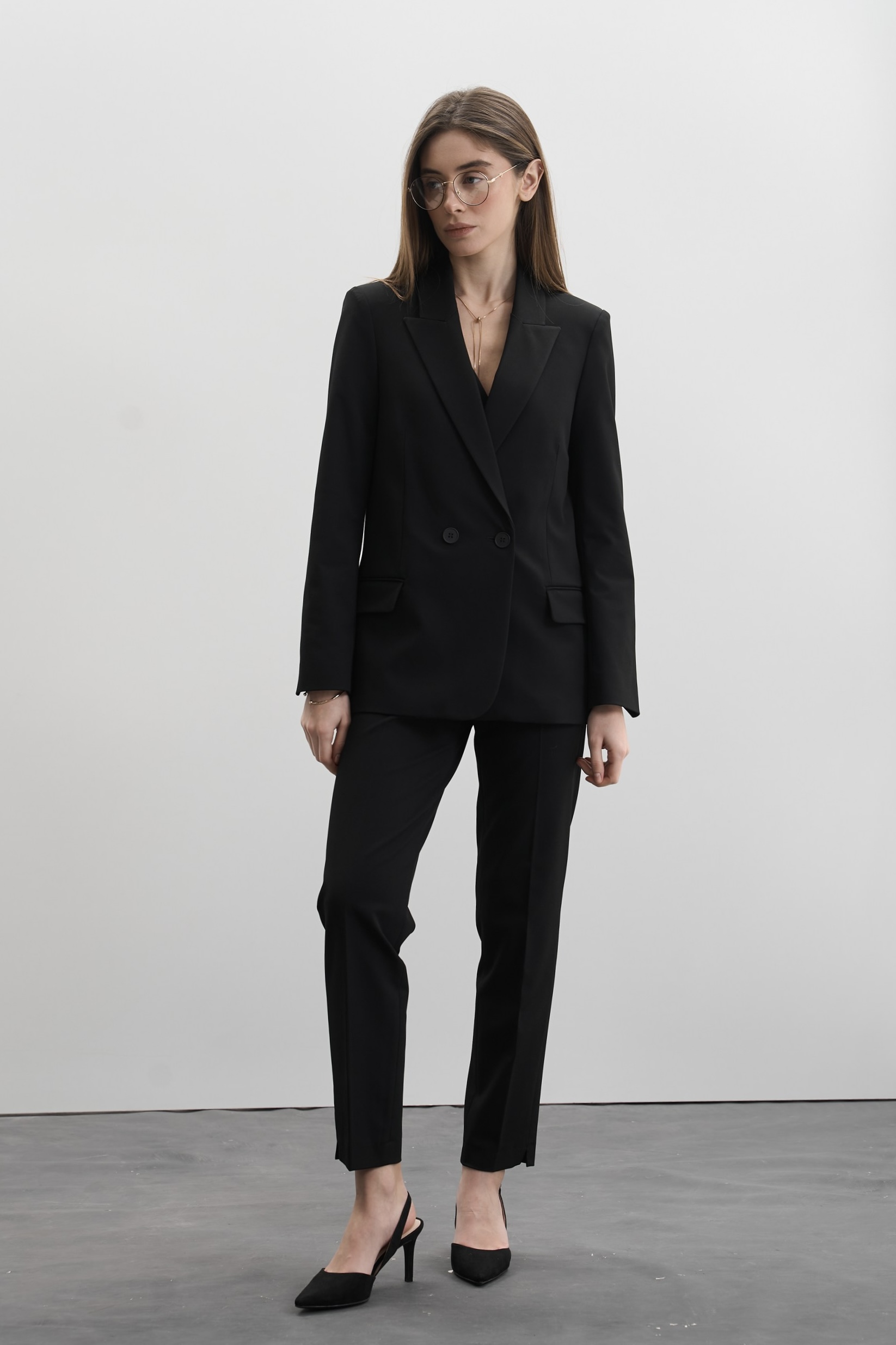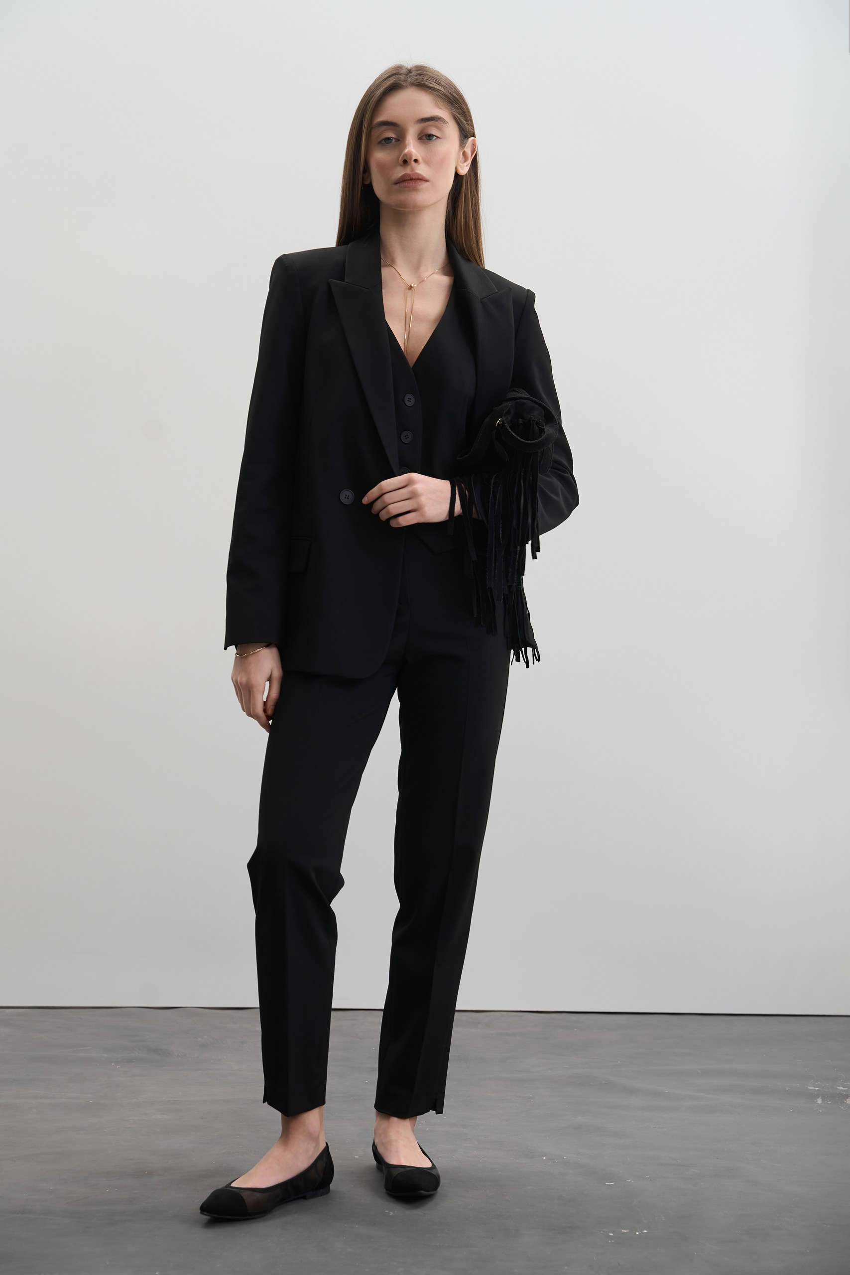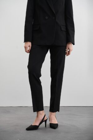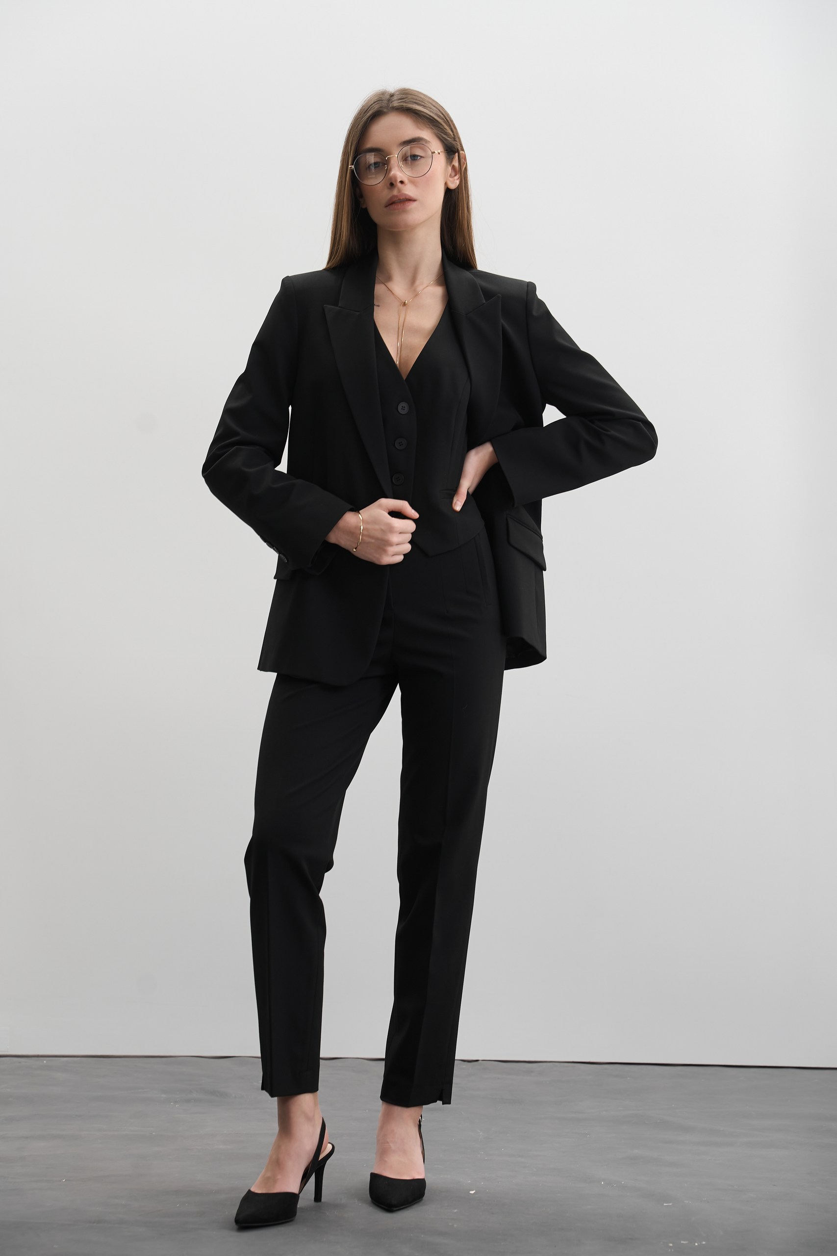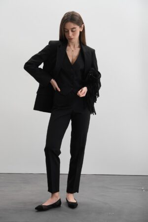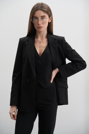 Крій костюма – класичний, злегка приталений двобортний піджак, який підкреслює жіночний силует, приталена жилетка і завужені штани, що додають стриманої ділової естетики. Костюм виконано в універсальному чорному кольорі, що є чудовою базою для створення як офіційних, так і повсякденних образів.