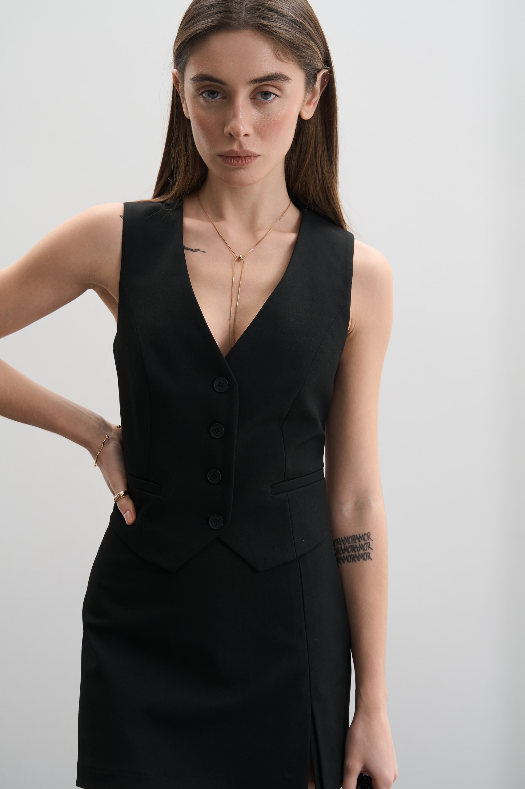 - Приталена жилетка акцентує увагу на талії, створюючи витончений силует.