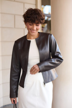 Жіноча куртка-бомбер з еко-шкіри у відтінку темний шоколад — це стильна та універсальна модель, яка поєднує сучасний дизайн, жіночний силует і практичність. Завдяки приталеному крою з акцентом на талії куртка красиво підкреслює фігуру, формуючи витончений та акуратний силует.