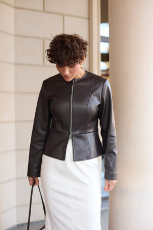 Куртка виконана з якісної еко-шкіри з гладкою текстурою та делікатним матовим блиском, що надає виробу сучасного вигляду.